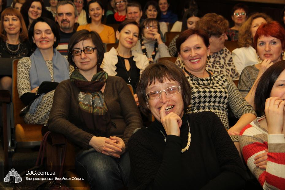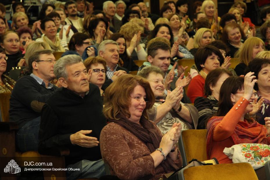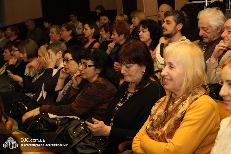 Литературный концерт прошел в зале «Синай» центра «Менора», но организатором его выступила днепропетровская «Арт-квартира», которая с удовольствием использует внешние залы для своих крупных мероприятий (концерт Губермана, например, проводился ими в консерватории). Литературный концерт был вполне ярким, красивым, добротным творческим вечером с историями, байками, анекдотами (в первоначальном смысле этого слова), рассказами о нелегком писательском ремесле и так далее. Жаль, что такой прекрасный жанр, как творческая встреча популярного писателя или артиста с провинциальной публикой (а что ни говори, Днепропетровск в отношении современного литературного и художественного процессов есть глубокая провинция, со всеми ее недостатками и достоинствами) стал редким, и многим, для кого этот жанр доставляет удовольствие, это недоступно. Даже на этой встрече с Диной Рубиной было немало свободных мест, и не потому что не хватило желающих пообщаться с писательницей, а потому что стоимость билетов для многих ее поклонников оказалась, к сожалению, неподъемной.
