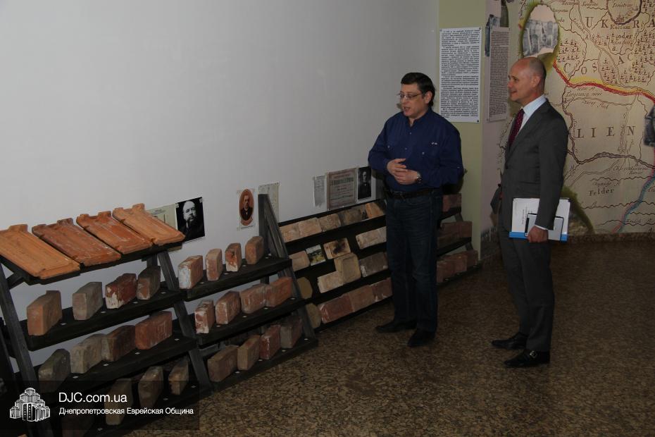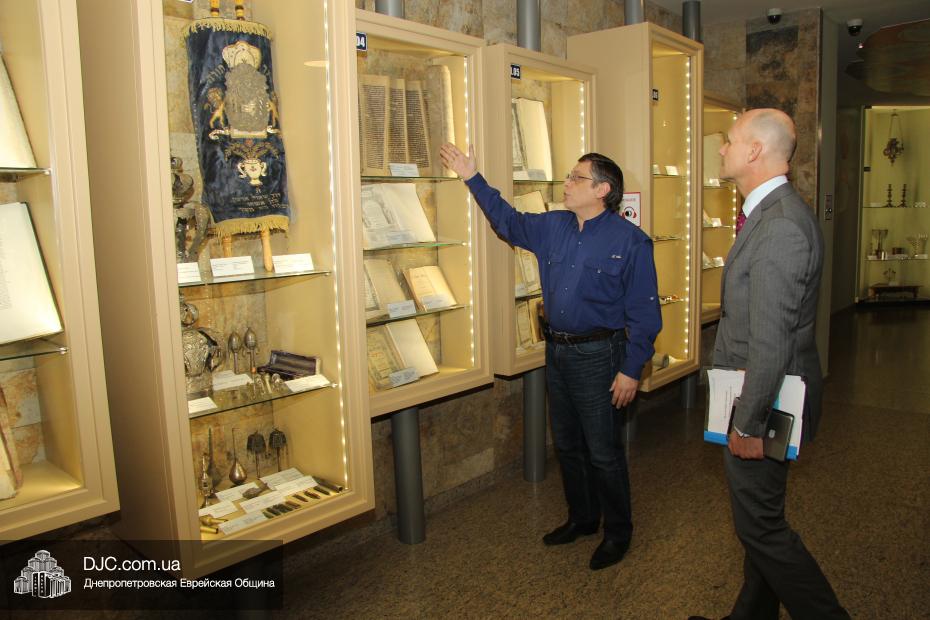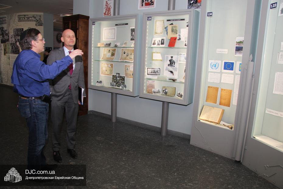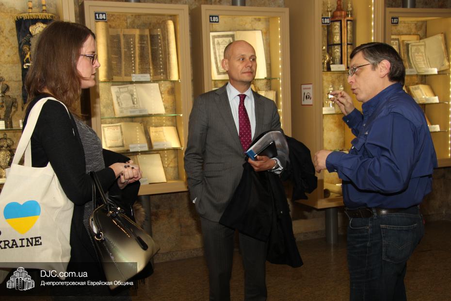 После встречи с Главным раввином Шмуэлем Каминецким дипломатическая миссия посетила музей «Память еврейского народа и Холокост в Украине». Обзорную экскурсию для гостей провел доктор Игорь Щупак, директор УИИХ «Ткума» и музея «Память еврейского народа и Холокост в Украине», который рассказал о концепции и структуре музея, представляющего как многообразие еврейской жизни в Украине до Второй Мировой войны, так и истоки процесса и последствия Холокоста, одной из величайших трагедий в истории человечества.