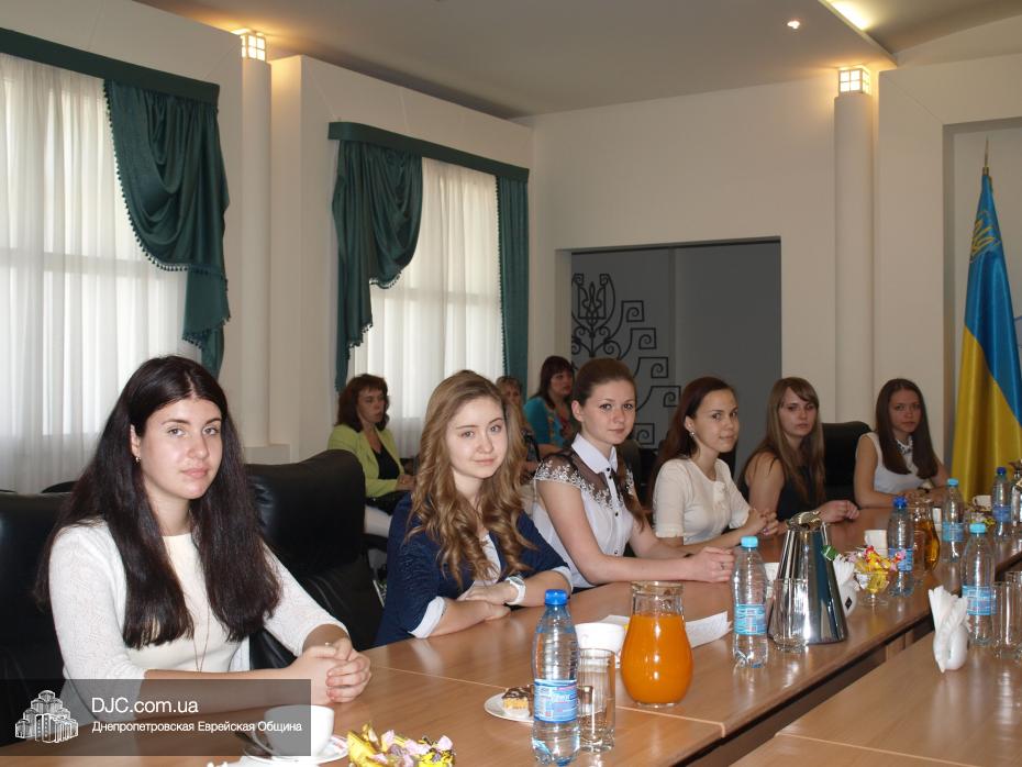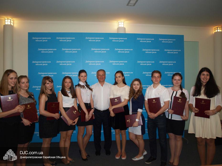 Городской голова вручил каждому победителю официальные благодарности от имени города и подарки – футболку, кепку и рюкзак с логотипом Днепропетровска. Елизавета Шварцман от имени всех победителей в ответ подарила мэру города картину Петриковской росписи, которую она создала самостоятельно.