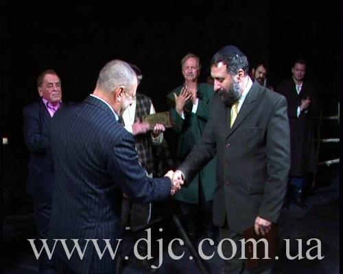 Затем Олег Ростовцев пригласил подняться на сцену меценатов проекта Леонида Лившица, Артура Золотаревского и Константина Таратуту и также вручил им памятные знаки со словами признательности и благодарности от имени еврейской общины. Константин Таратута, в свою очередь, вручил театру символ чистоты и распространения духовного света мира и добра – ханукальный светильник.