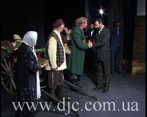Во время оваций после окончания спектакля (как всегда «Мир дому твоему» проходил при аншлаге и завершился овациями стоящих зрителей) на сцену поднялся член правления еврейской общины Олег Ростовцев, который объявил о решении общины вручить награды ведущим участникам проекта. Бурными рукоплесканиями зал встретил это известие и аплодисменты не смолкали, когда награды вручались народному артисту Украины Жану Мельникову, художественному руководителю театра, автору, режиссеру и исполнителю главной роли Тевье-молочника; народной артистке Украины Людмиле Вершининой, исполнительнице роли Голды; заслуженному артисту Украины Анатолию Дудко, исполнителю роли Степана-урядника и Леониду Фурсенко, директору академического театра русской драмы имени М. Горького.