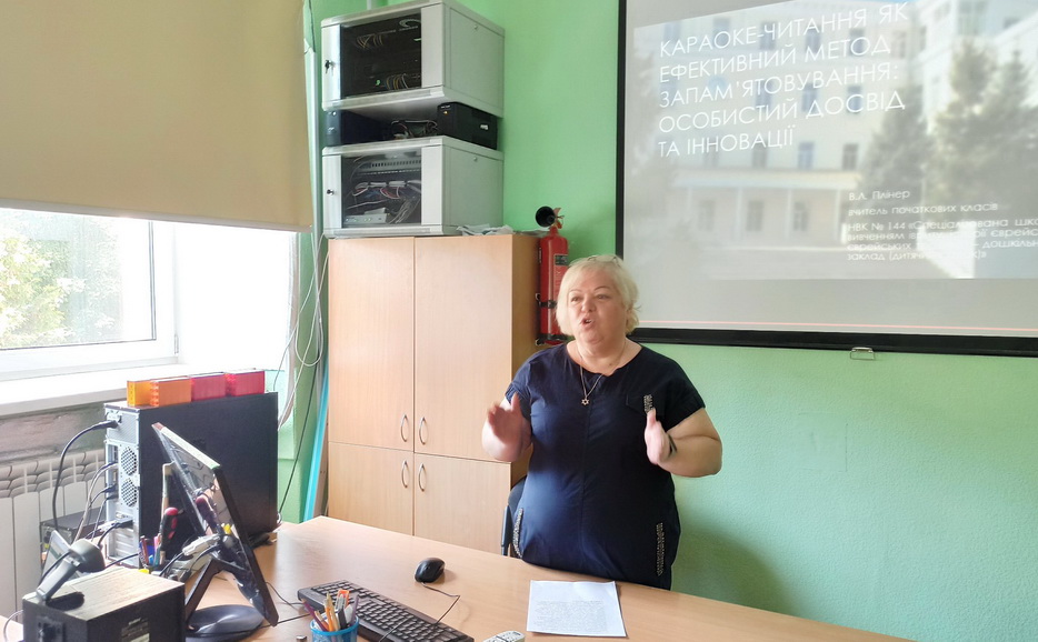 Например, уже с успехом прошло выступление нашого учителя начальных классов Виктории Плинер, получившее название «Караоке-читання як ефективний метод запам’ятовування: особистий досвід та інновації».