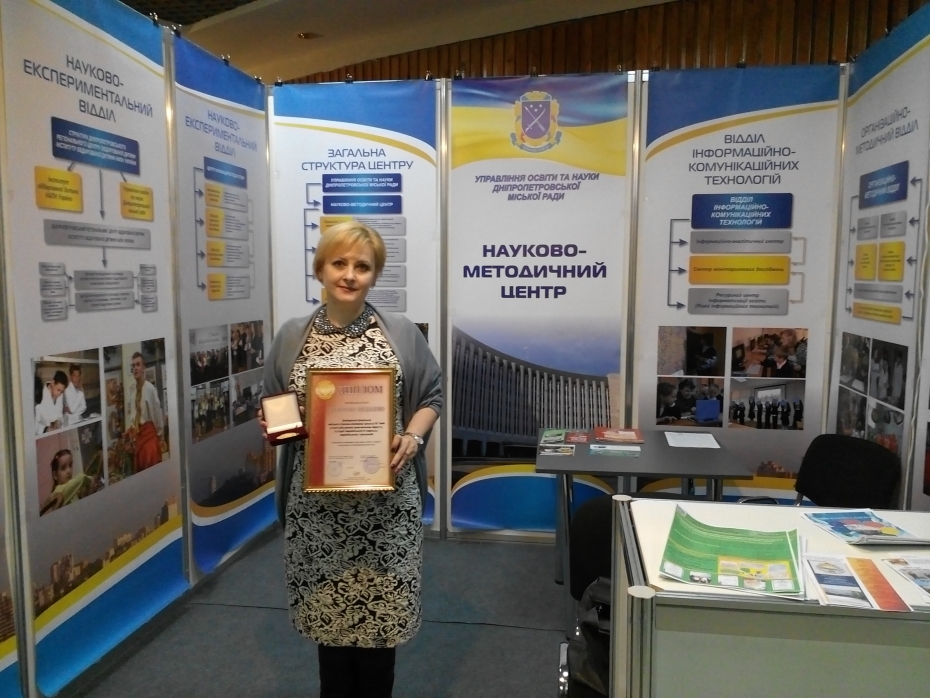 От имени еврейской школы в выставке участвовала заместитель директора по воспитательной работе Татьяна Хавкина, и представленная ею работа в категории «Інновації закладів освіти у роботі з молоддю в позанавчальний час» получила золотую медаль.