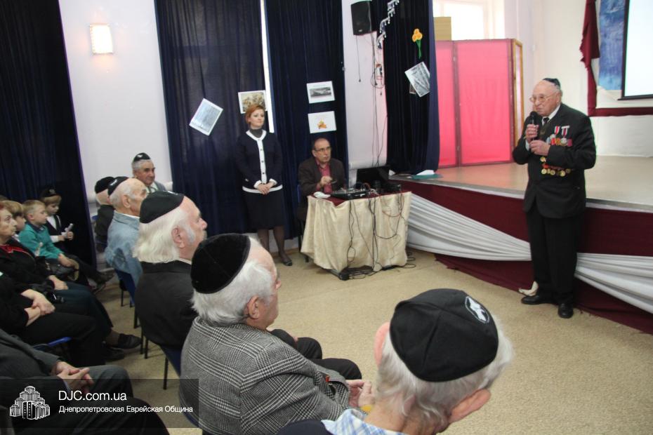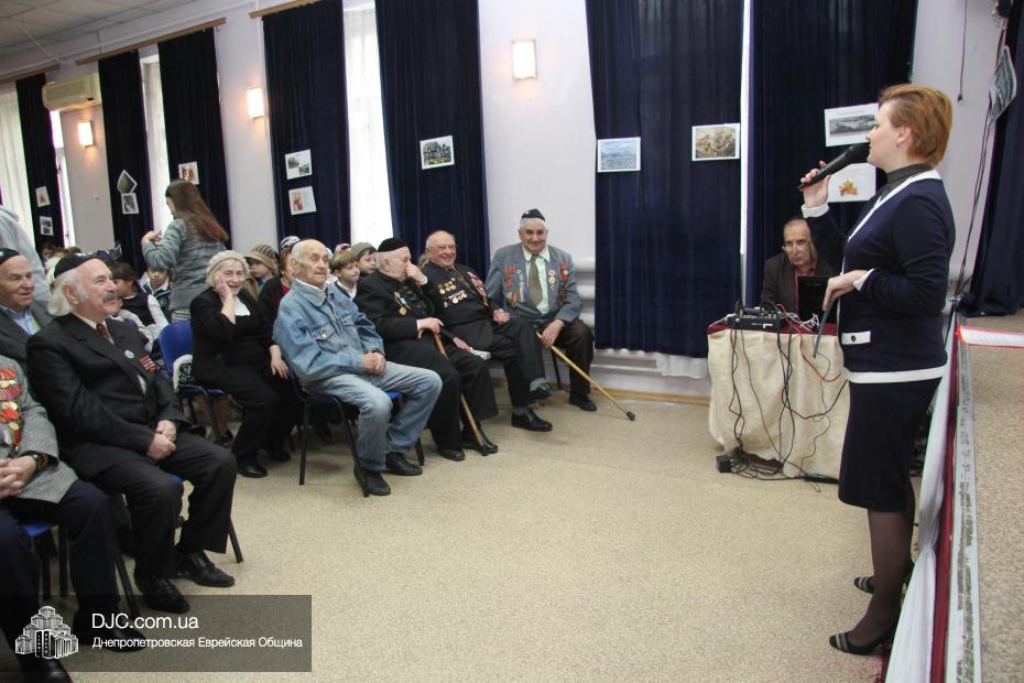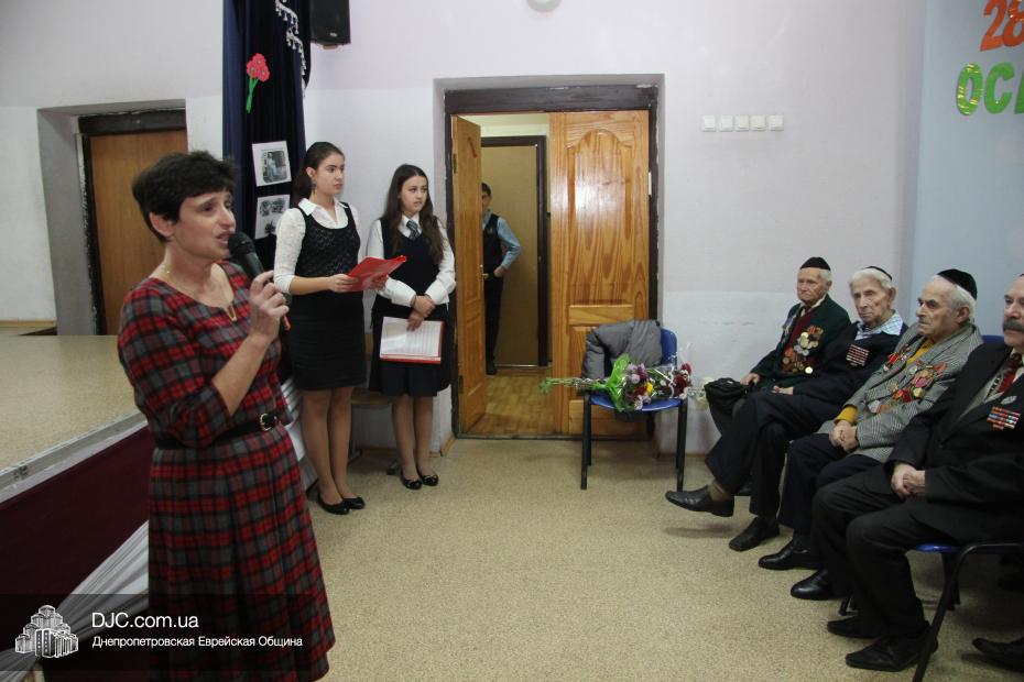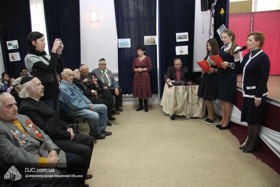 Перед началом концерта директор еврейской школы Елена Краснова приветствовала почетных гостей праздника: Соломона Киселевича Флакса, Владимира Абрамовича Рогового и его супругу Софью Шварц, Марка Львовича Гейдельберга, Давида Самойловича Яшунского, Михаила Ефимовича Кравинского, Давида Львовича Разу, Михаила Филипповича Поддубского, Анатолия Израилевича Биргера, Григория Яковлевича Сокольского, Кима Боруховича Садовского и его жену Лилию Садовскую. Директор школы от всего сердца поздравила ветеранов с праздничными датами и пожелала им – «людям, благодаря отваге, храбрости и мужеству которых враг был уничтожен» – долгих лет и крепкого здоровья.
