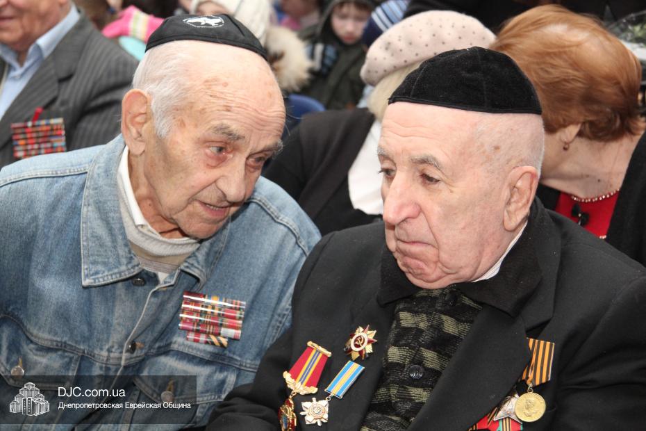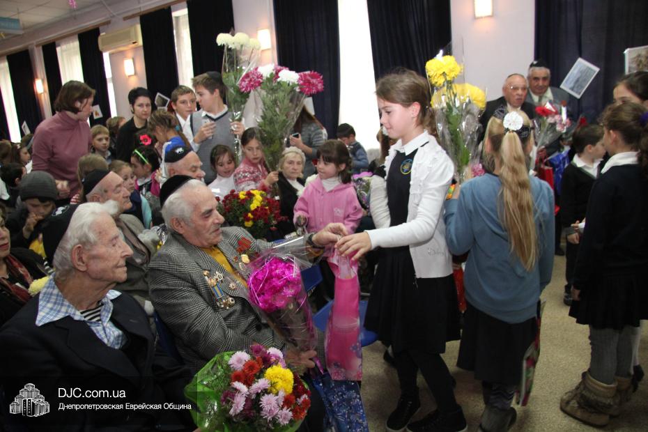 После концерта ученики младшей школы подарили своим гостям праздничные подарки – цветы, конфеты и вкусные кошерные булочки, испеченные работниками школьной столовой. В завершение всех ветеранов пригласили принять участие в коллективном фотографировании на память о празднике в еврейской школе, посвященном двум великим победам в истории Отечественной Войны – освобождению города на Днепре и окончательному изгнанию нацистов с земли Украины.