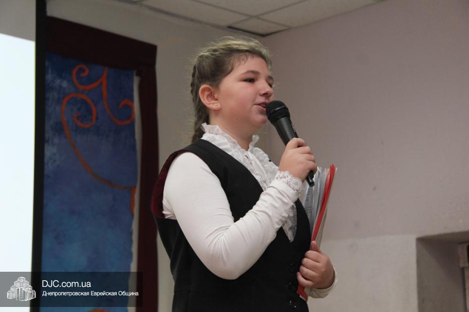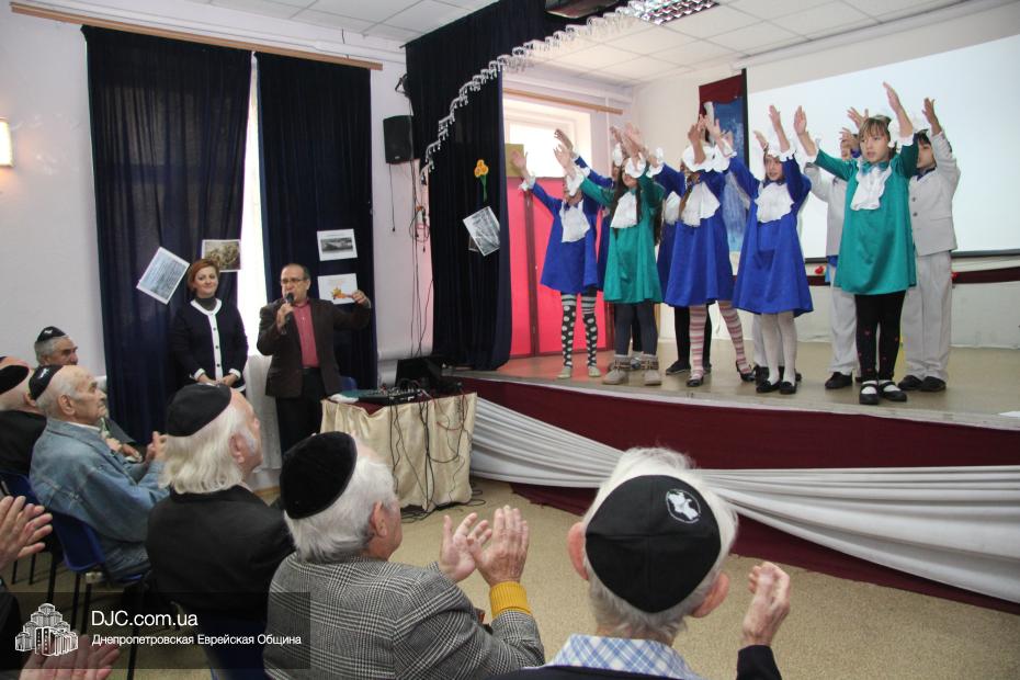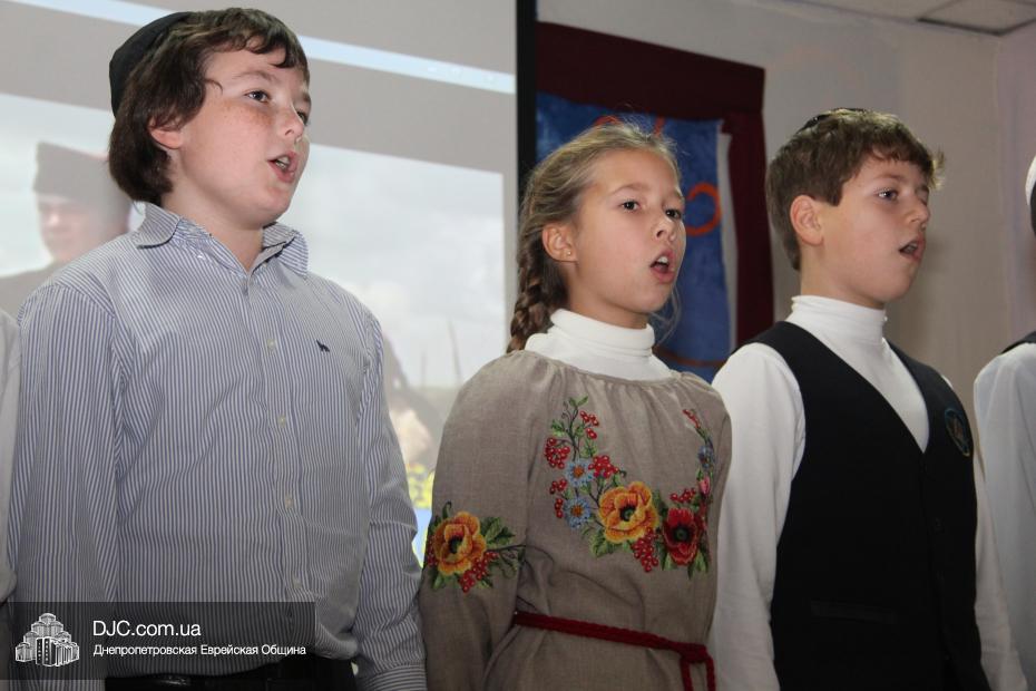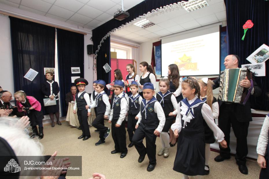 Для ветеранов еврейские школьники подготовили концертные номера, основой которых стали известные песенные композиции – о войне, героических подвигах, настоящей преданной дружбе и о никогда неугасаемой памяти о событиях и потерях военных лет, а также о родном городе – Днепропетровске, который был освобожден от нацистских оккупантов 25 октября 1943 года. Так, в исполнении ученицы 5-Б класса Виктории Дубовой прозвучала песня «Птицы белые летели» (муз. С. Ранда, сл. В. Редкозубов), ансамбль мальчиков исполнил «Старую солдатскую песню» Булата Окуджавы, ну а вокальный коллектив девочек выступил с композицией «Памяти героев Днепра», посвященной воинам, принимавшим участие в великой битве за Днепр.