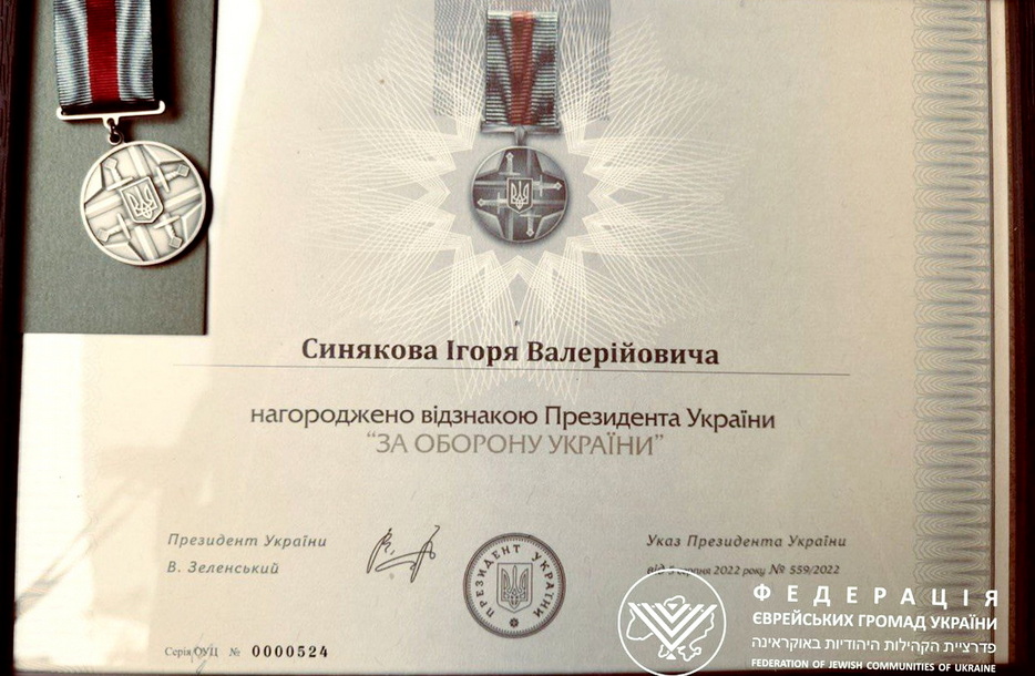 Капеллану Федерации еврейских общин Украины Якову Синякову была торжественно вручена медаль «За оборону України», которой он был награжден Указом президента страны.