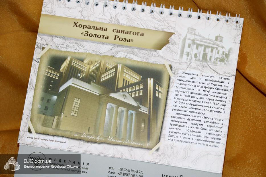 К сожалению, наш сайт вынужден отметить, что в украинскую версию настольного еврейского календаря ФЕОУ вкралась серьезная смысловая ошибка, относящаяся к нашему городу. Наша центральная синагога названа в календаре не так, как ее положено называть на украинском языке «Золота Троянда», а калькировано с российского «Золота Роза». Это очень обидно, ибо чтобы подчеркнуть, что наша синагога названа в честь цветка, перед входом в главный молитвенный зал установлена скульптурная композиция работы Френка Мейслера, представляющая именно золотой цветок из семейства Rosaceae. Однако, наше глубокое огорчение от этой ошибки не может испортить огромную радость от того, что Федерация еврейских общин Украины выпустила настоящий украинский еврейский календарь, как по содержанию, так и по форме.