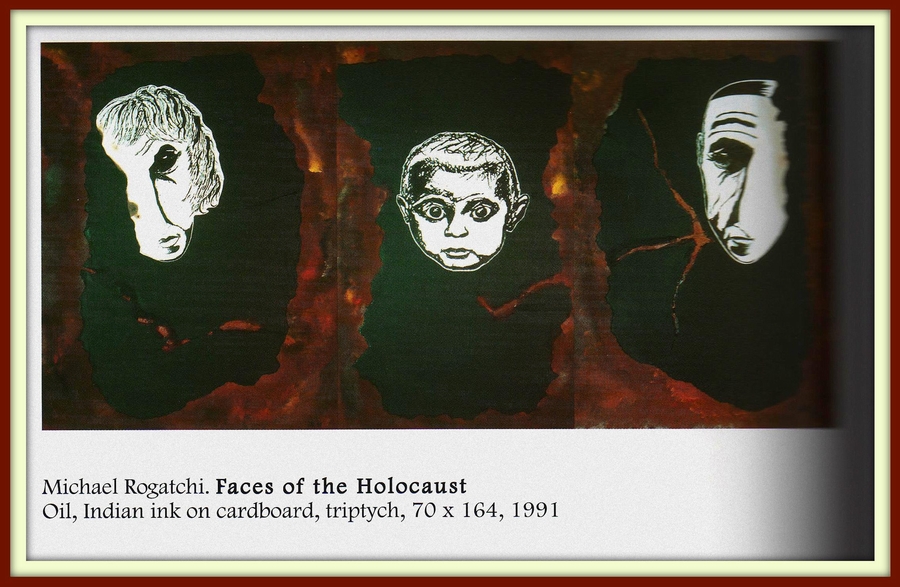 Триптих «Лица Холокоста» был создан в 1991 году и стал одной из первых и ключевых работ Михаила Рогачий в его всемирно известной серии, повествующей о самой страшной трагедии в истории еврейского народа. Мастер посвятил свою работу всем евреям, а также памяти членов семей Литовских-Рейс-Рогачий и Чигринских-Елович-Буяновер.