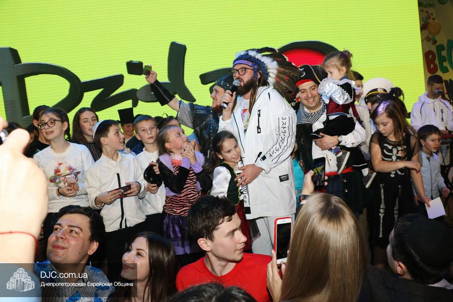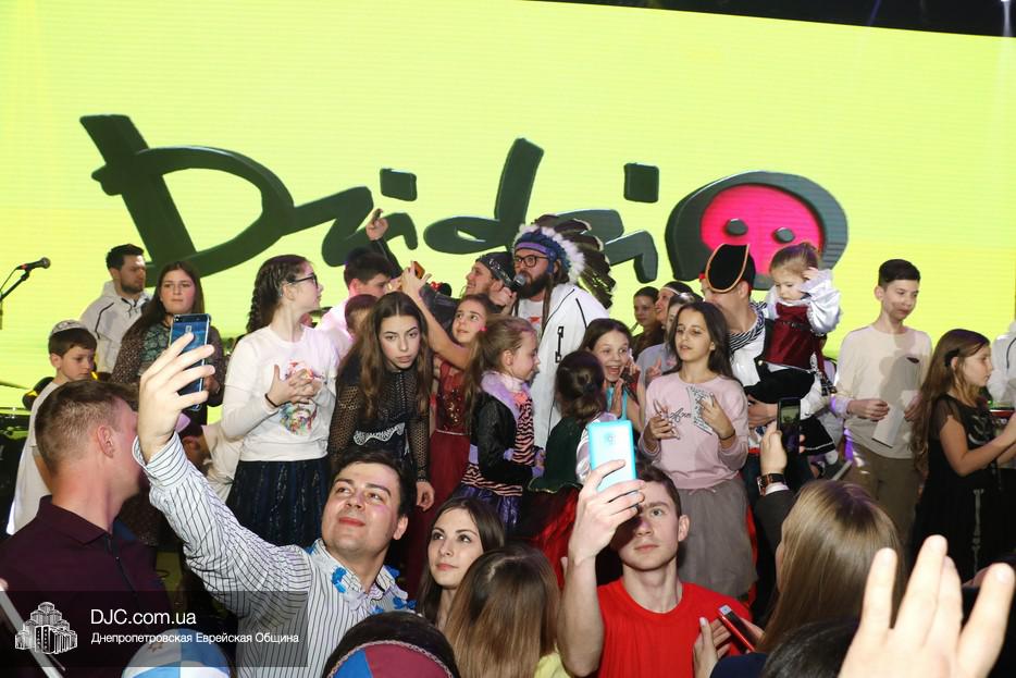 Но главной звездой пуримского представления в этом году стала «DZIDZIO», весьма популярная модерная украинская группа, выступающая в жанре «комедийного антигламурного попа». Яркое, красочное и весьма интерактивное шоу вызвало большой восторг зала, особенно его детской части, причем детей Михаил Хома, фронтмен группы, пригласил на сцену и с удовольствием пел вместе с ними.