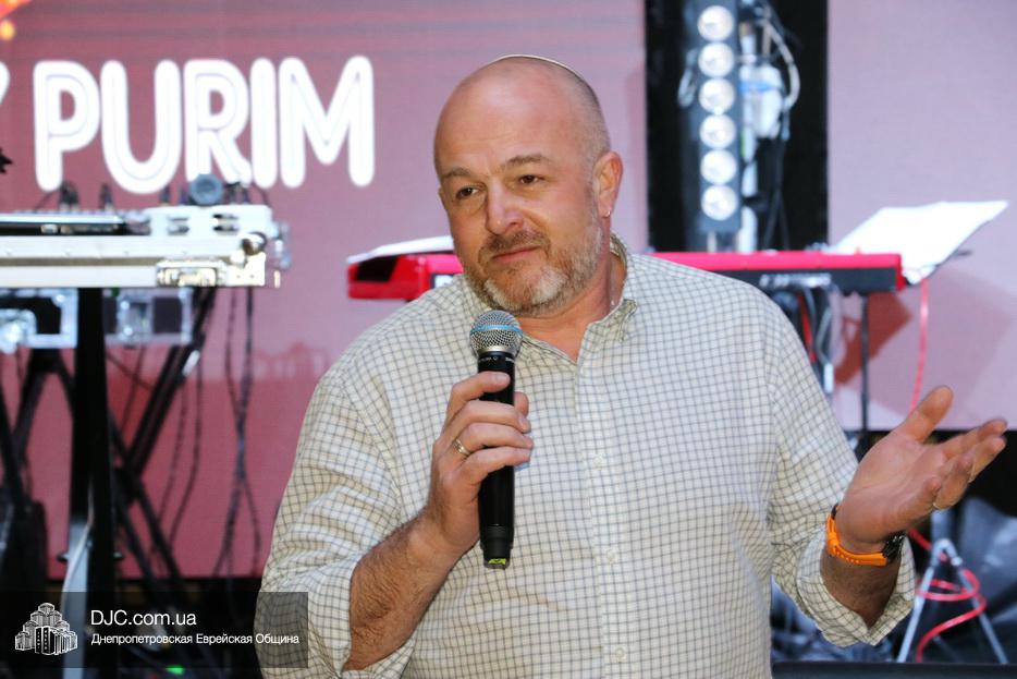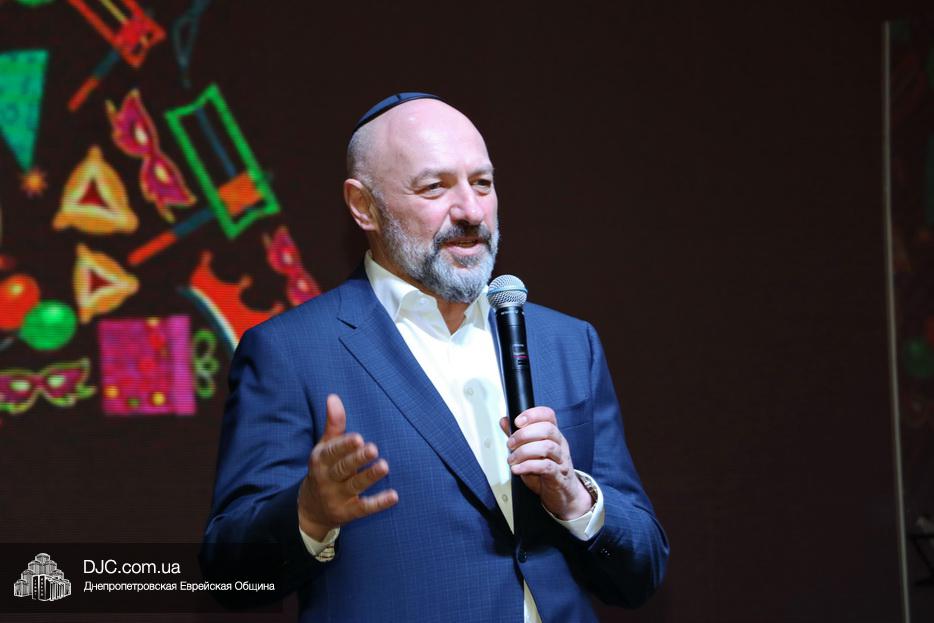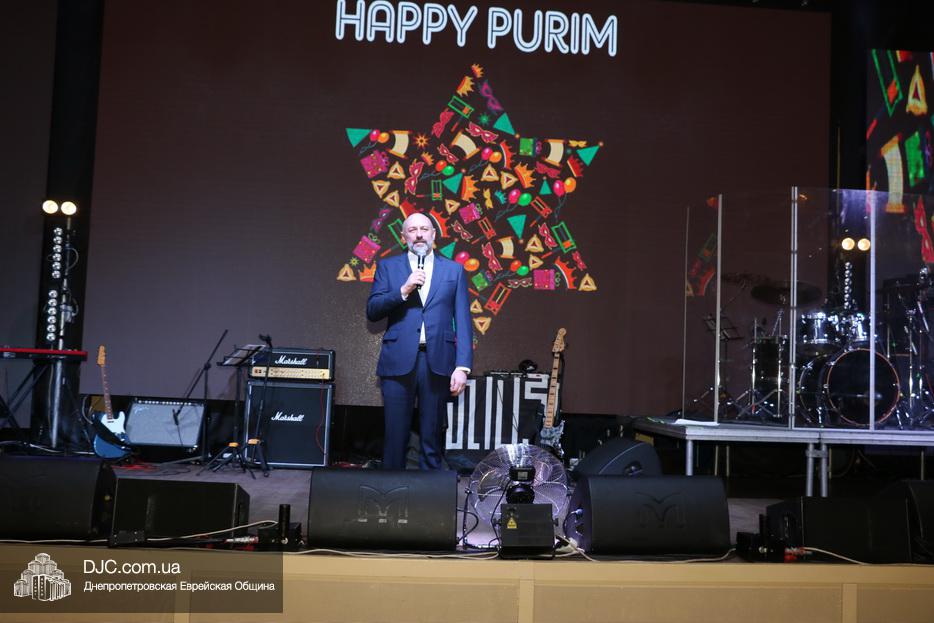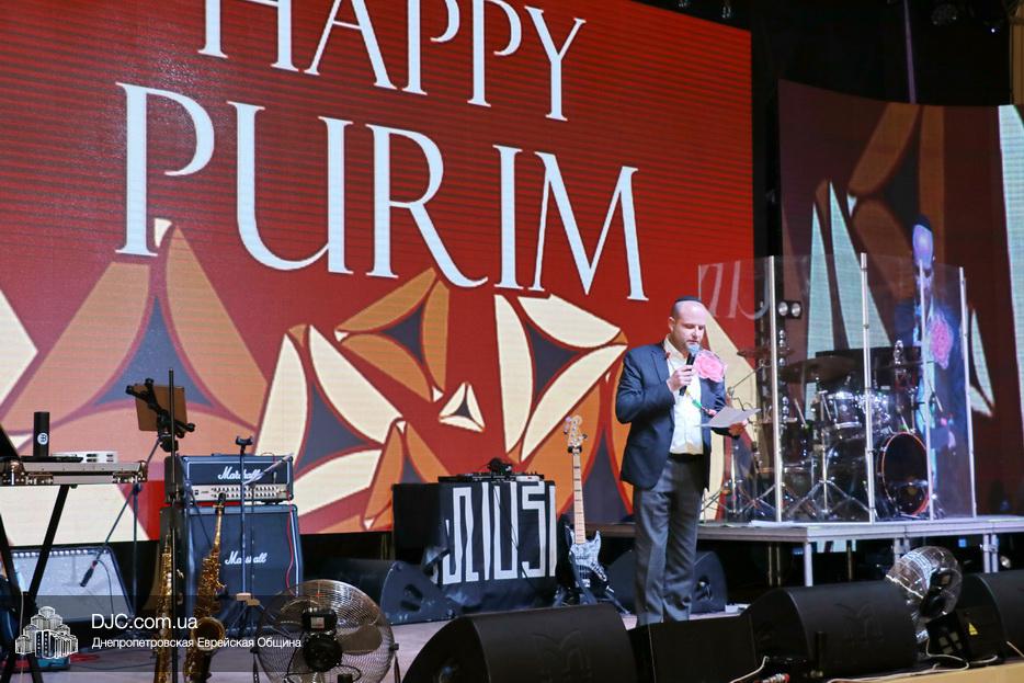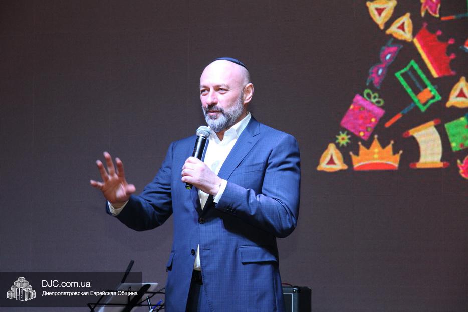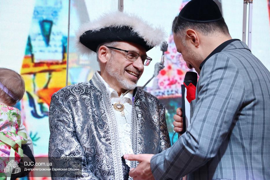 Затем, почти тысячу евреев Днепра, которые пришли на праздник, тепло поздравили Главный раввин Днепра и региона Шмуэль Каминецкий и Президент еврейской общины Днепра Цви Гирш бен Борух (Геннадий Борисович) Боголюбов. Была выражена глубокая благодарность члену Попечительского Совета общины Виталию Ратушному и его супруге Ирине, которые много лет подряд берут на себя миссию организовать для всей общины грандиозный пуримский праздник и подарить всем безграничное веселье, что в общине их давно называют «Мистер и Мисс Пурим». Раввин Каминецкий, от имени всех евреев Днепра, преподнес Виталию Ратушному памятный подарок в знак глубокой признательности за его труд на благо общины и во имя исполнения заповедей Пурима.