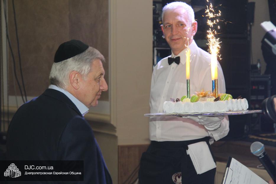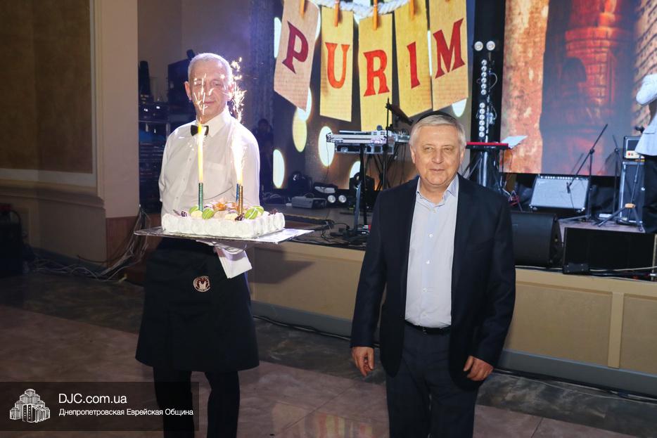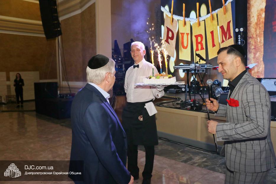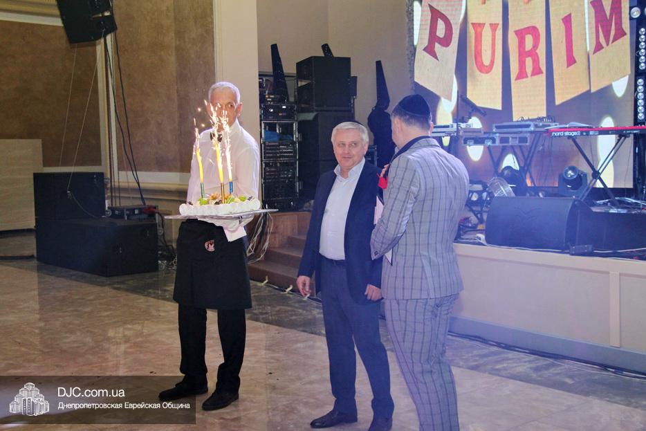 Специальный сюрприз, именинный торт, был торжественно преподнесен члену Попечительского Совета Днепра Евгению Наумовичу Зельдису, чей День рождения приходится на праздник Пурим.