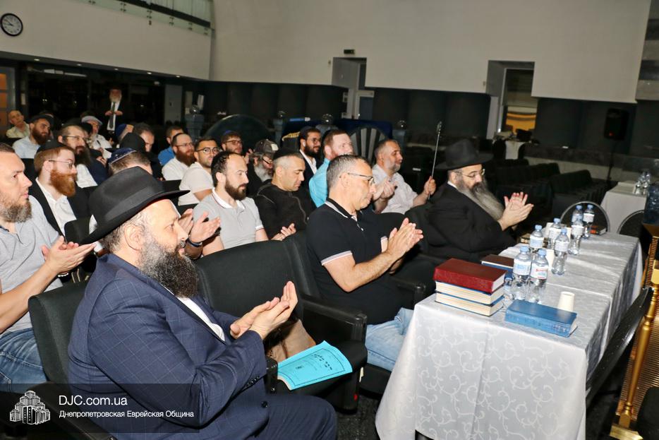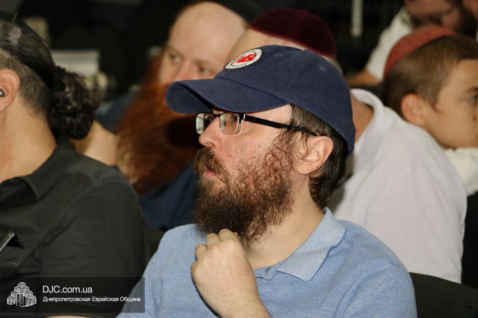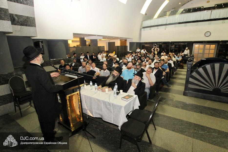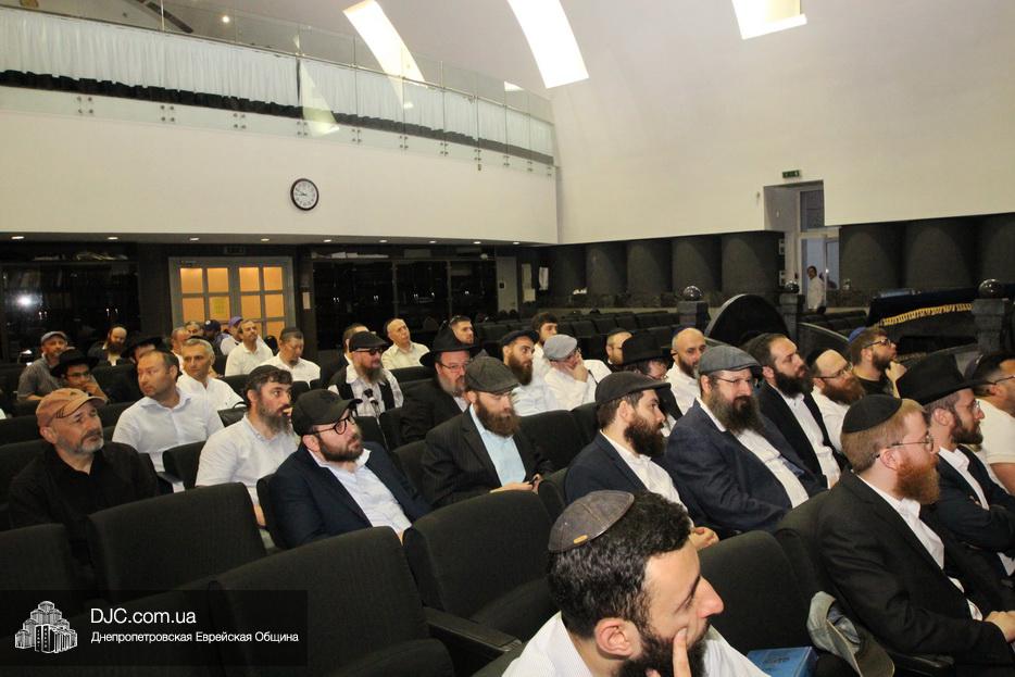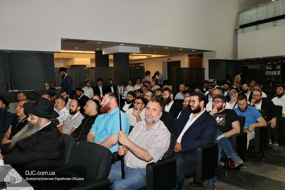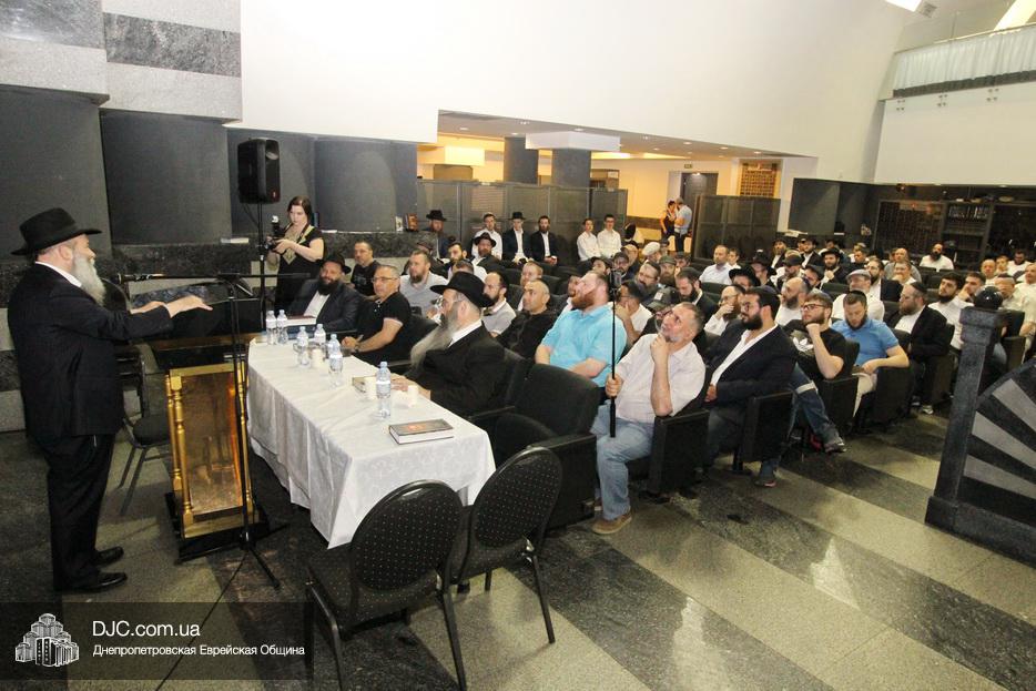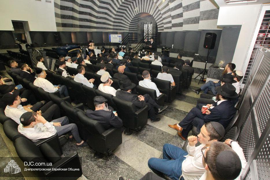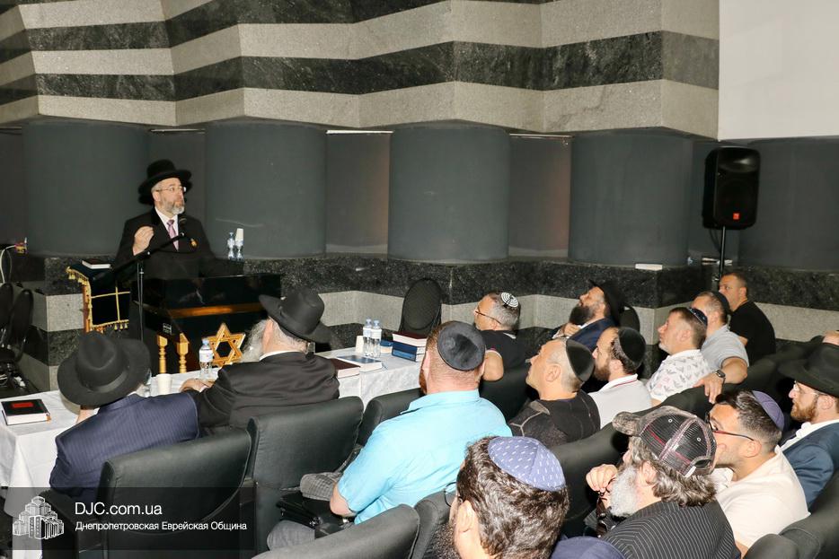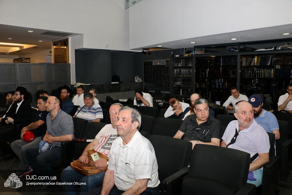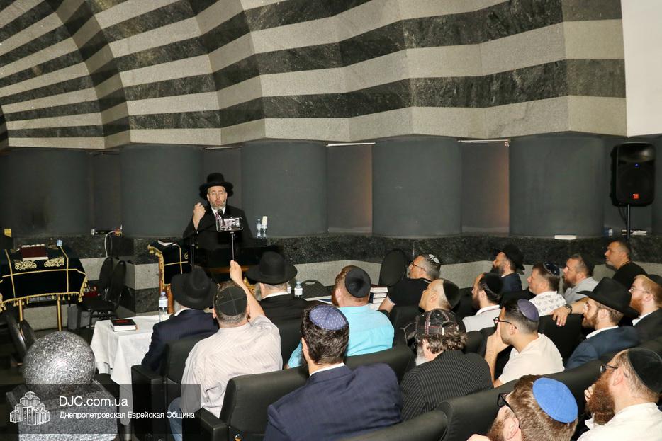 Мужской урок проходил в главном зале Центральной синагоги «Золотая Роза» и был посвящен принципам преемственности власти в иудаизме, в частности вопросу о том, почему именно Иошуа Бен Нун стал преемником Моше Рабейну на посту лидера еврейского народа.