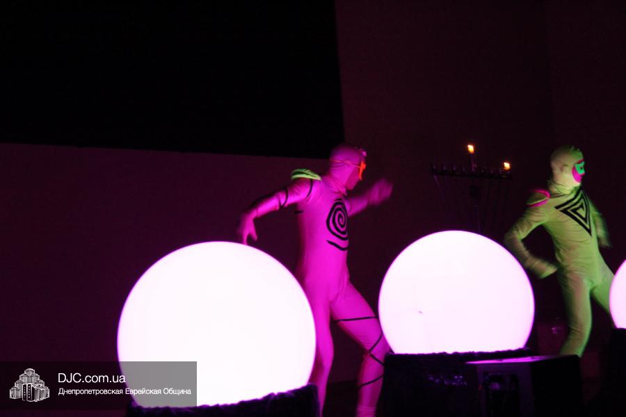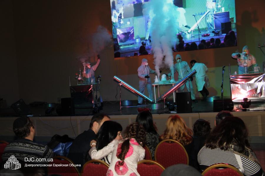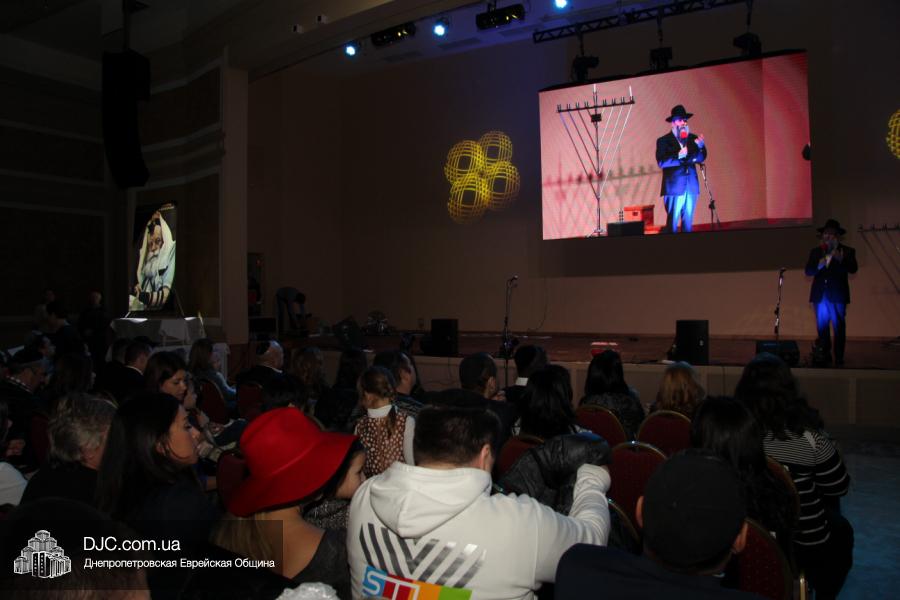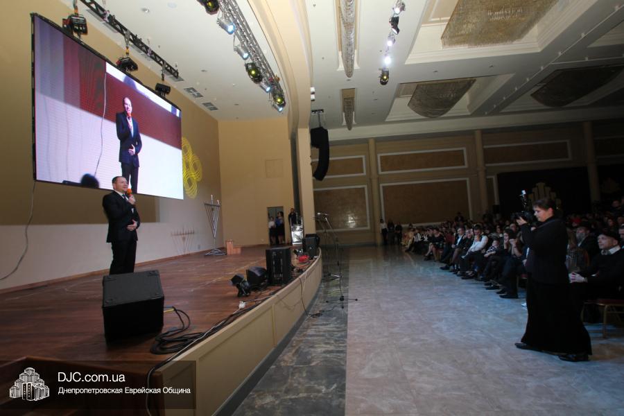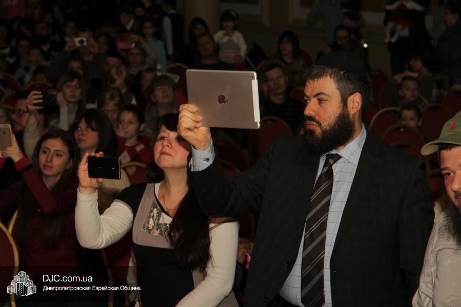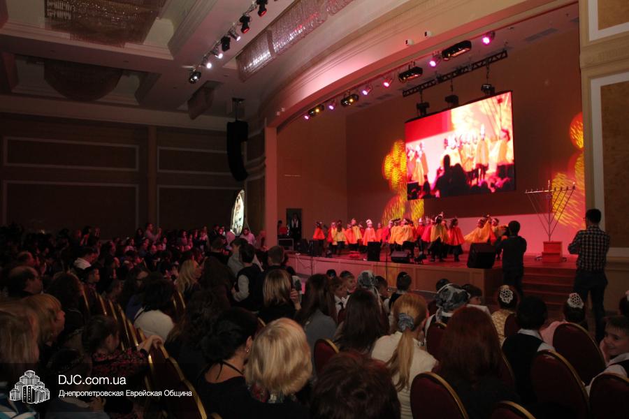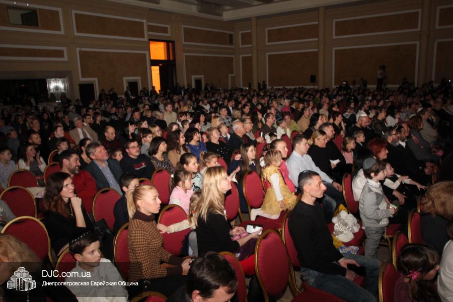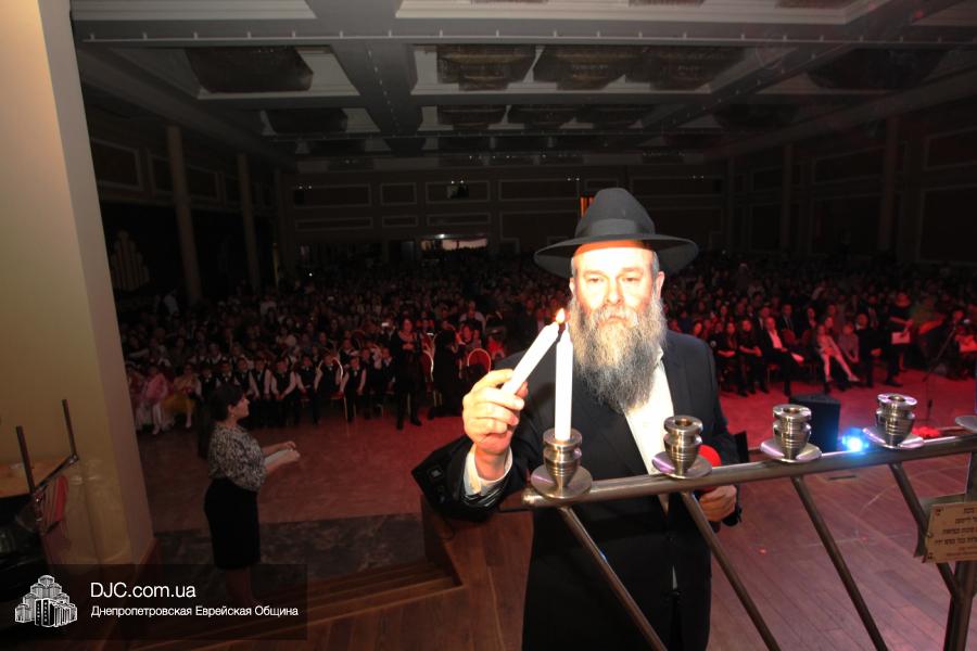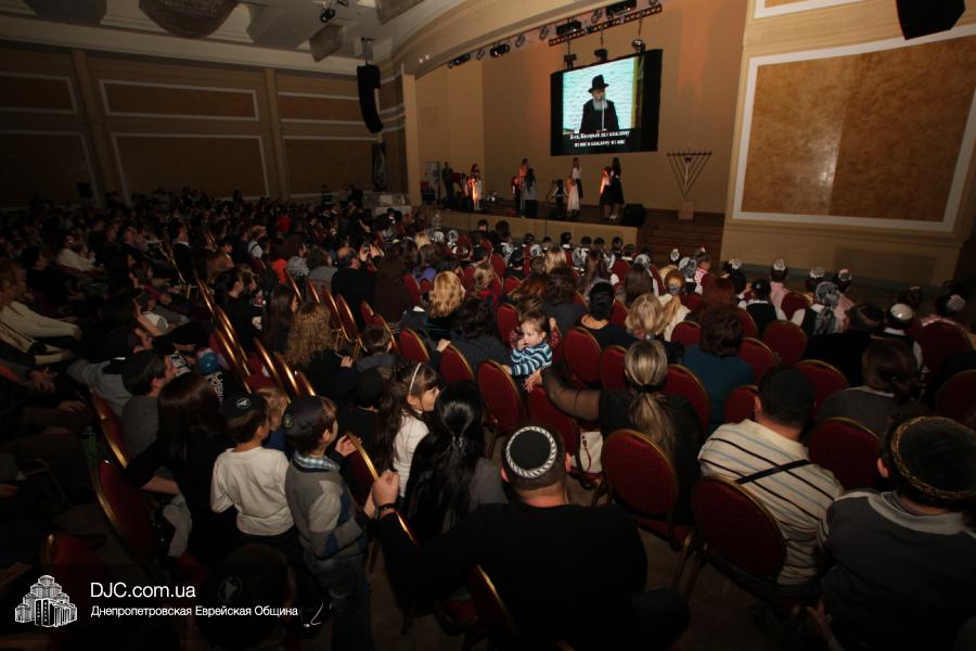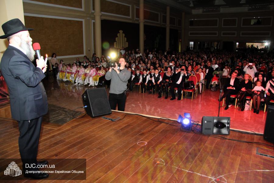 Но на самом деле, это был всего лишь пролог. В главном зале общины стулья были расставлены в концертном варианте – 1200 посадочных мест, и когда прозвучали фанфары, все затаили дыхание, ибо со сцены повалил дым, и началось «шоу неоновых человечков». После того как «танец огней» закончился, на сцену вышли ведущие – четыре тройки – ученики еврейской школы и воспитанники «Бейт Циндлихта», которые очень точно воспроизвели весьма сложный сценарий всего праздника, но началом, конечно же, было зажжение первой Ханукальной свечи, которое провел Главный раввин Днепропетровска и региона Шмуэль Каминецкий, и выступления официальных гостей: Вячеслава Смоткина, второго секретаря Посольства государства Израиль в Украине, директора Израильского Культурного Центра в Днепропетровске; Йонатана Лейфера, председателя правления «Джойнт» в юго-восточной Украине; Натали Набитовски, главы представительства днепропетровского филиала «Сохнут-Украина».
