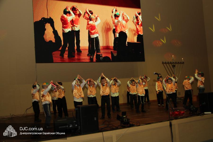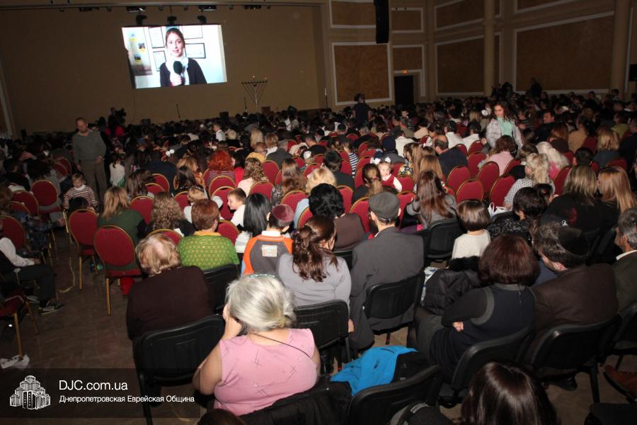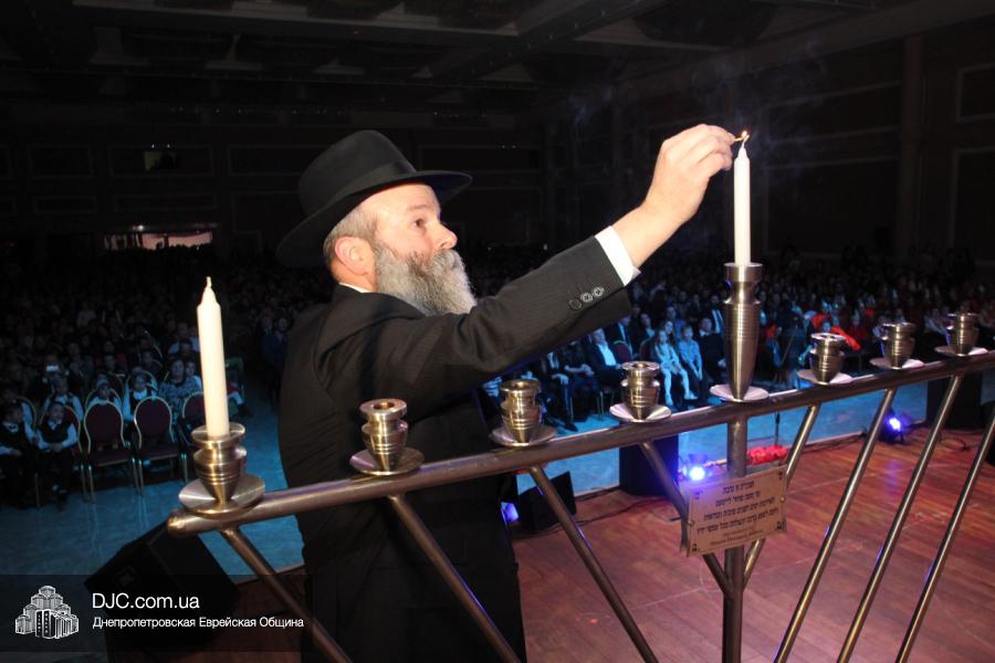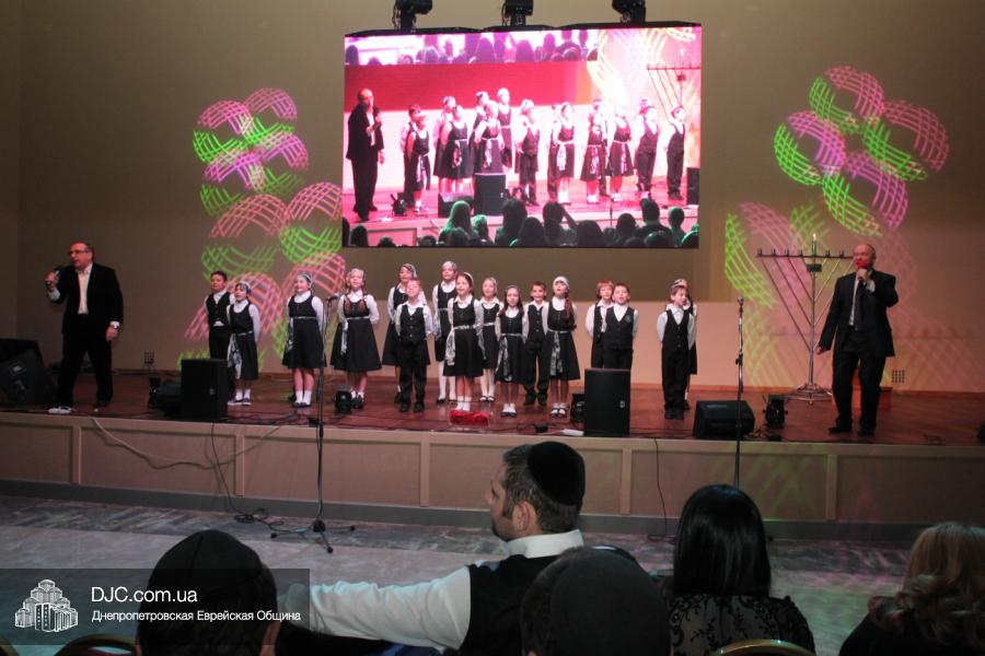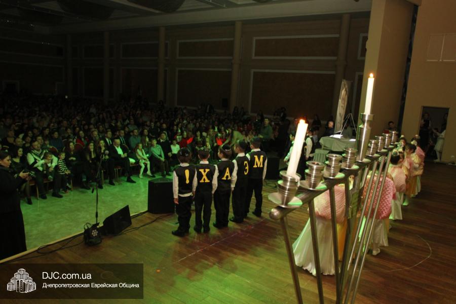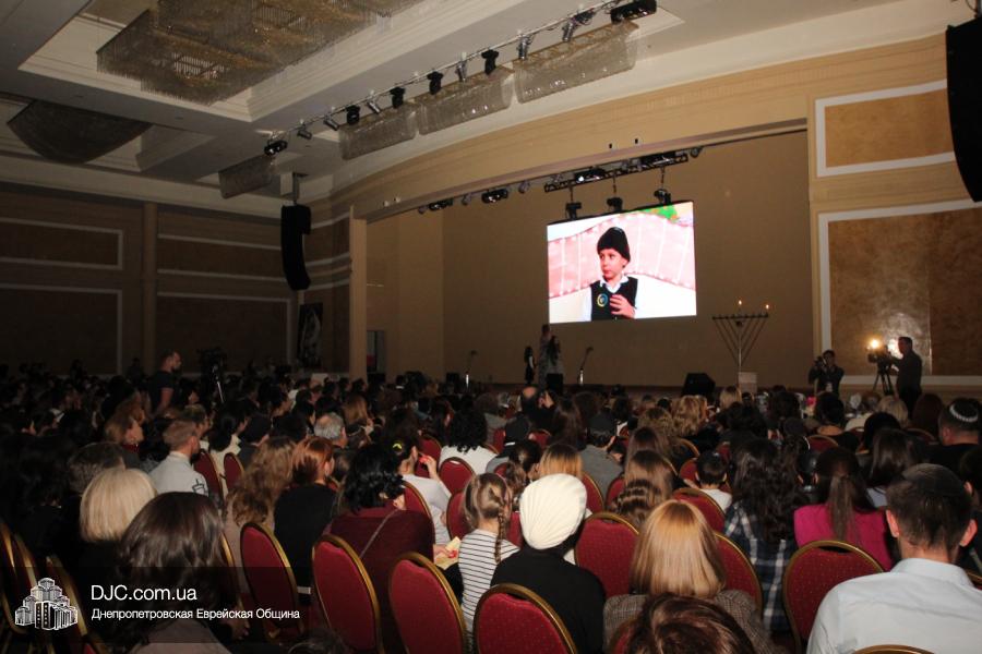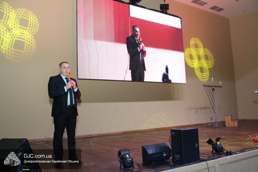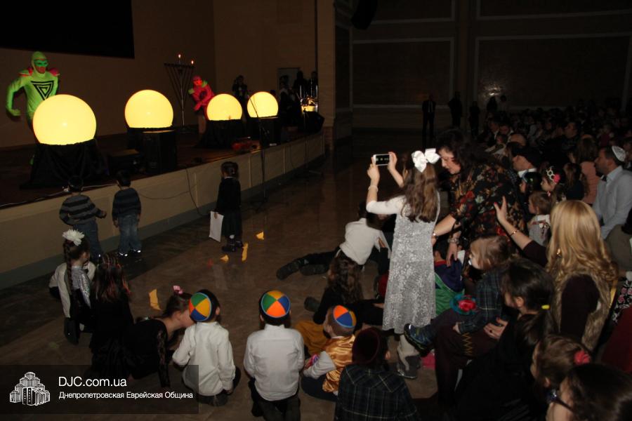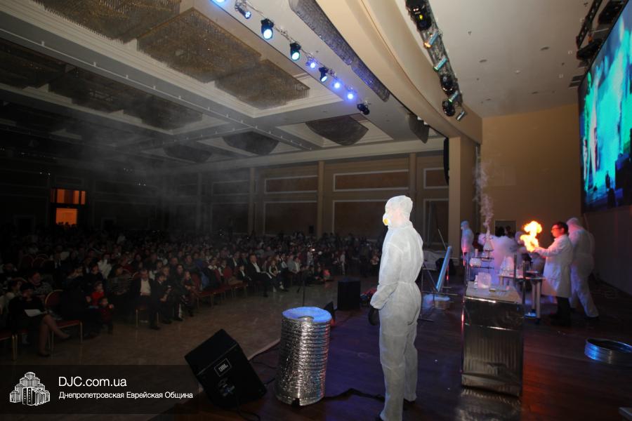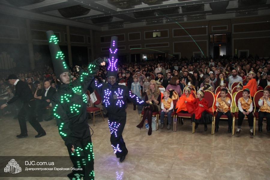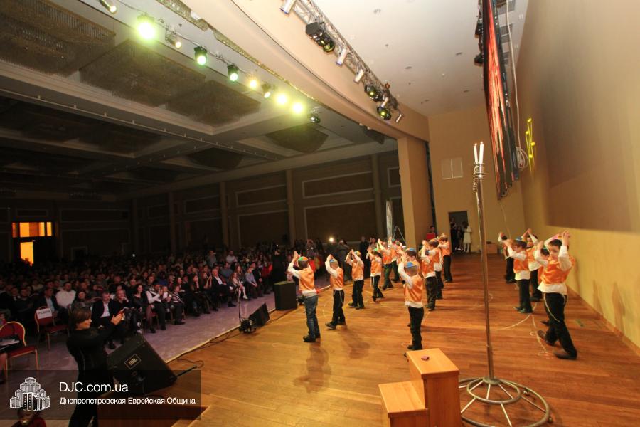 Но на самом деле, это был всего лишь пролог. В главном зале общины стулья были расставлены в концертном варианте – 1200 посадочных мест, и когда прозвучали фанфары, все затаили дыхание, ибо со сцены повалил дым, и началось «шоу неоновых человечков». После того как «танец огней» закончился, на сцену вышли ведущие – четыре тройки – ученики еврейской школы и воспитанники «Бейт Циндлихта», которые очень точно воспроизвели весьма сложный сценарий всего праздника, но началом, конечно же, было зажжение первой Ханукальной свечи, которое провел Главный раввин Днепропетровска и региона Шмуэль Каминецкий, и выступления официальных гостей: Вячеслава Смоткина, второго секретаря Посольства государства Израиль в Украине, директора Израильского Культурного Центра в Днепропетровске; Йонатана Лейфера, председателя правления «Джойнт» в юго-восточной Украине; Натали Набитовски, главы представительства днепропетровского филиала «Сохнут-Украина».