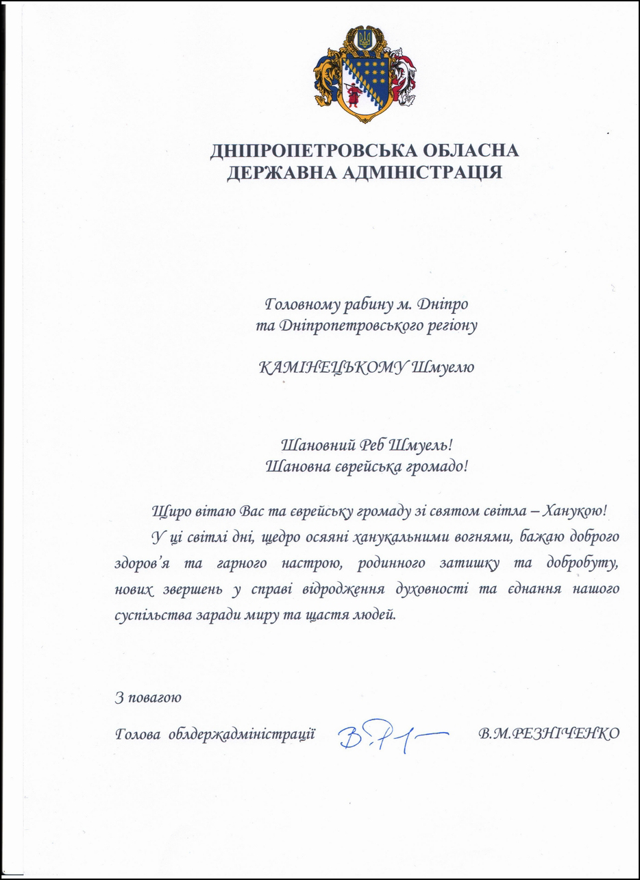 Председатель Днепропетровской областной государственной администрации Валентин Михайлович Резниченко направил в адрес еврейской общины Днепра и Главного раввина Днепра и региона Шмуэля Каминецкого поздравление с начавшимся восьмидневным праздником Ханука.