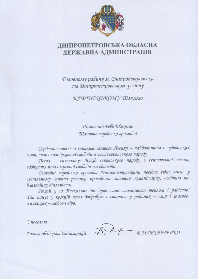 Председатель Днепропетровской областной государственной администрации Валентин Михайлович Резниченко направил Главному раввину Днепропетровска и региона Шмуэлю Каминецкому и всей еврейской общине области поздравление по случаю праздника Песах.