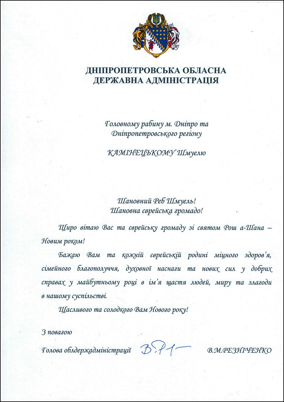 Председатель Днепропетровской областной государственной администрации Валентин Михайлович Резниченко направил Главному раввину Днепра и региона Шмуэлю Каминецкому и всей еврейской общине области поздравление по случаю праздника Рош А Шана.