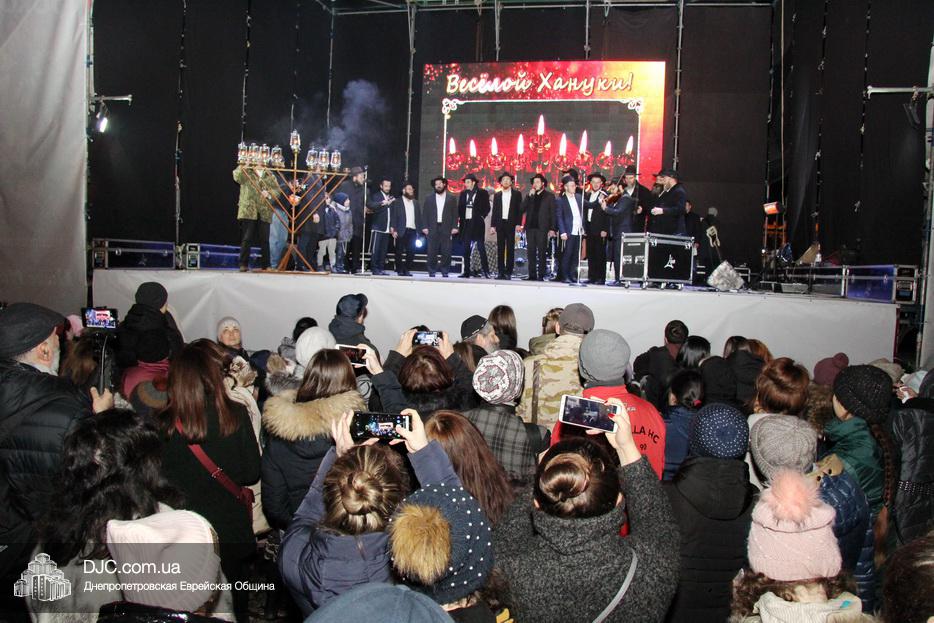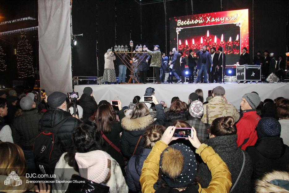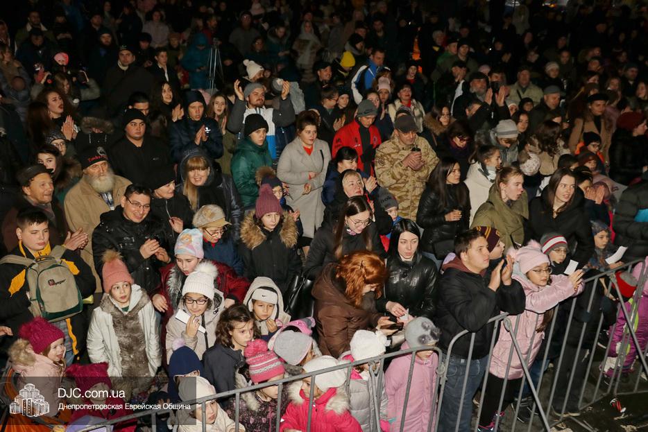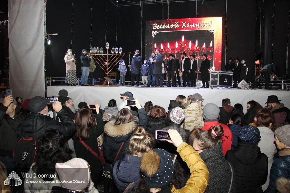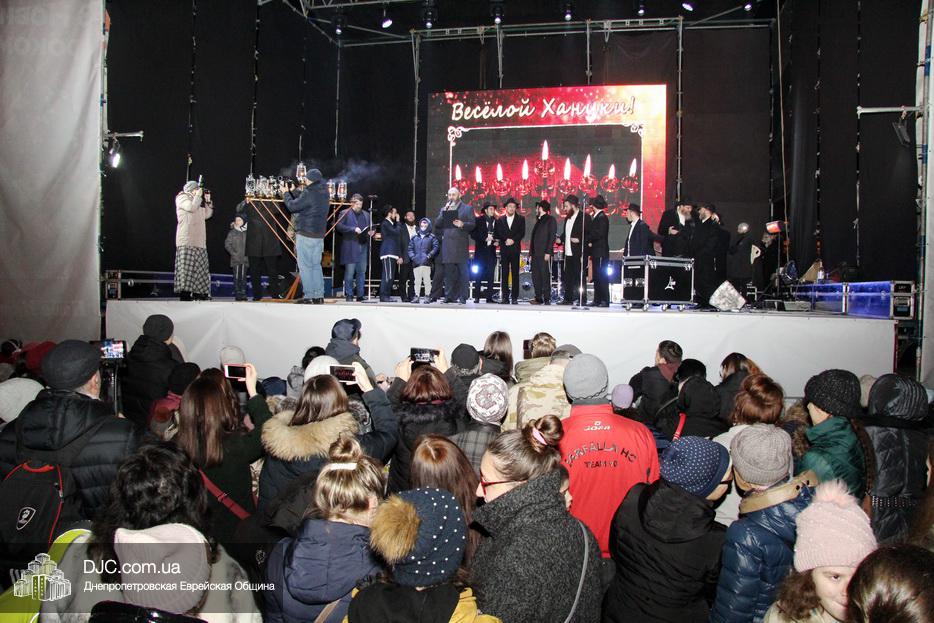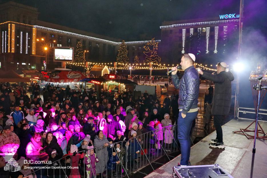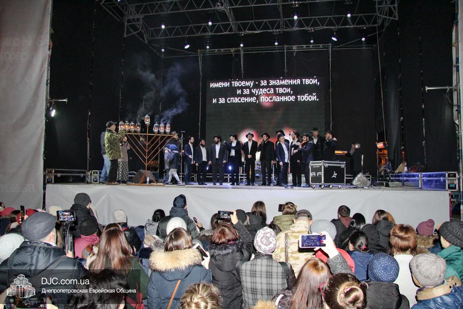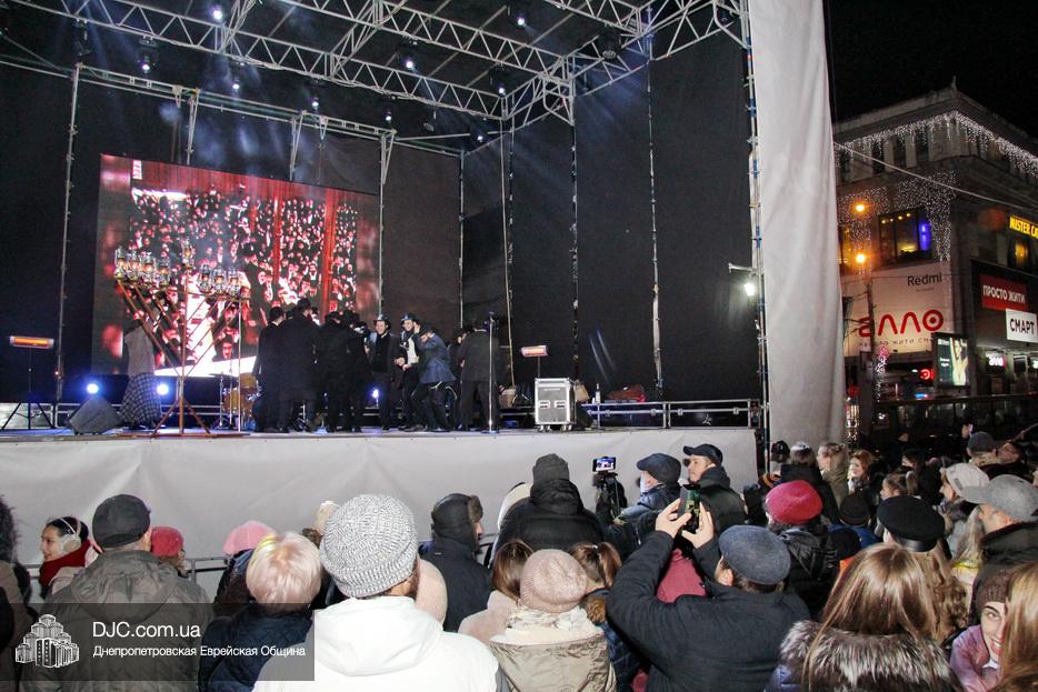 После зажжения ханукий состоялось выступление молодых посланников Ребе из Нью-Йорка, приехавших в Днепр для участия в ханукальных мероприятиях. Они исполнили ханукальный гимн «Анерот Алалу» и хасидский танец. Со сцены также прозвучали поздравления еврейской общине от местных властей и руководителей Всеукраинских еврейских организаций.