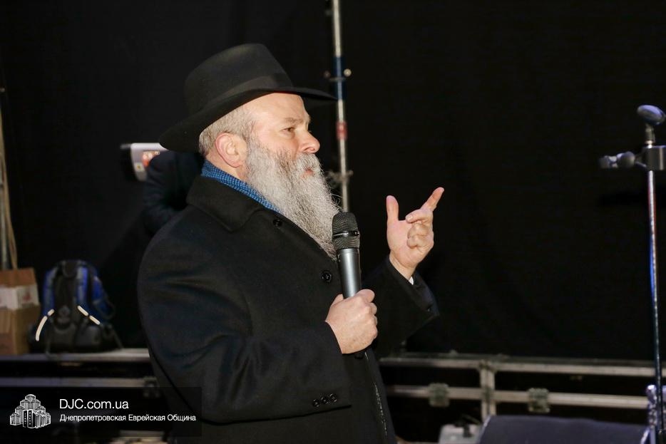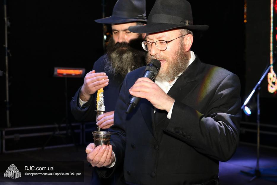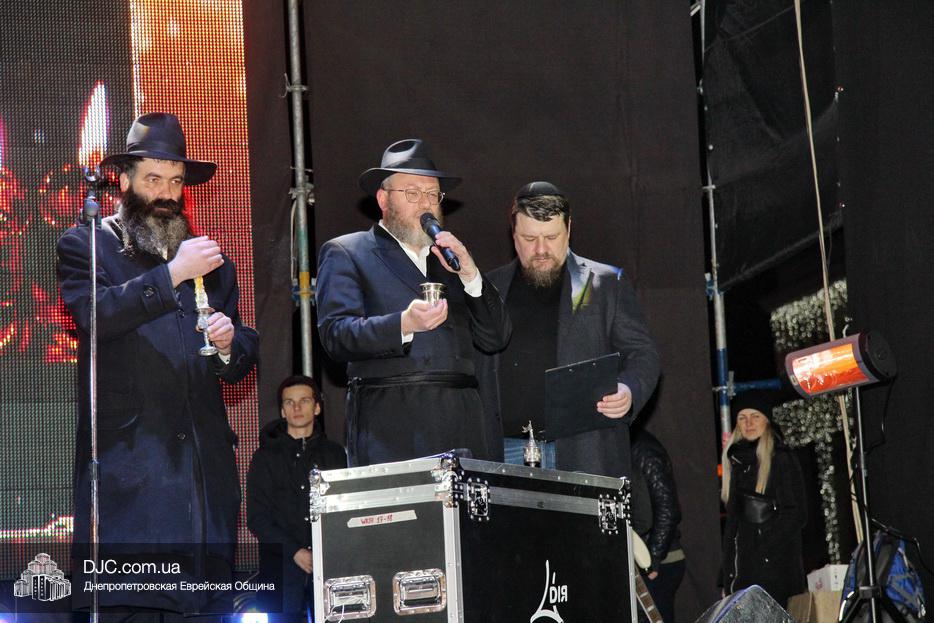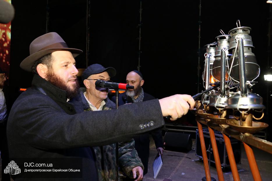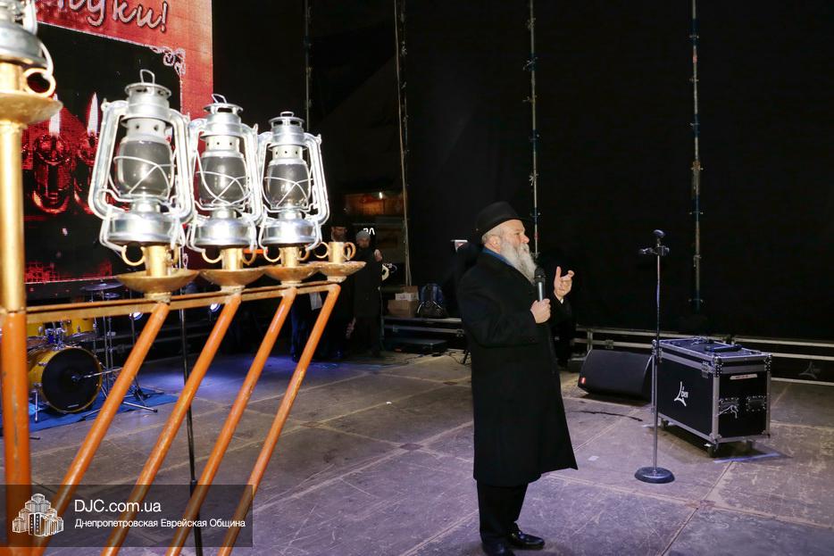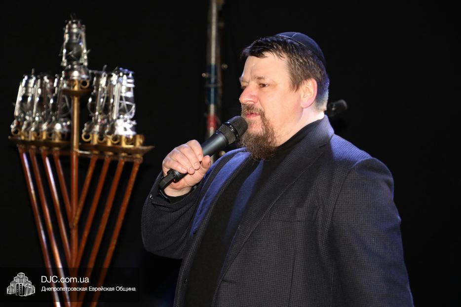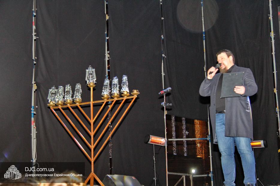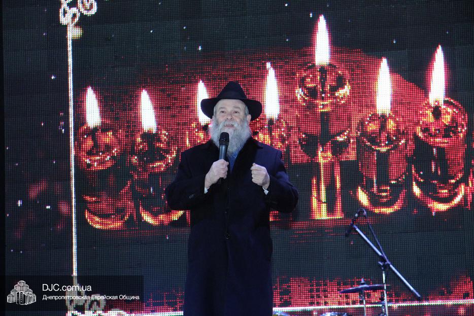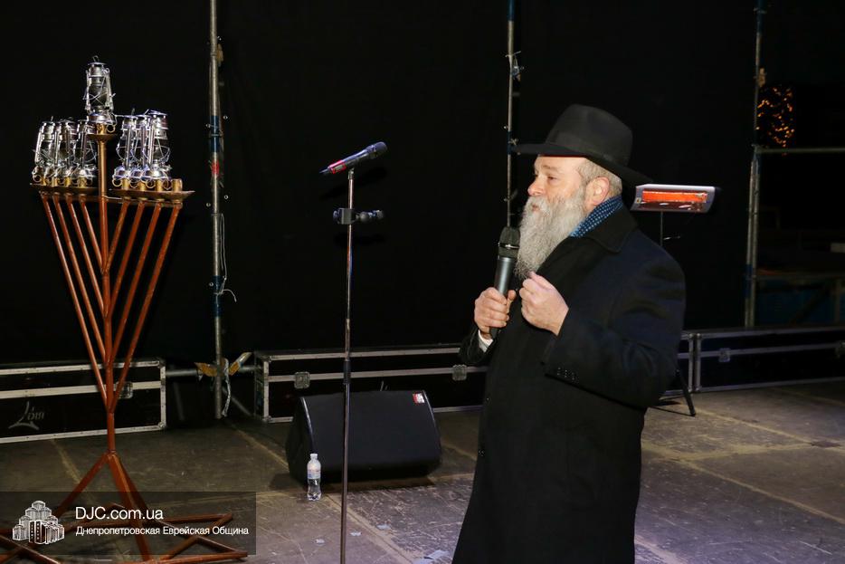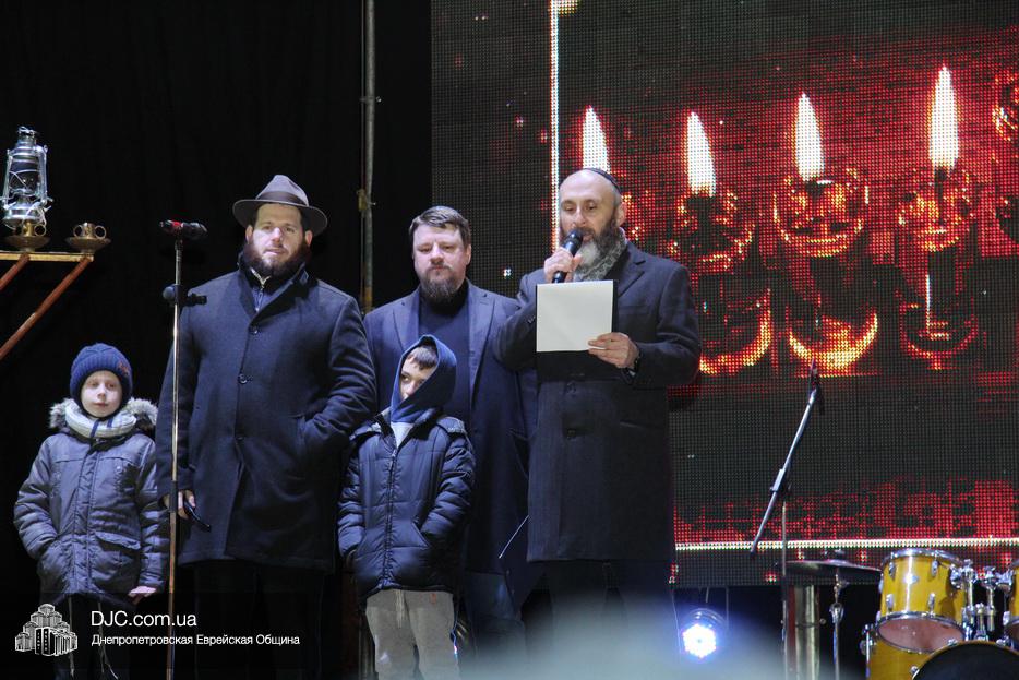 Далее слово для главного приветствия и поздравления всего города со светлым праздником Ханука было предоставлено Главному раввину Днепра и региона Шмуэлю Каминецкому. А затем прошла церемония зажжения семи свечей Хануки. Честь прочитать благословения и зажжений ханукию на сцене была предоставлена известному ресторатору Менахему Менделу Гольдшмидту, а перевод благословений на русский язык прочитал директор общины Зелиг Брез.