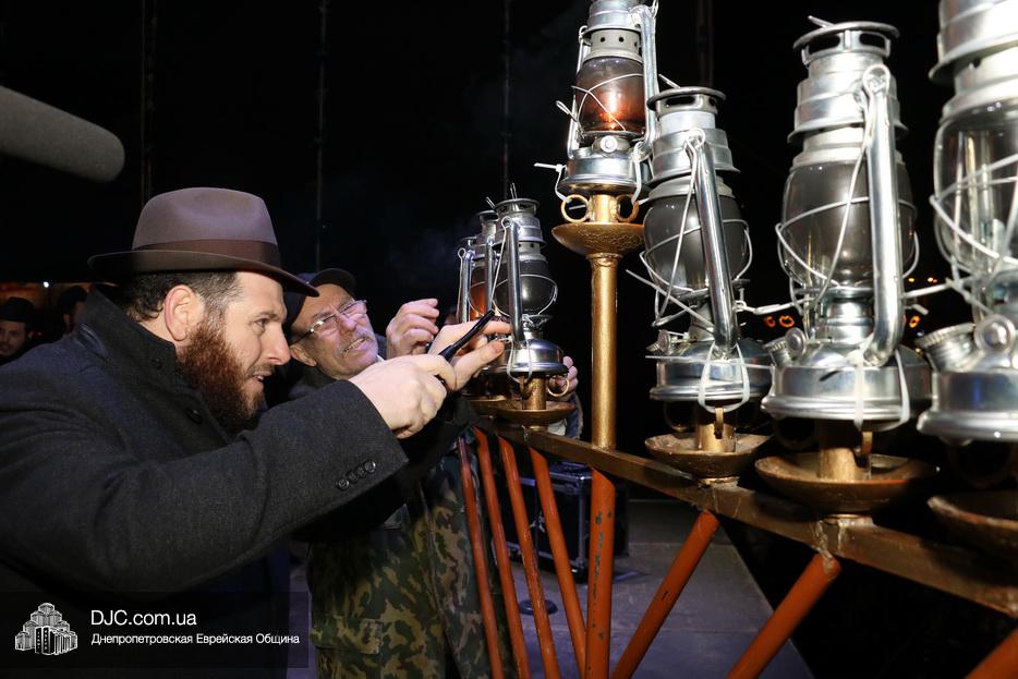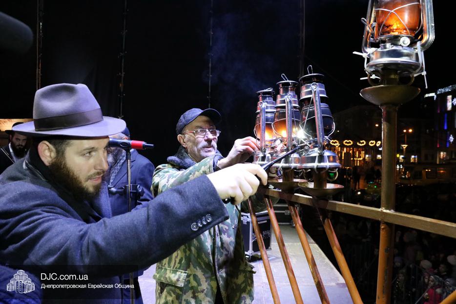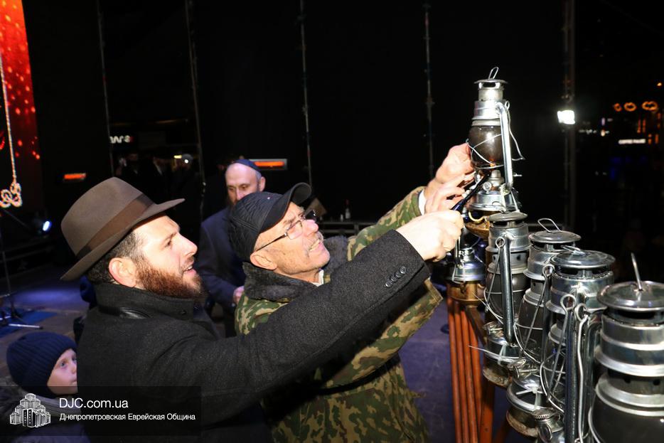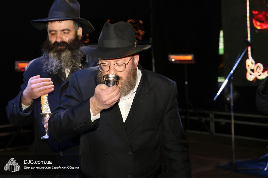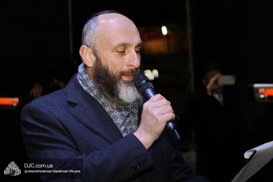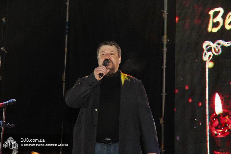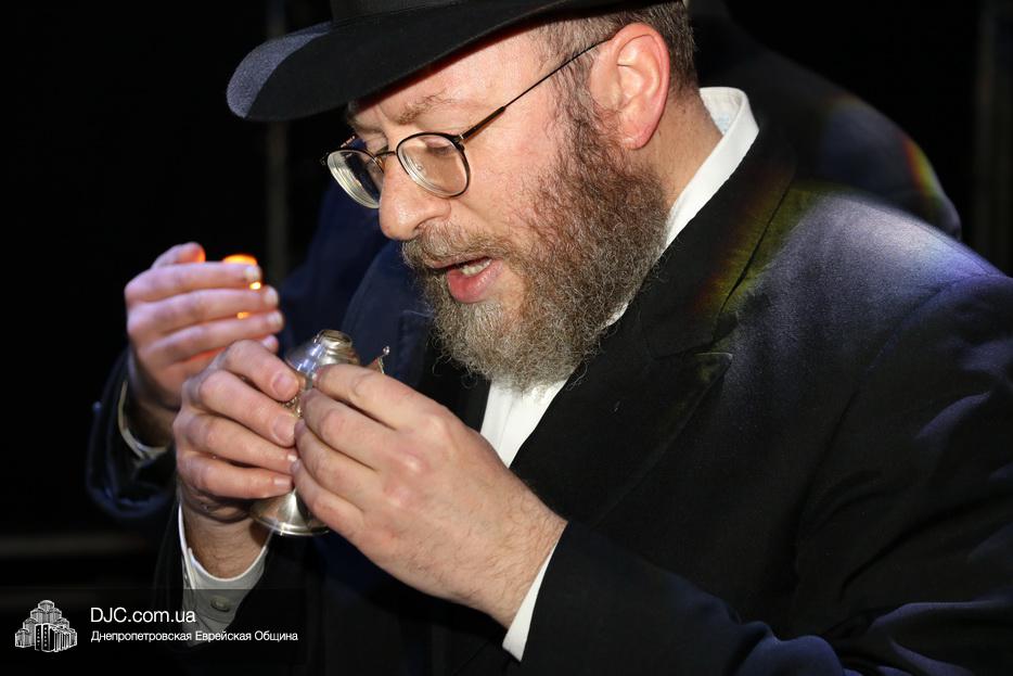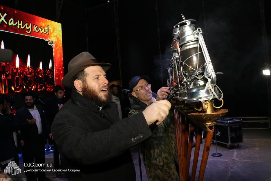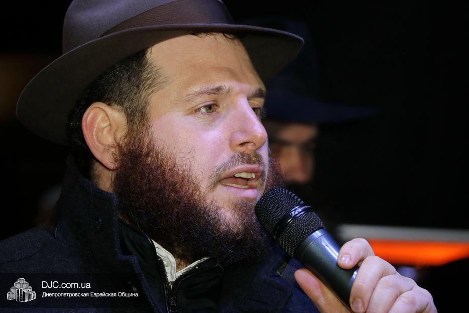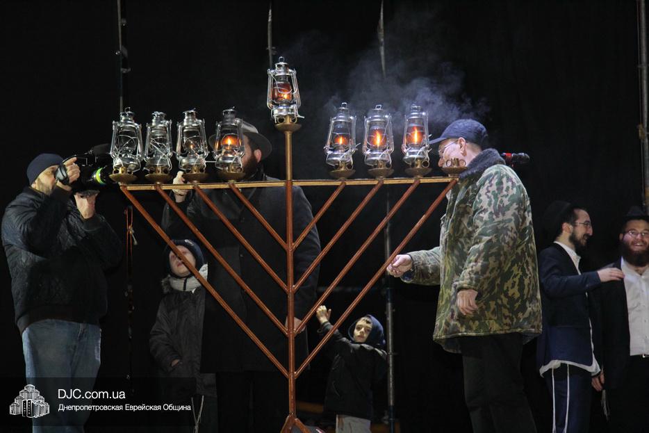 Далее слово для главного приветствия и поздравления всего города со светлым праздником Ханука было предоставлено Главному раввину Днепра и региона Шмуэлю Каминецкому. А затем прошла церемония зажжения семи свечей Хануки. Честь прочитать благословения и зажжений ханукию на сцене была предоставлена известному ресторатору Менахему Менделу Гольдшмидту, а перевод благословений на русский язык прочитал директор общины Зелиг Брез.