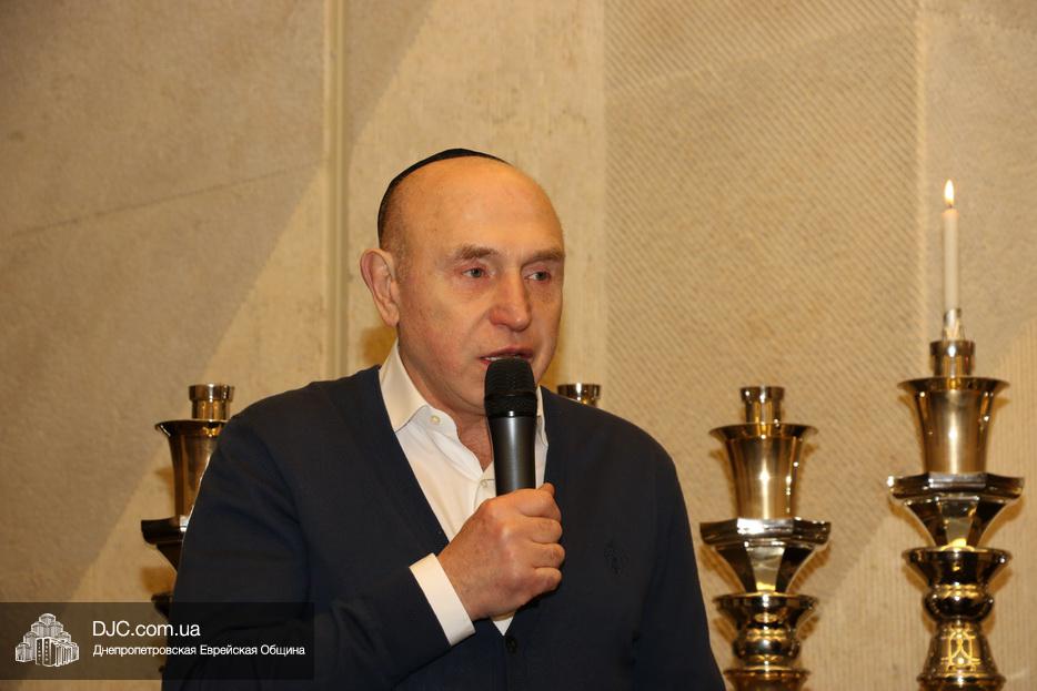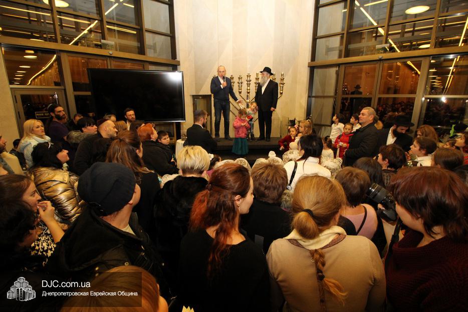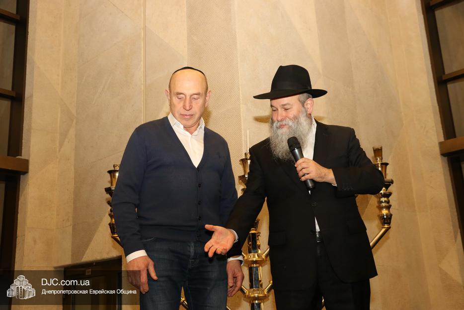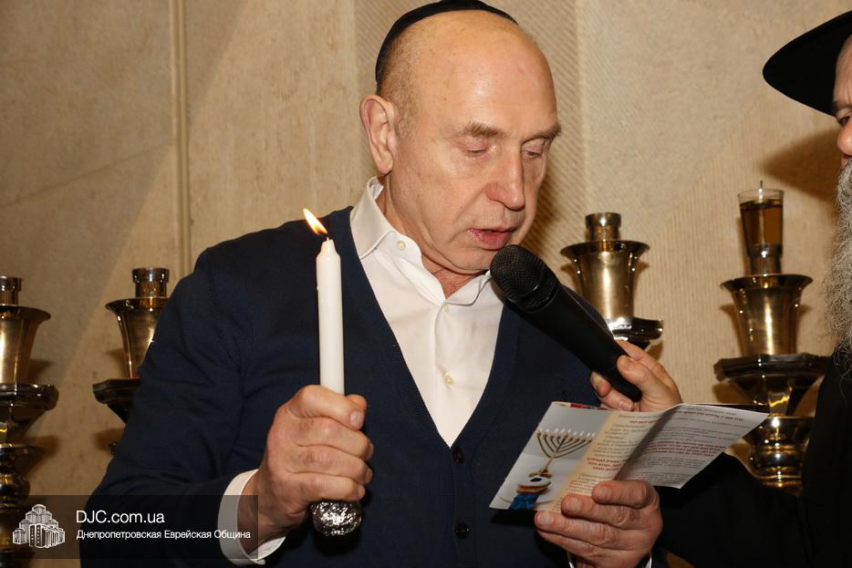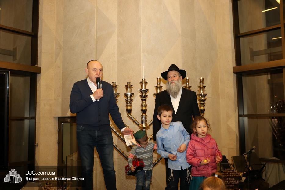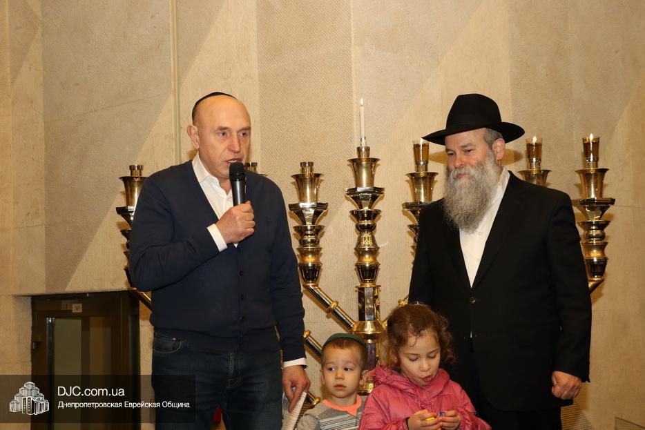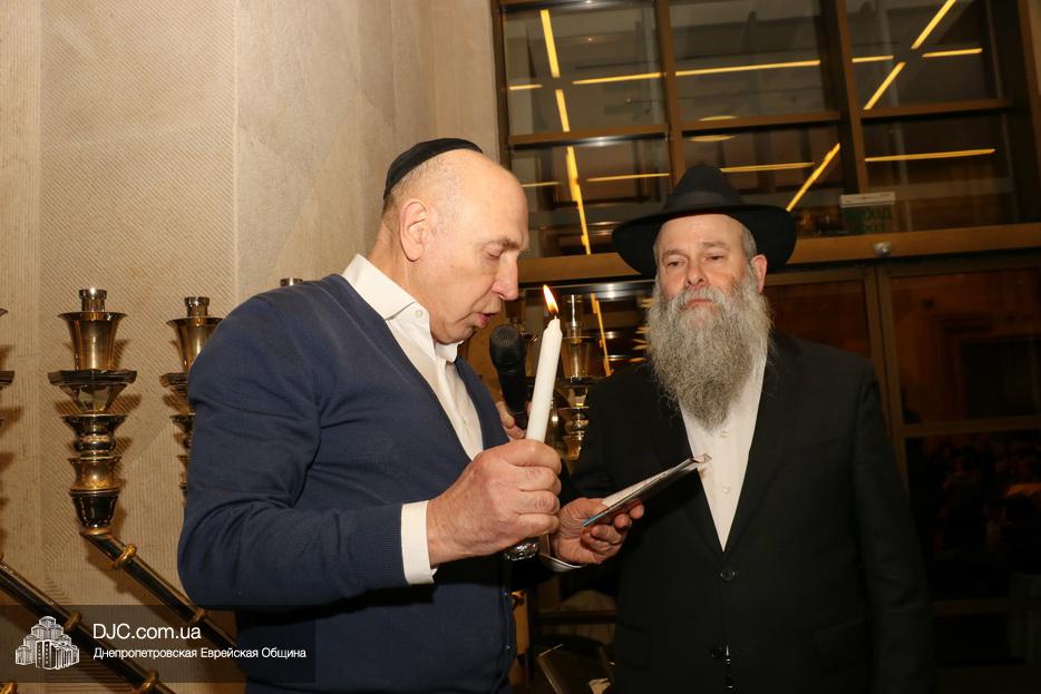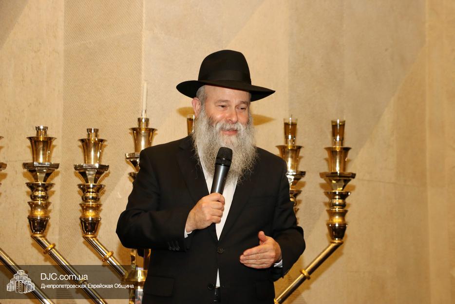Главный раввин Днепра и региона Шмуэль Каминецкий тепло поздравил всех пришедших на праздник и пригласил для зажжения свечей четвертого вечера Хануки члена Попечительского Совета еврейской общины Днепра Виталия Матвеевича Зайднера.