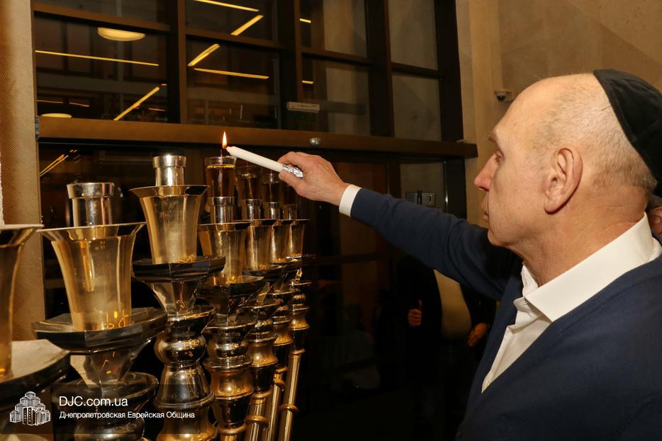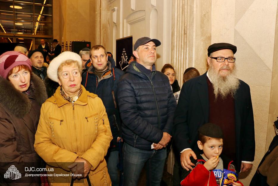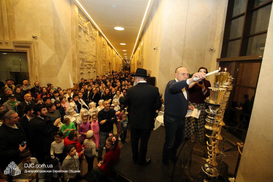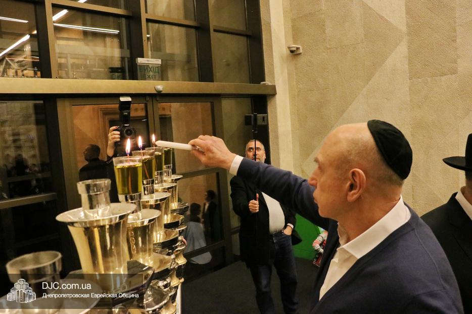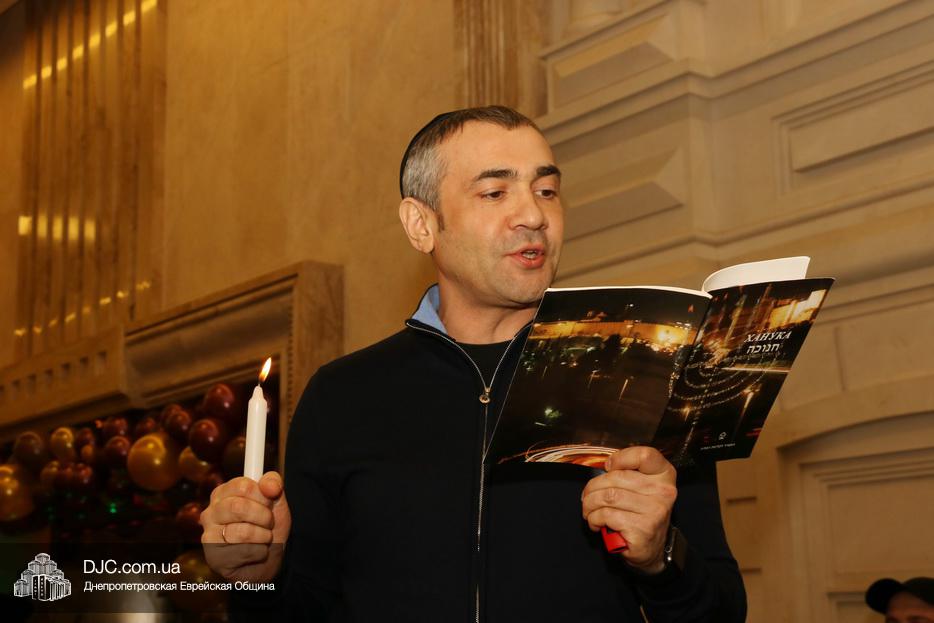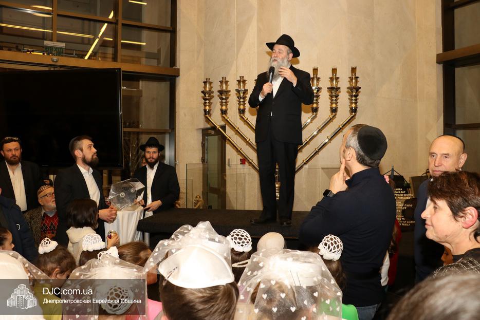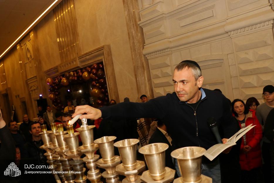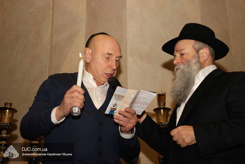Главный раввин Днепра и региона Шмуэль Каминецкий тепло поздравил всех пришедших на праздник и пригласил для зажжения свечей четвертого вечера Хануки члена Попечительского Совета еврейской общины Днепра Виталия Матвеевича Зайднера.