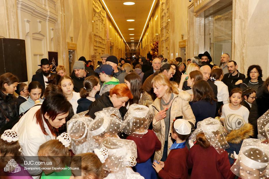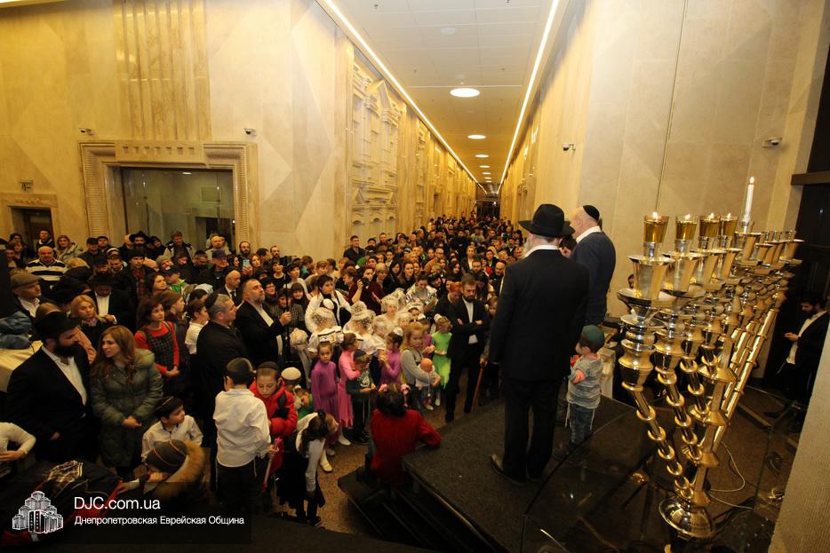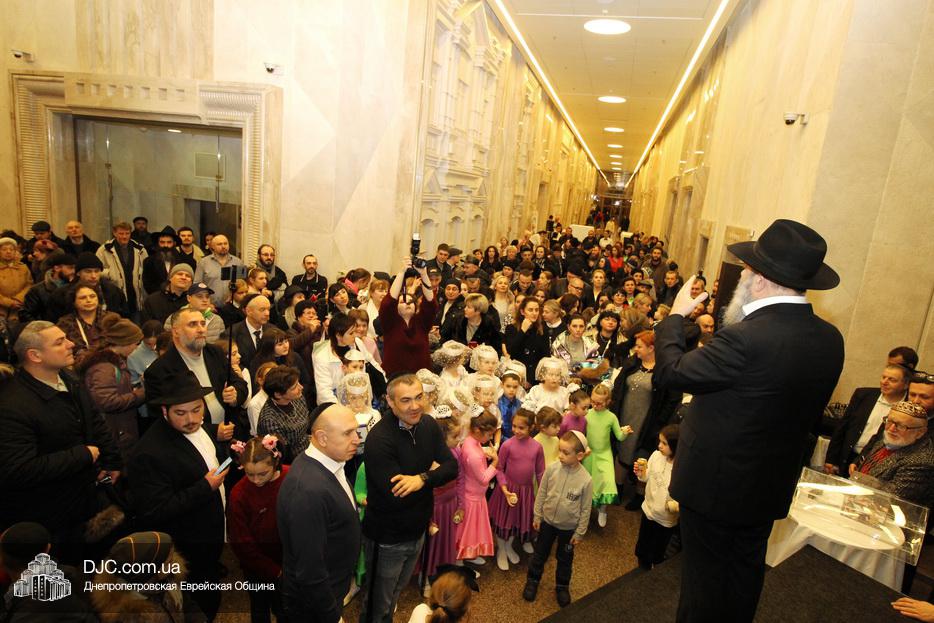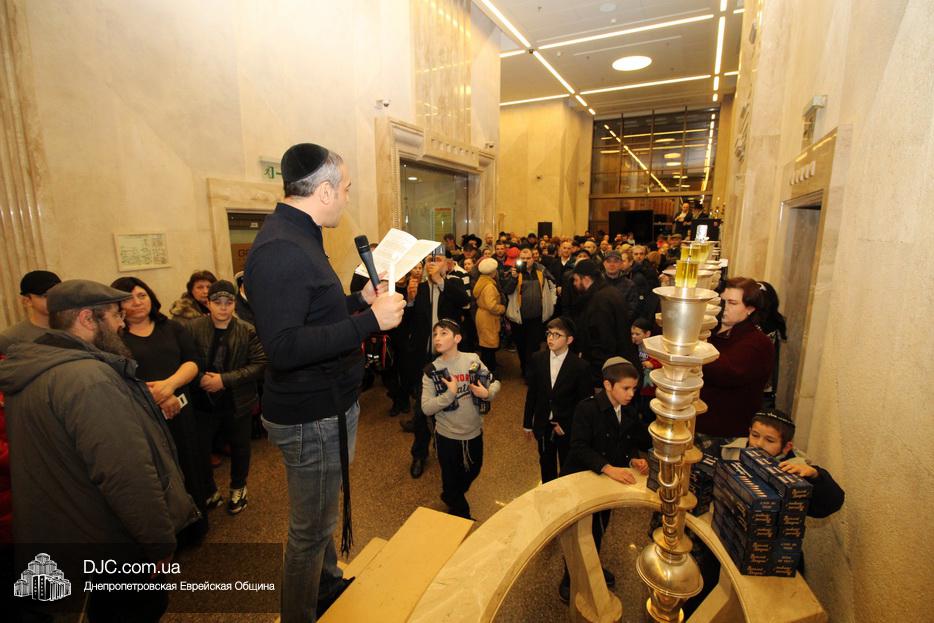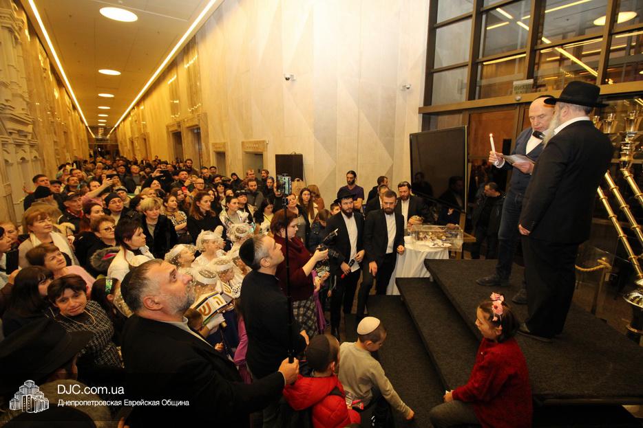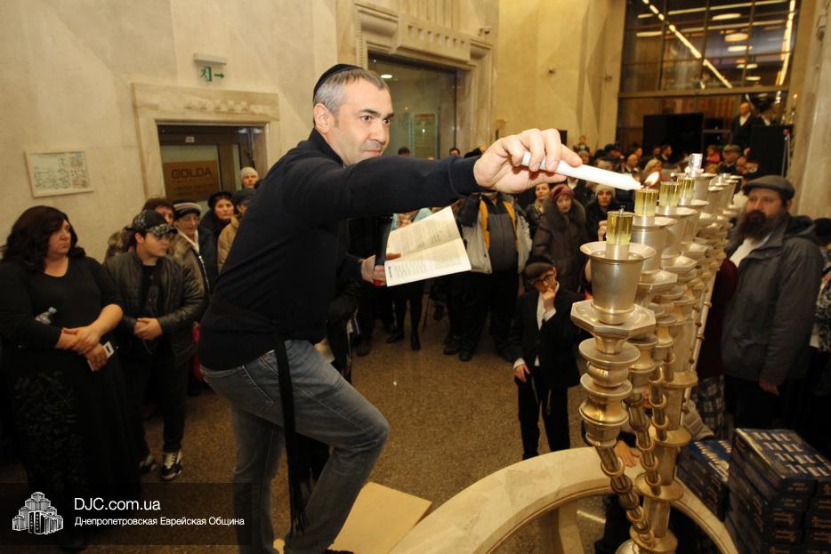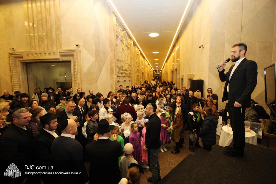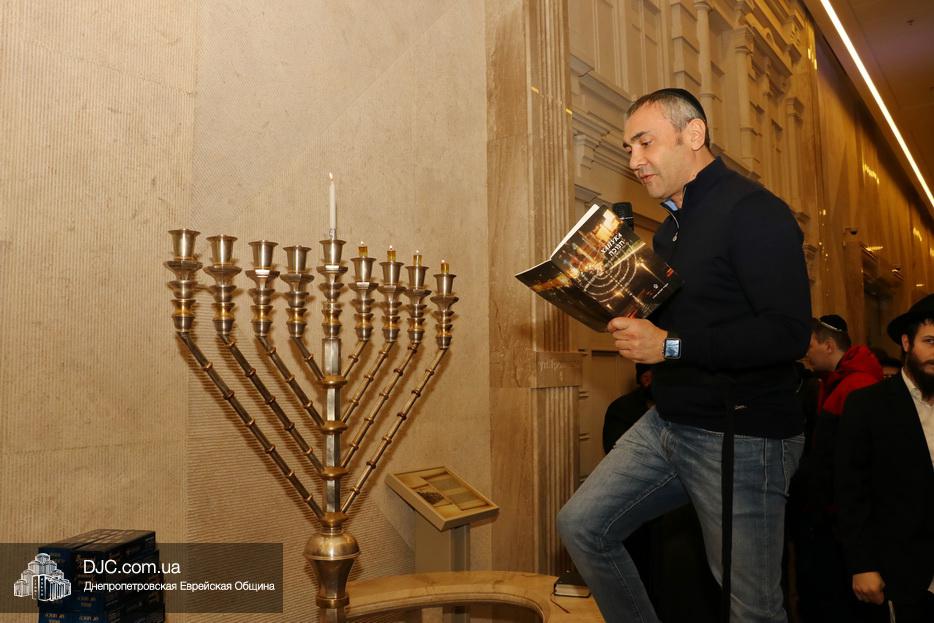 Главный раввин Днепра и региона Шмуэль Каминецкий тепло поздравил всех пришедших на праздник и пригласил для зажжения свечей четвертого вечера Хануки члена Попечительского Совета еврейской общины Днепра Виталия Матвеевича Зайднера.