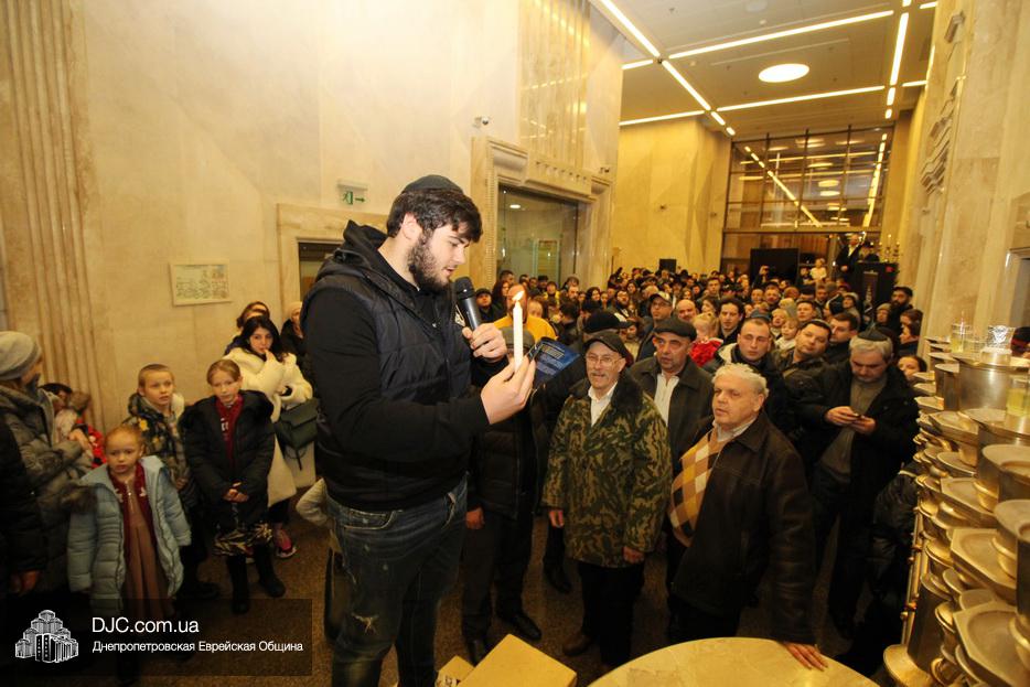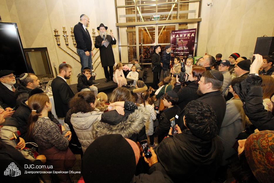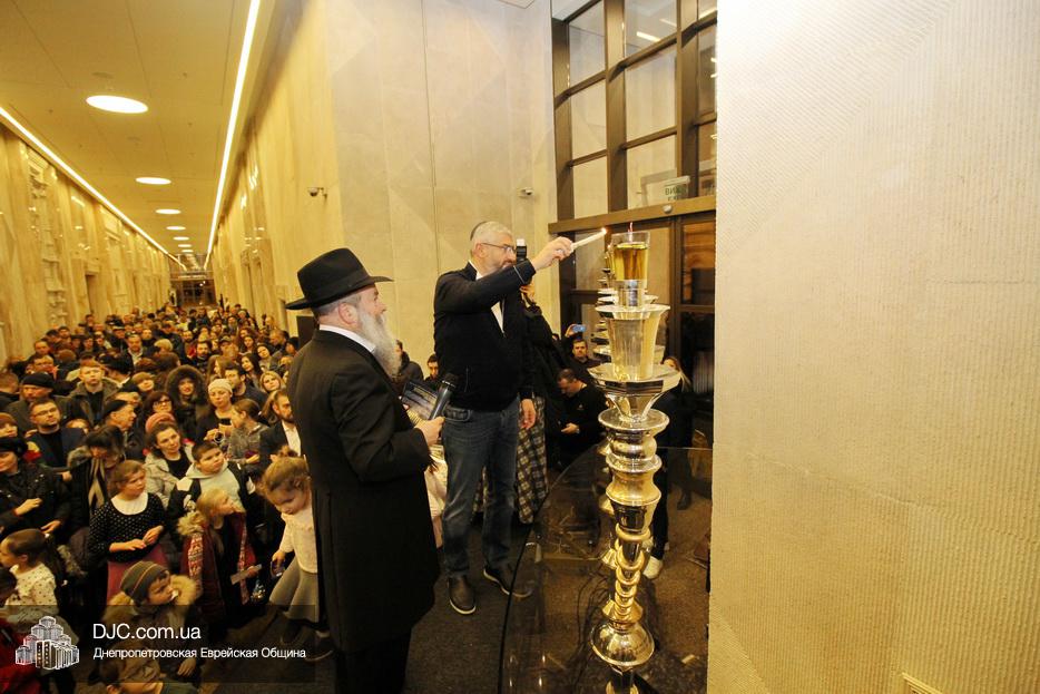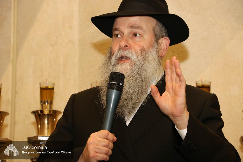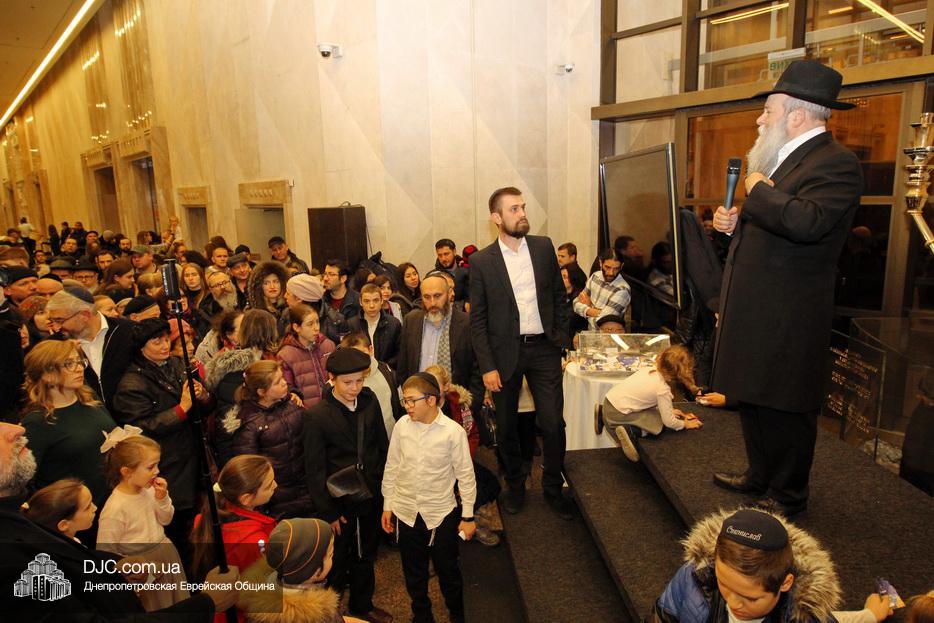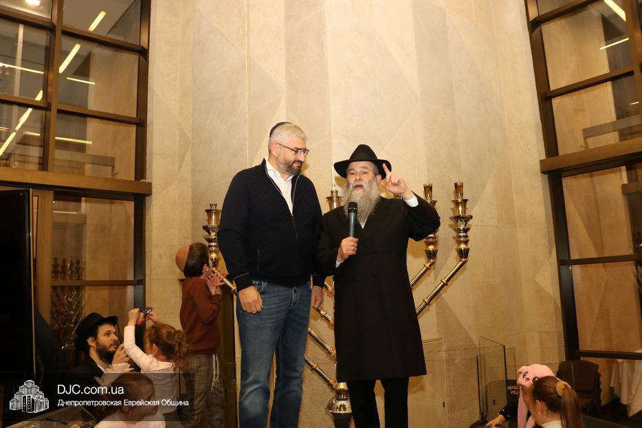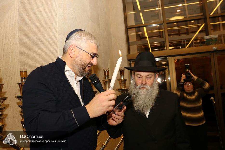 Главный раввин Днепра и региона Шмуэль Каминецкий тепло поздравил всех пришедших на праздник и пригласил для зажжения свечей седьмого вечера Хануки члена Попечительского Совета еврейской общины Днепра Гедалью Хаима (Геннадия Борисовича) Сороку.