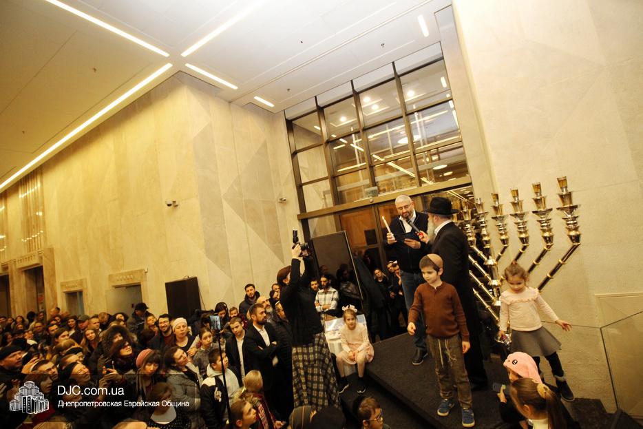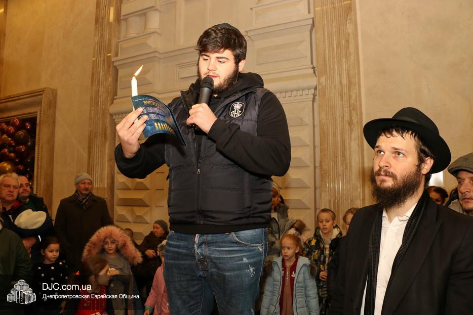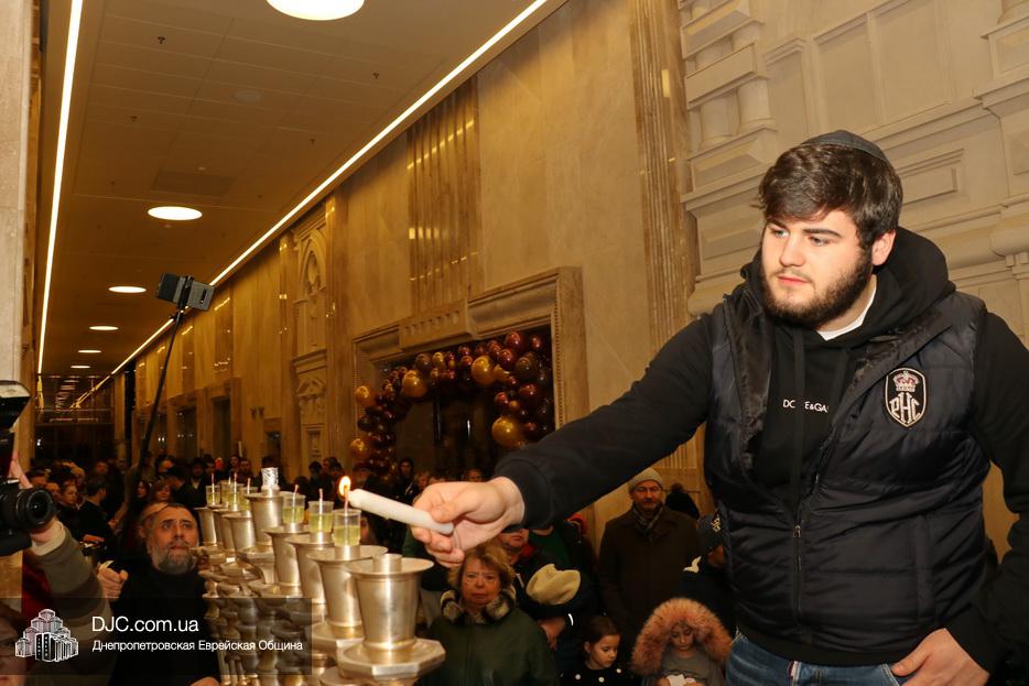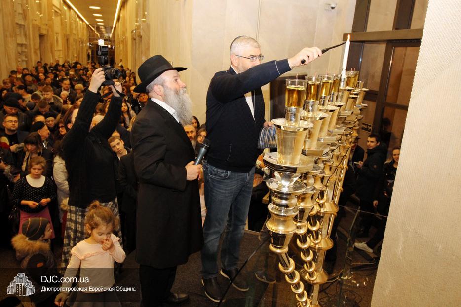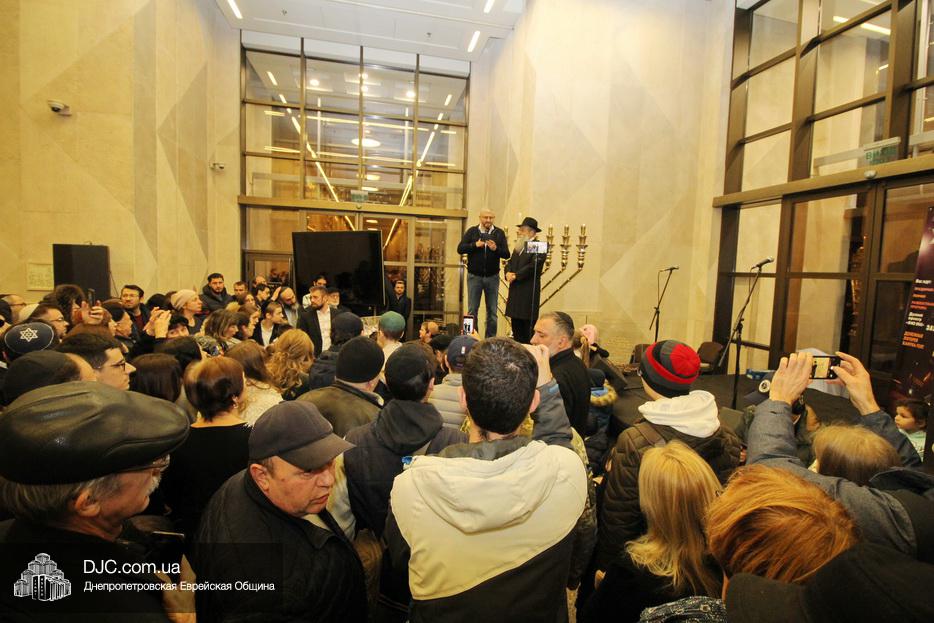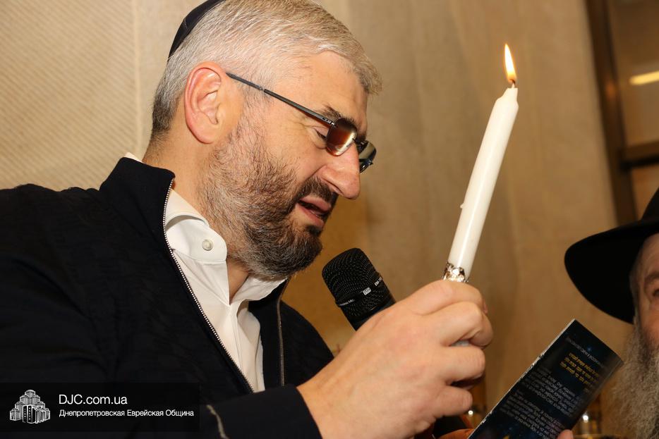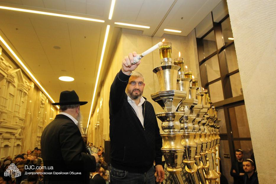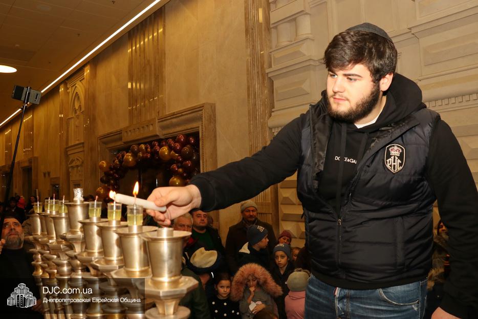 Главный раввин Днепра и региона Шмуэль Каминецкий тепло поздравил всех пришедших на праздник и пригласил для зажжения свечей седьмого вечера Хануки члена Попечительского Совета еврейской общины Днепра Гедалью Хаима (Геннадия Борисовича) Сороку.