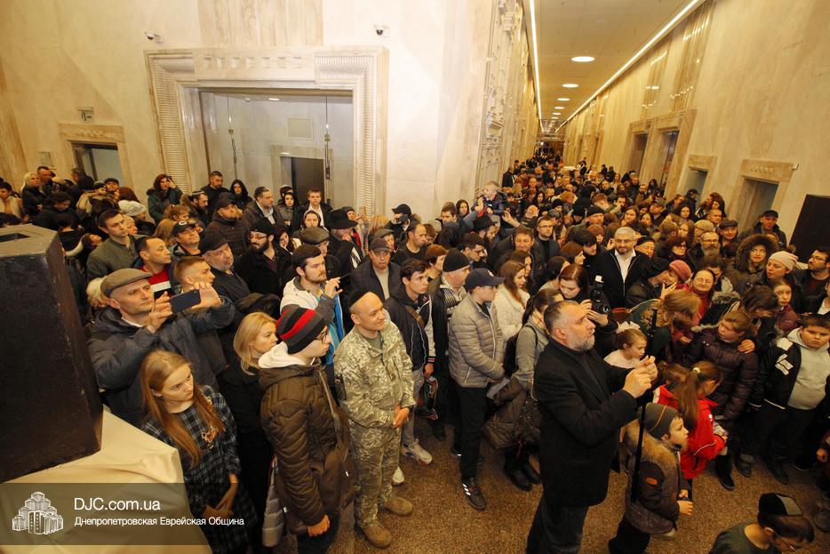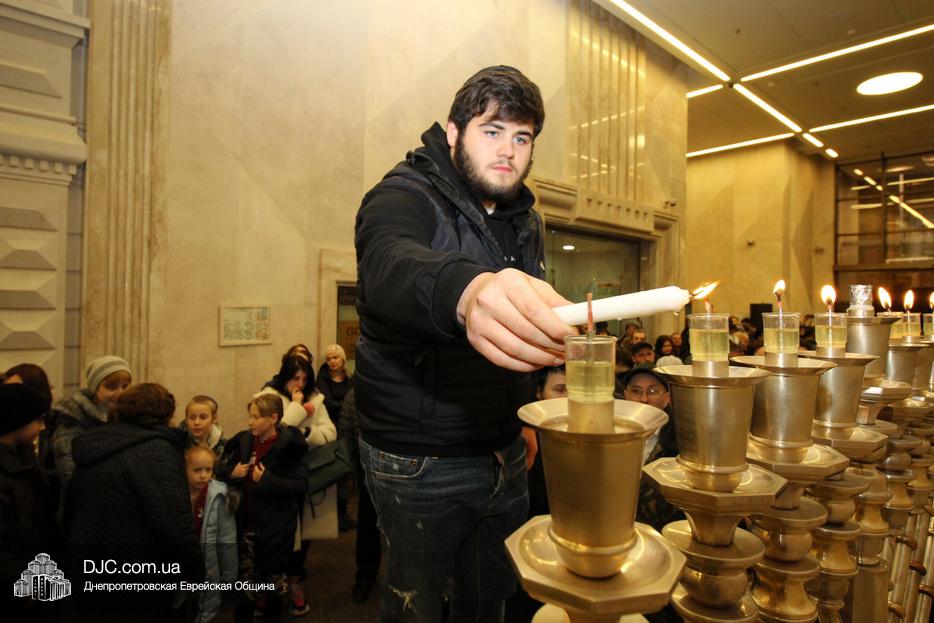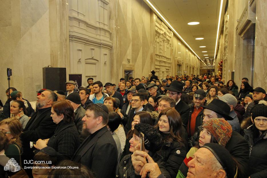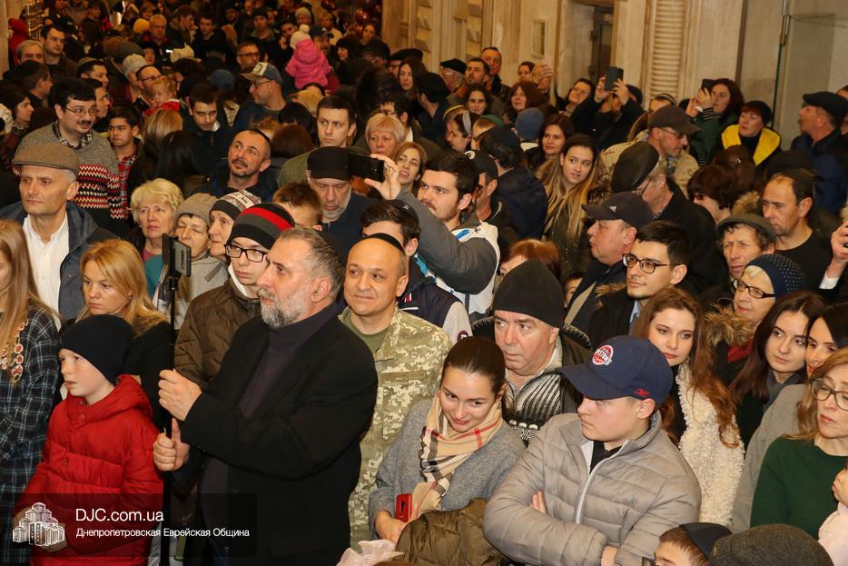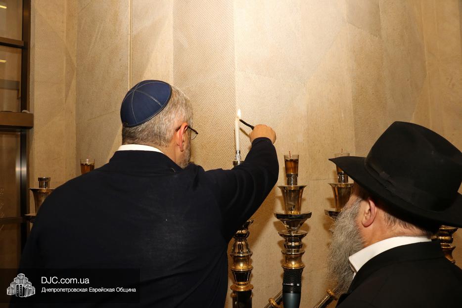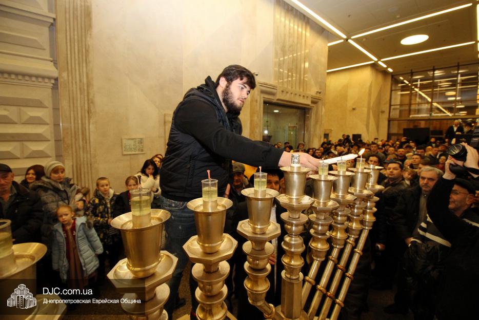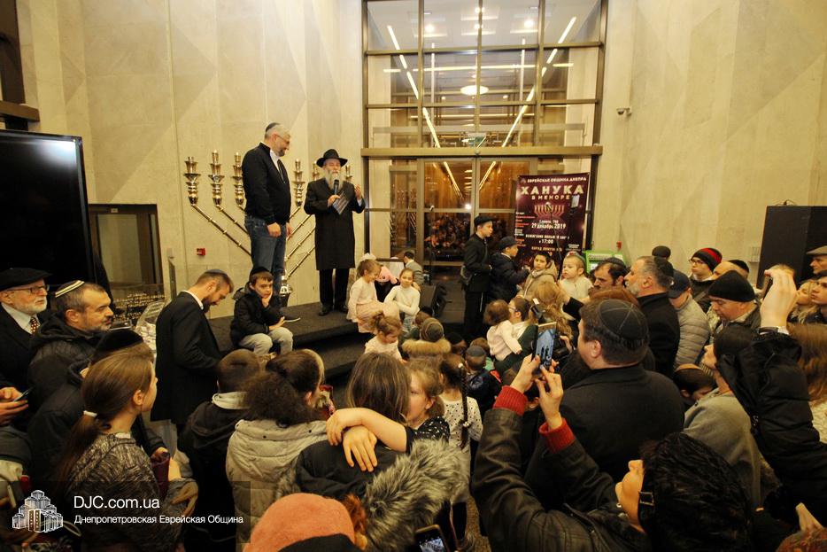 Главный раввин Днепра и региона Шмуэль Каминецкий тепло поздравил всех пришедших на праздник и пригласил для зажжения свечей седьмого вечера Хануки члена Попечительского Совета еврейской общины Днепра Гедалью Хаима (Геннадия Борисовича) Сороку.