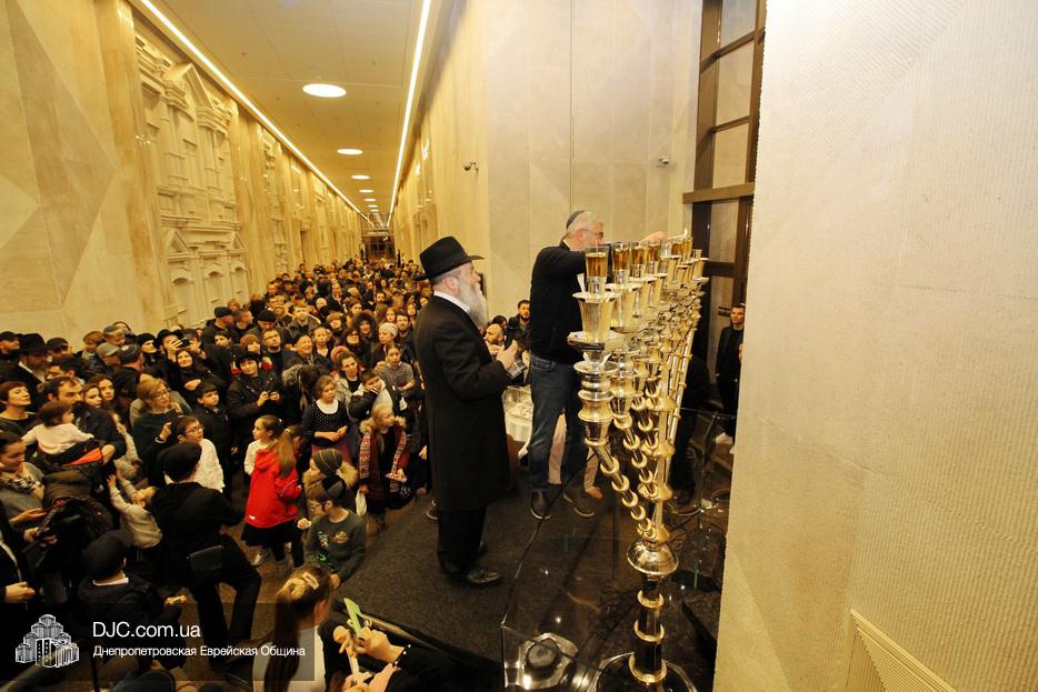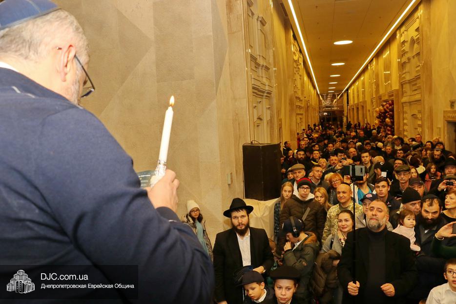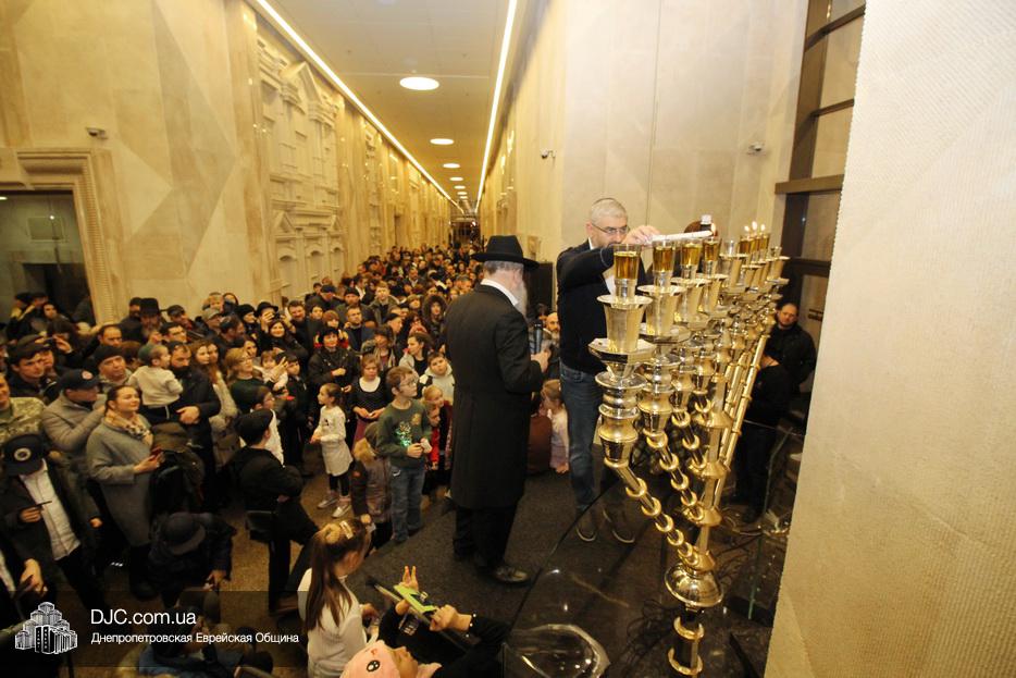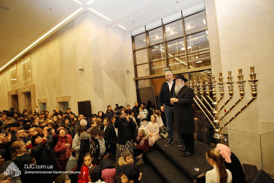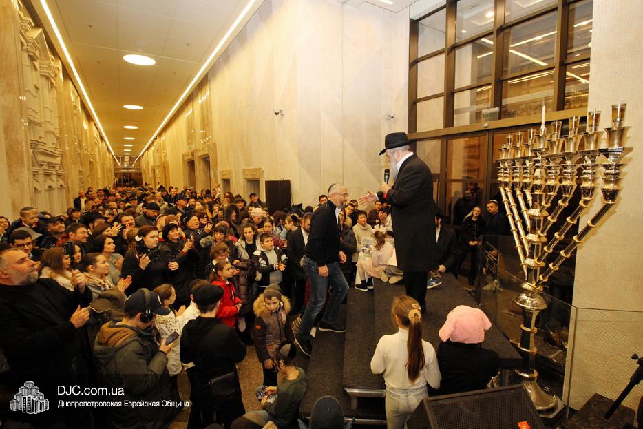 Главным событием седьмого вечера праздника Ханука в Днепре стало зажжение семи свечей на главных ханукиях города, установленных в крупнейшем в мире еврейском центре «Менора».