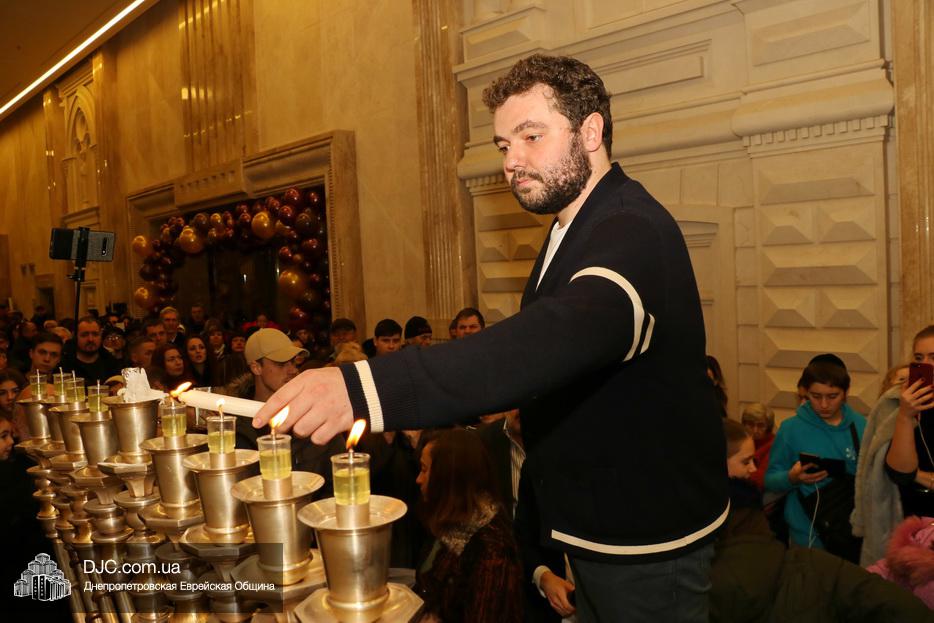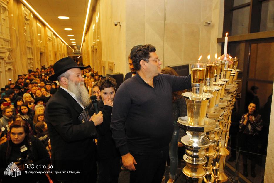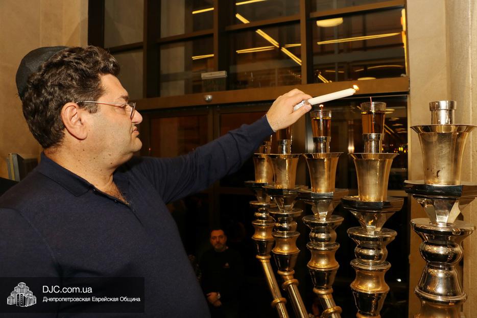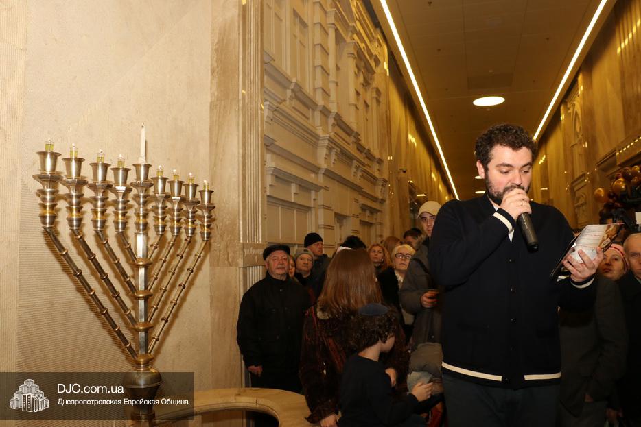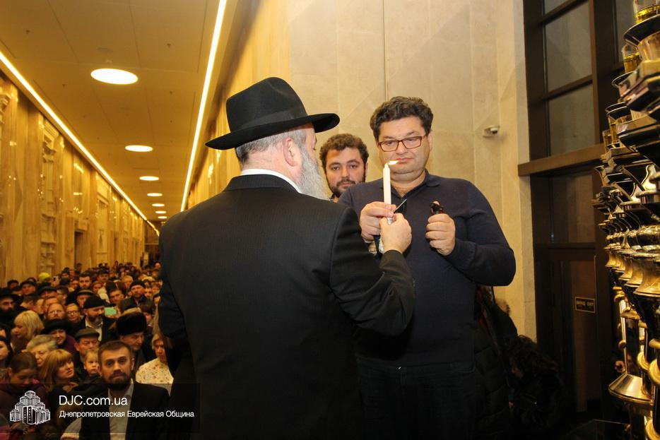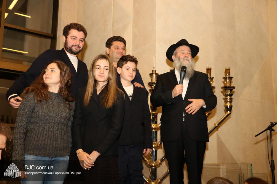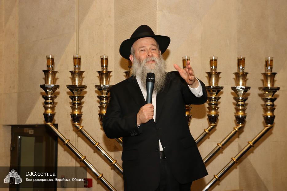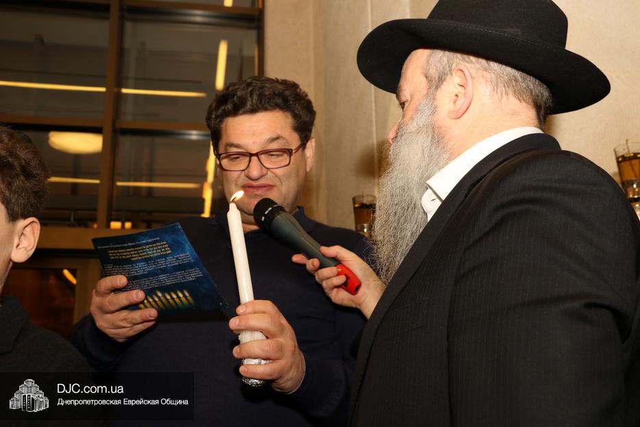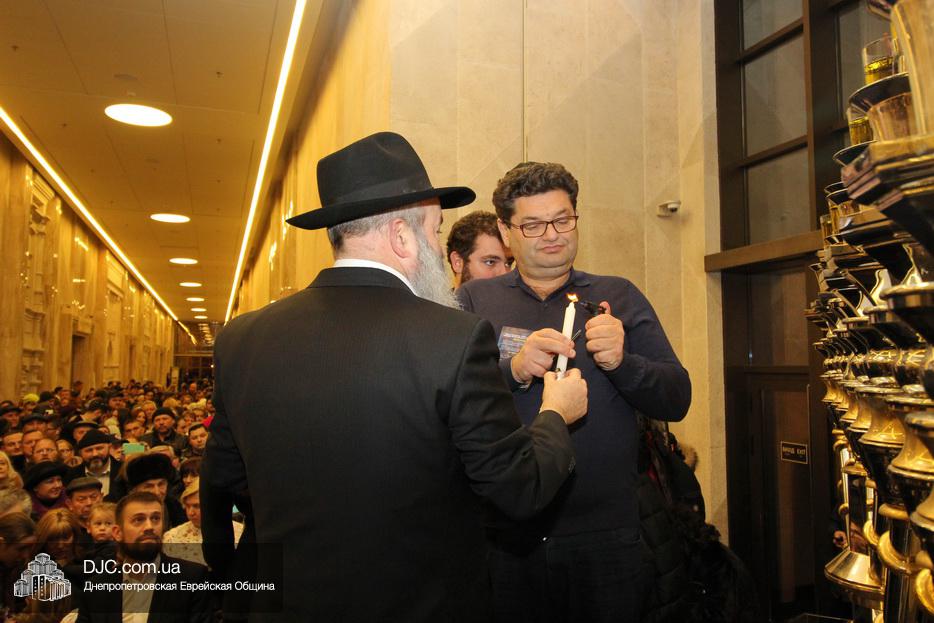 Главный раввин Днепра и региона Шмуэль Каминецкий тепло поздравил всех пришедших на праздник и пригласил для зажжения свечей восьмого вечера Хануки члена Попечительского Совета еврейской общины Днепра Вадима Владимировича Ермолаева.