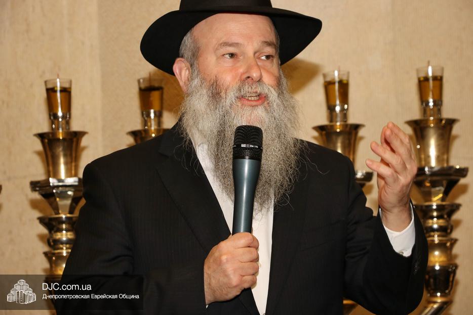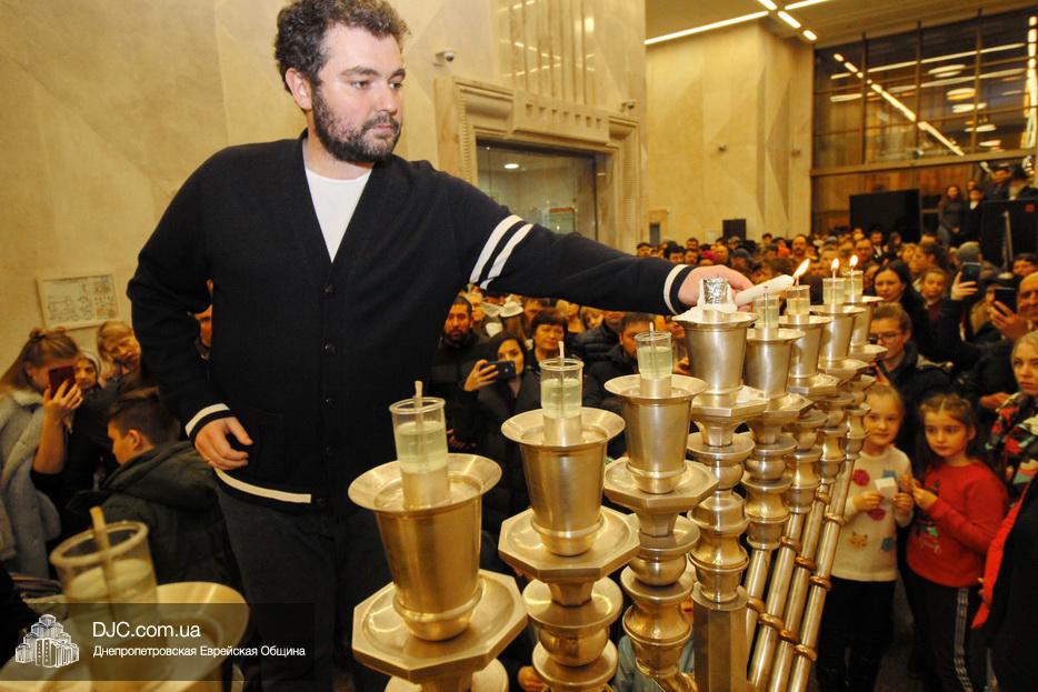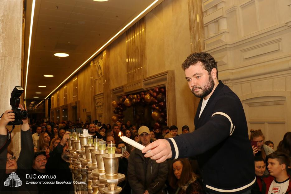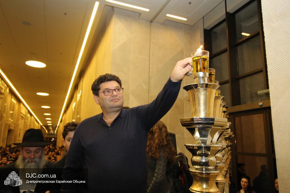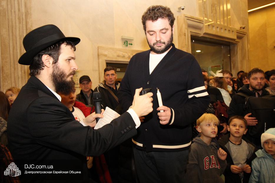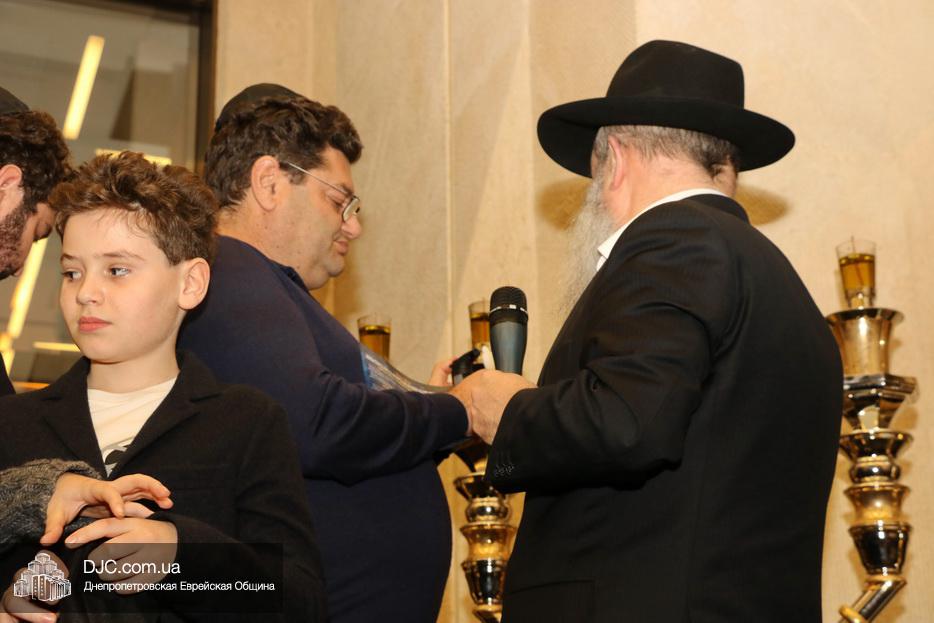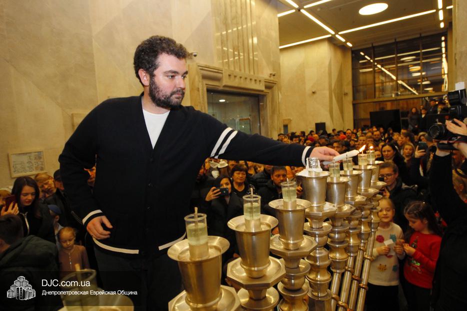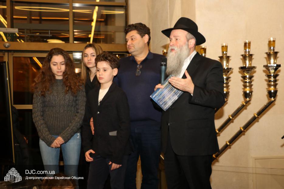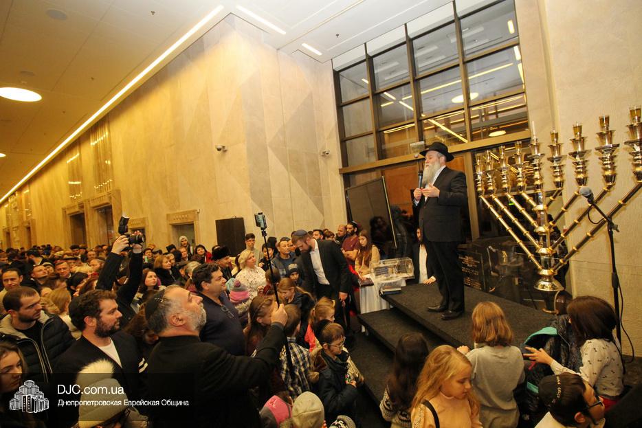 Главный раввин Днепра и региона Шмуэль Каминецкий тепло поздравил всех пришедших на праздник и пригласил для зажжения свечей восьмого вечера Хануки члена Попечительского Совета еврейской общины Днепра Вадима Владимировича Ермолаева.