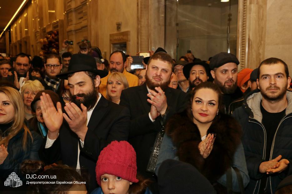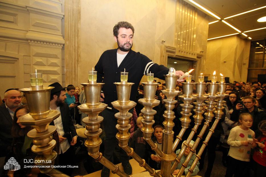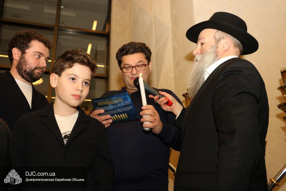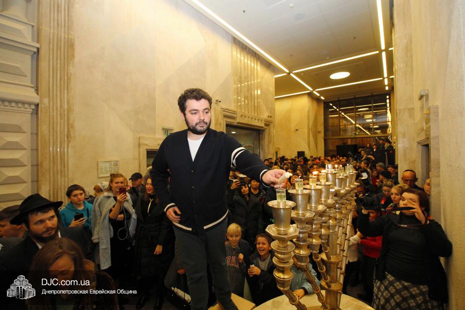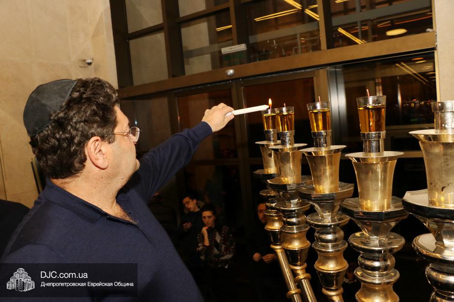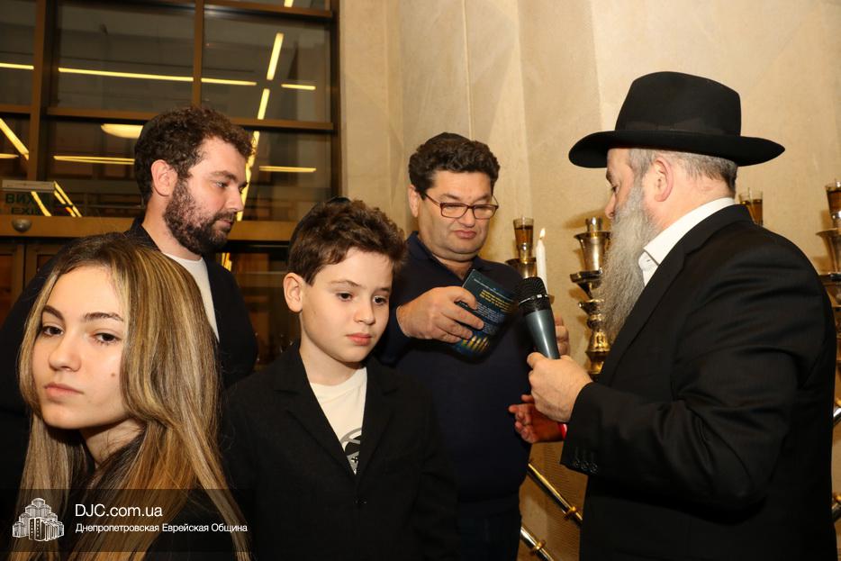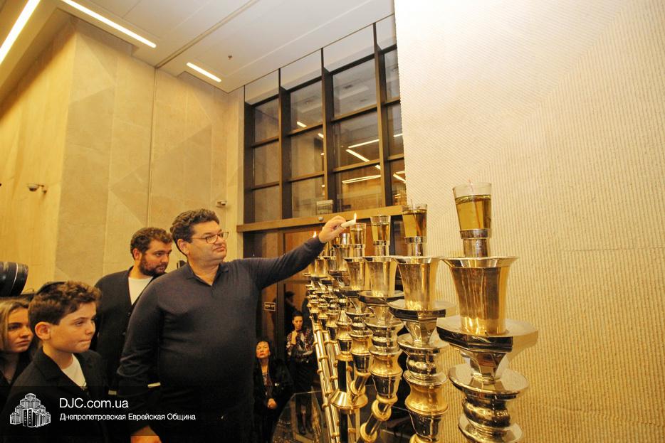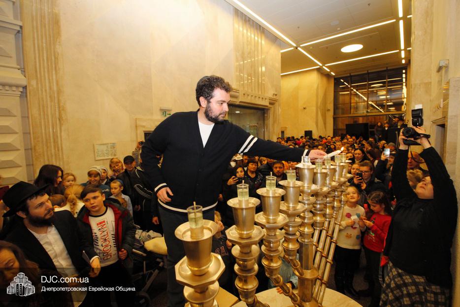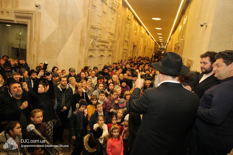 Главный раввин Днепра и региона Шмуэль Каминецкий тепло поздравил всех пришедших на праздник и пригласил для зажжения свечей восьмого вечера Хануки члена Попечительского Совета еврейской общины Днепра Вадима Владимировича Ермолаева.