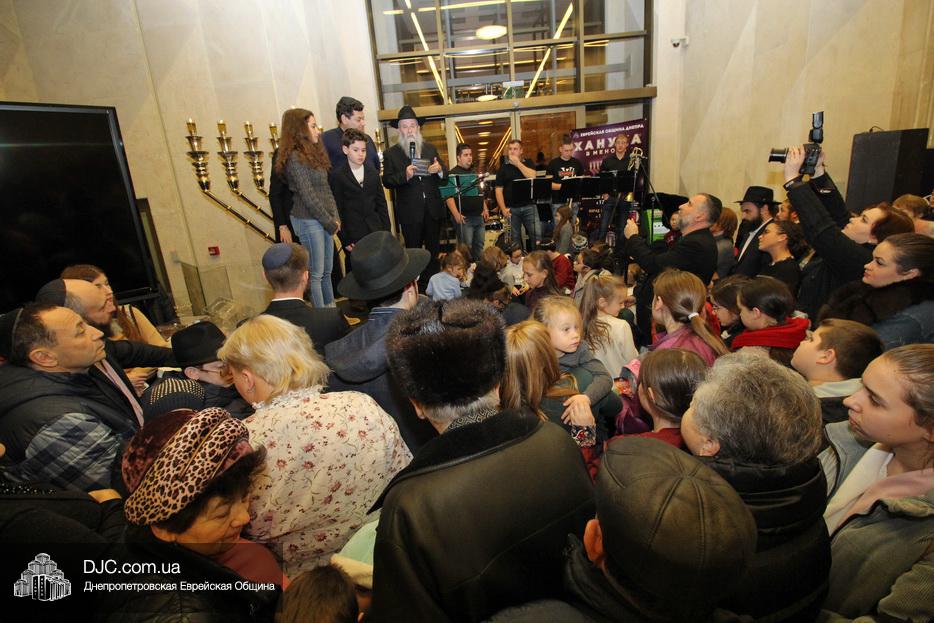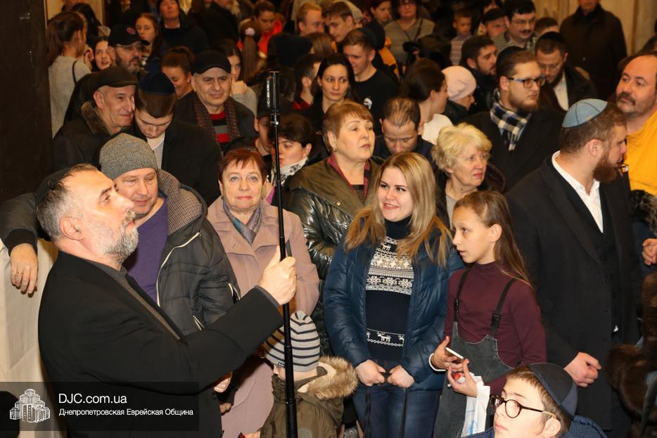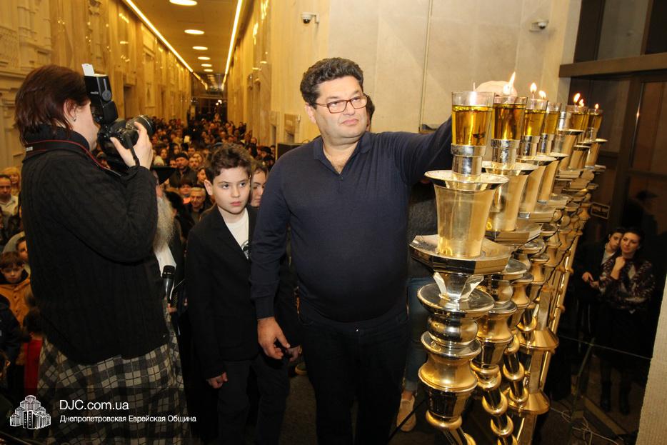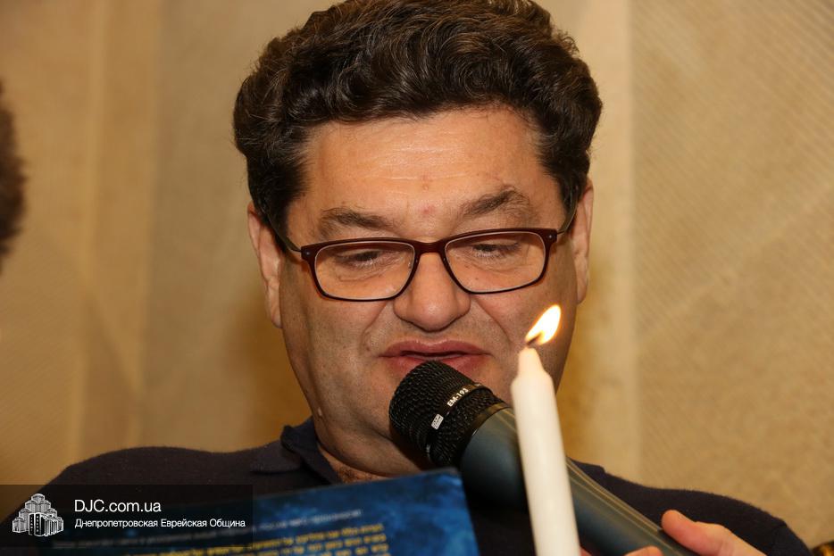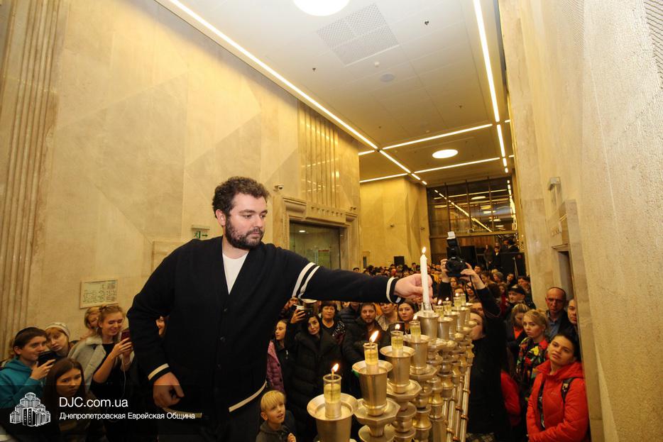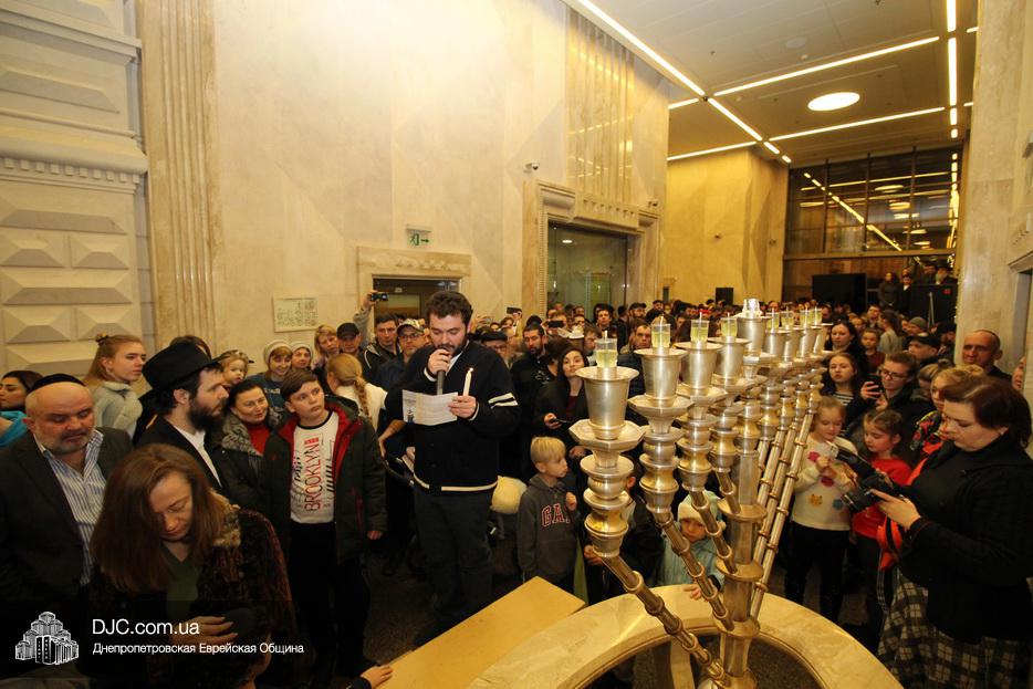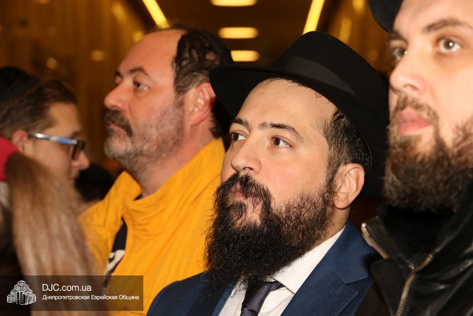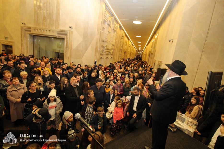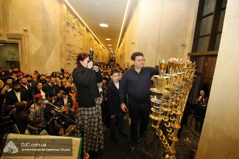 Главный раввин Днепра и региона Шмуэль Каминецкий тепло поздравил всех пришедших на праздник и пригласил для зажжения свечей восьмого вечера Хануки члена Попечительского Совета еврейской общины Днепра Вадима Владимировича Ермолаева.