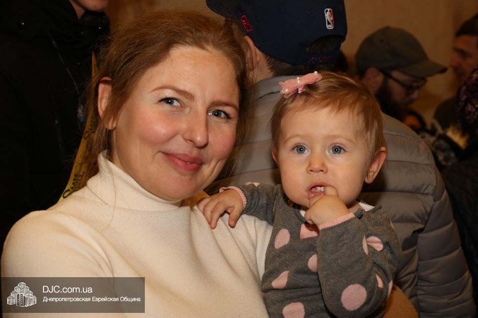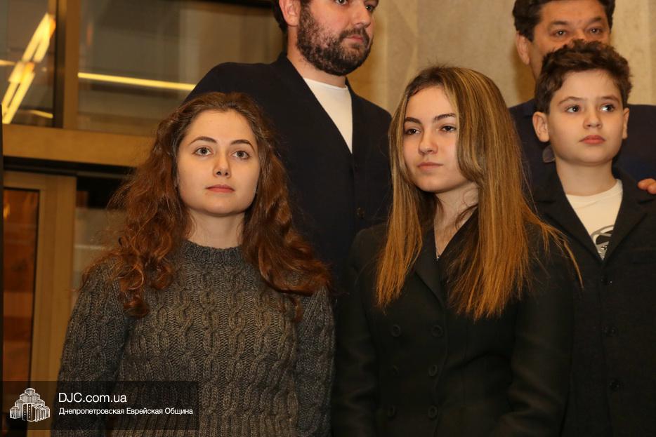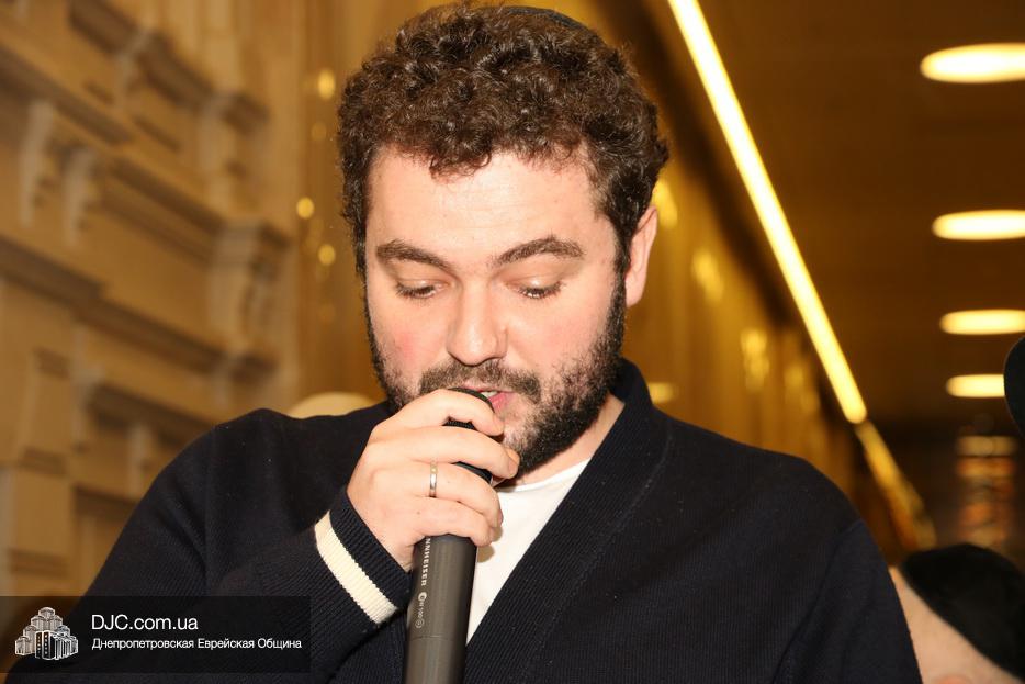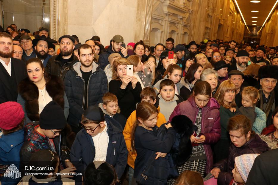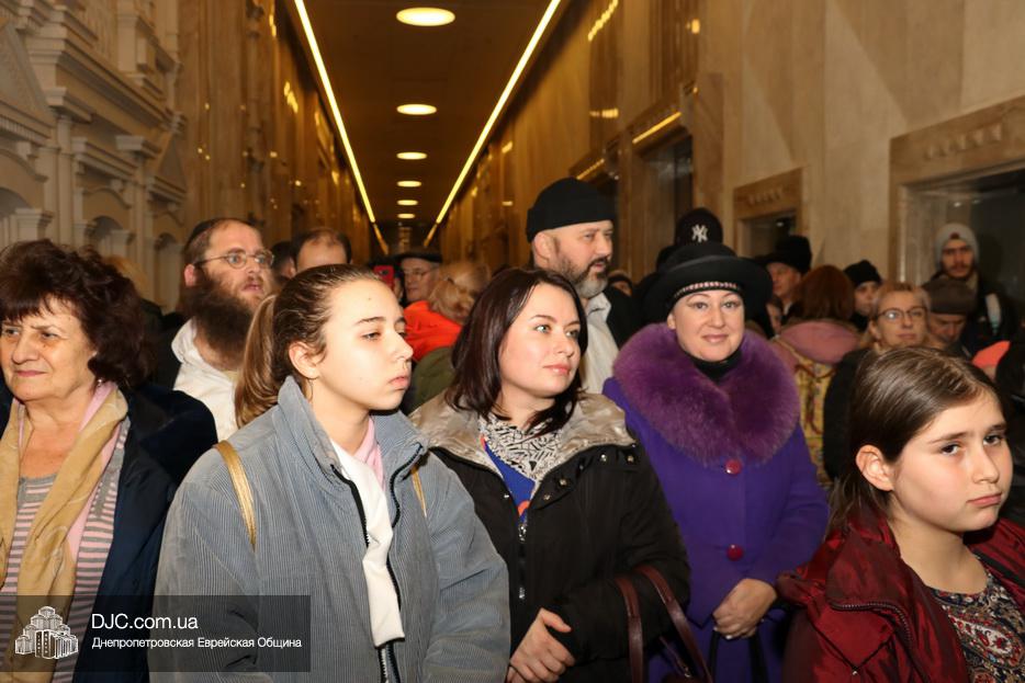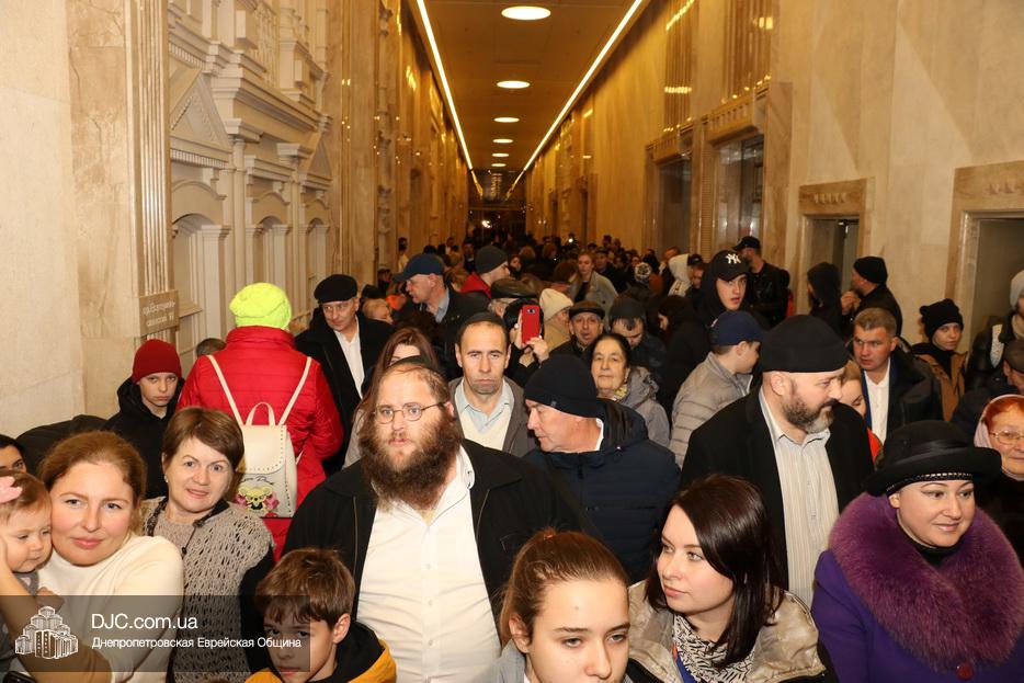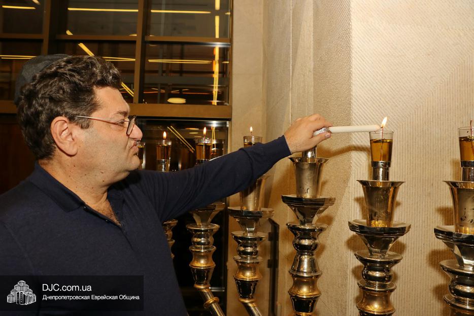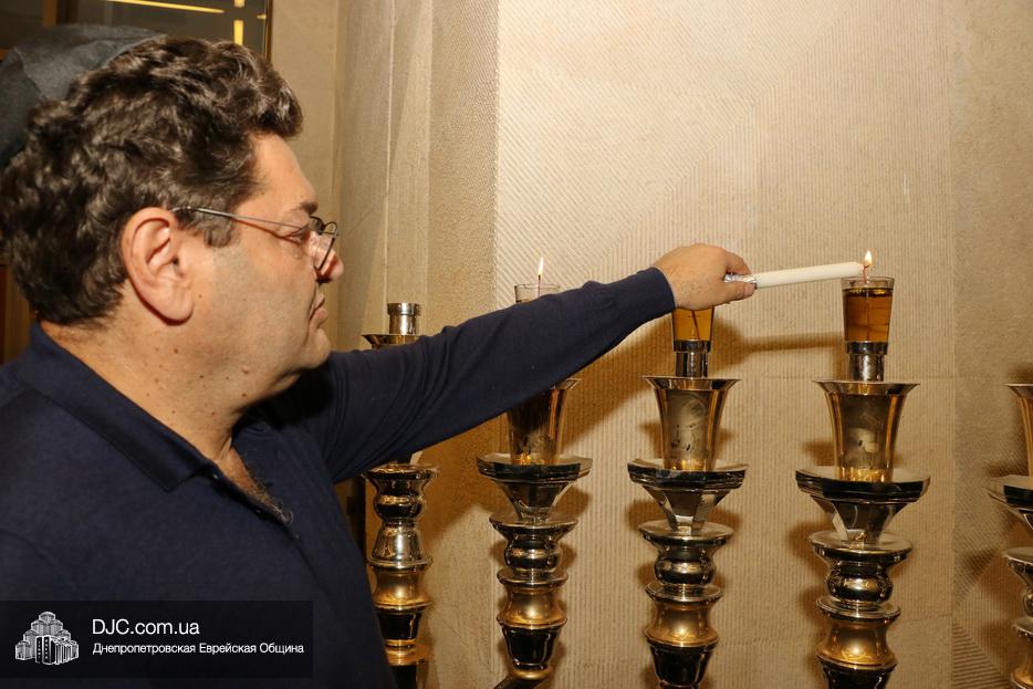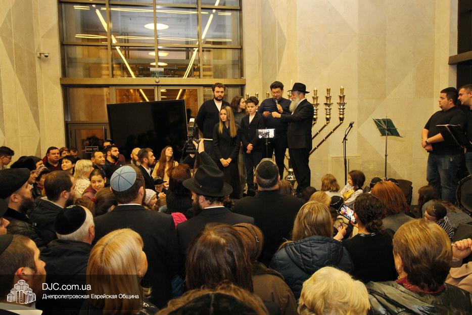 Главный раввин Днепра и региона Шмуэль Каминецкий тепло поздравил всех пришедших на праздник и пригласил для зажжения свечей восьмого вечера Хануки члена Попечительского Совета еврейской общины Днепра Вадима Владимировича Ермолаева.