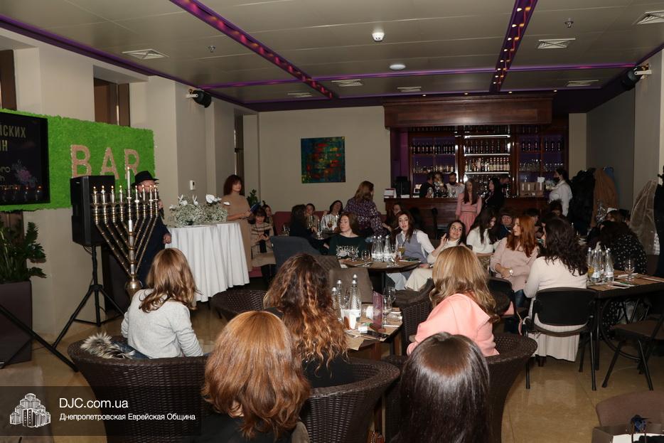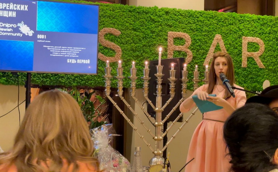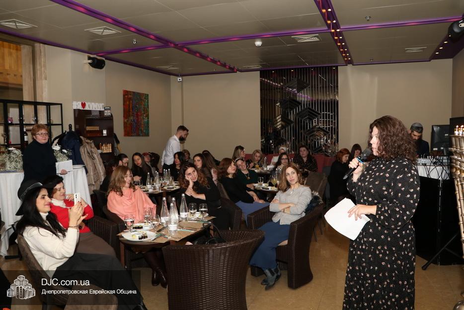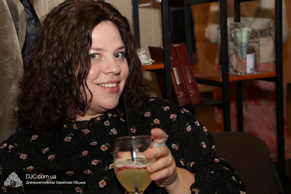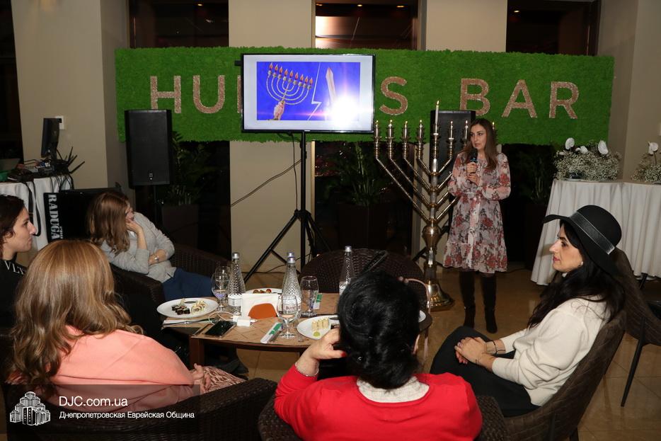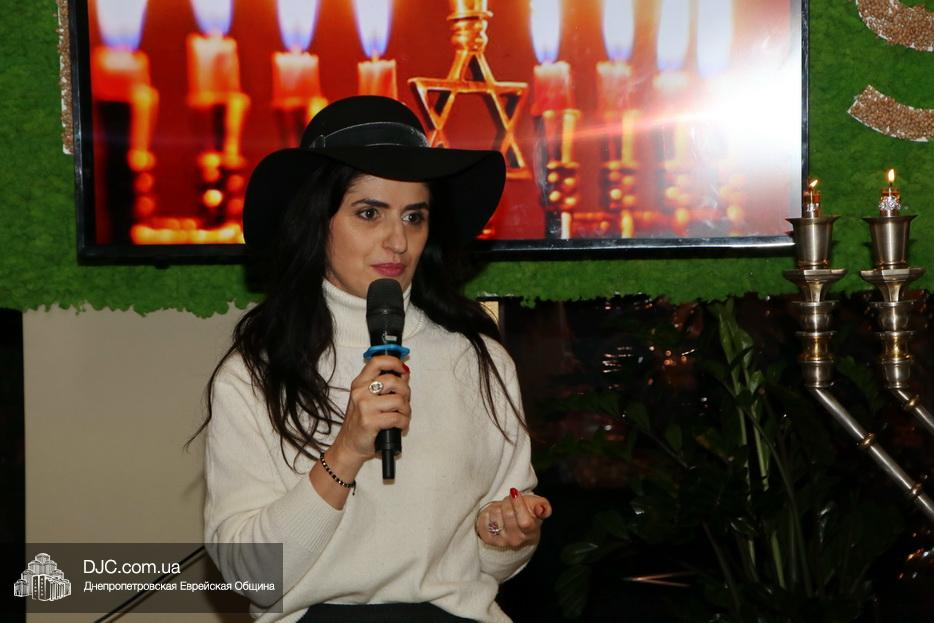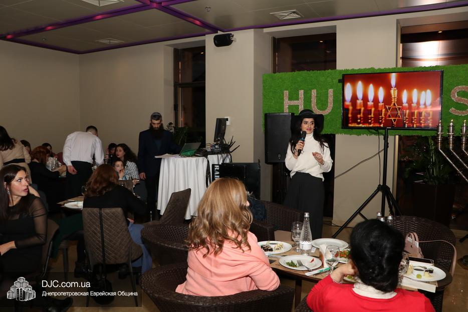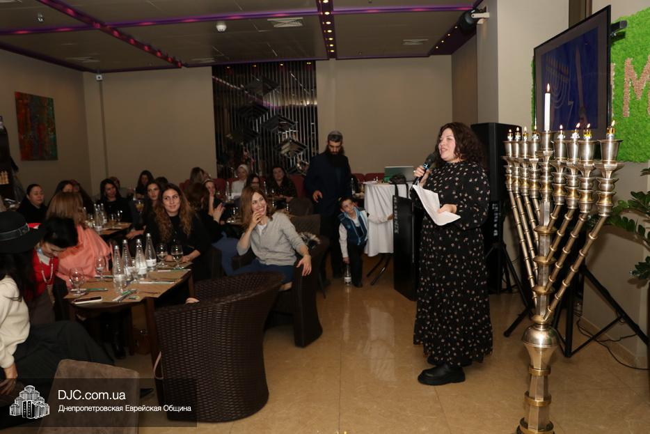 Ведущая вечера Нехама Момот пригласила всех присутствующих дам отведать ханукальные коктейли, рассказала о мероприятии, которое смогло состояться благодаря поддержке Еврейской общины Днепра и Главного раввина Шмуэля Каминецкого и ребецн Ханы Каминецкой.