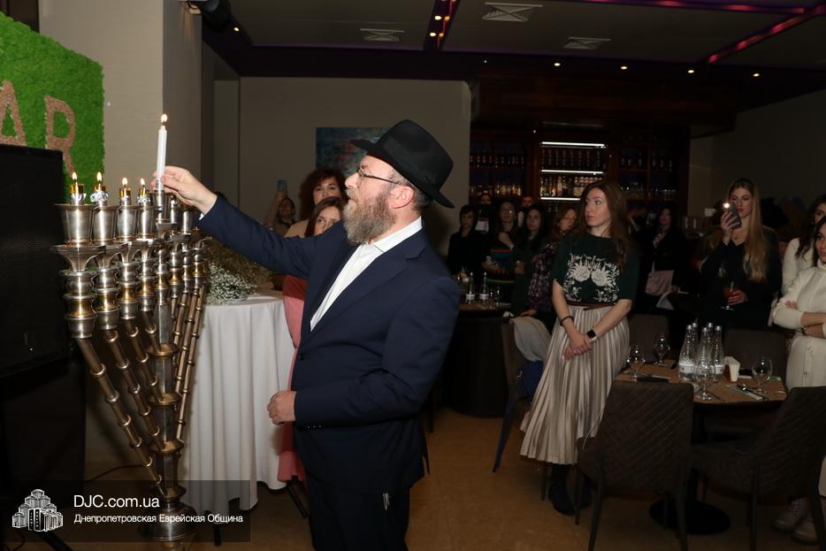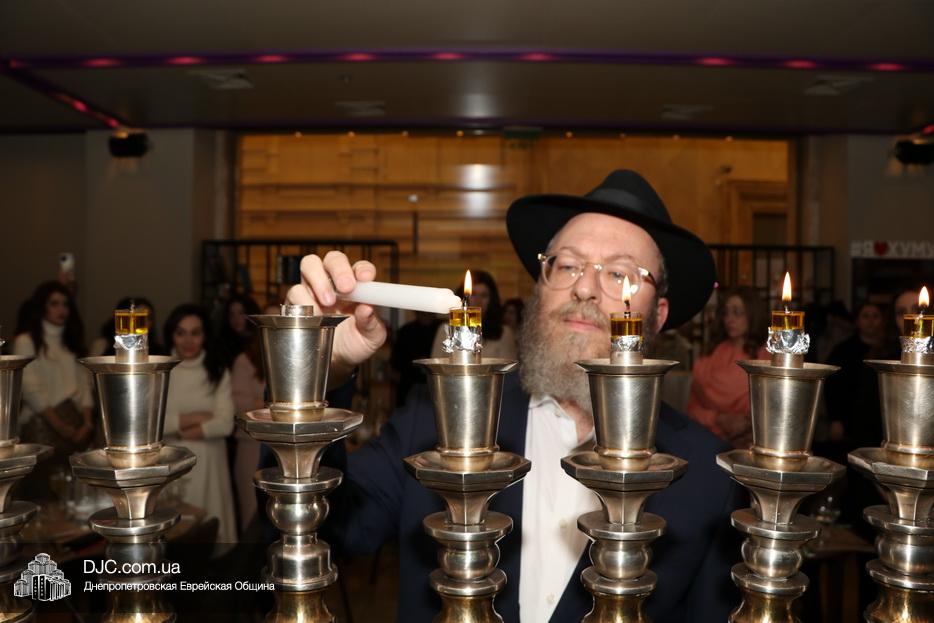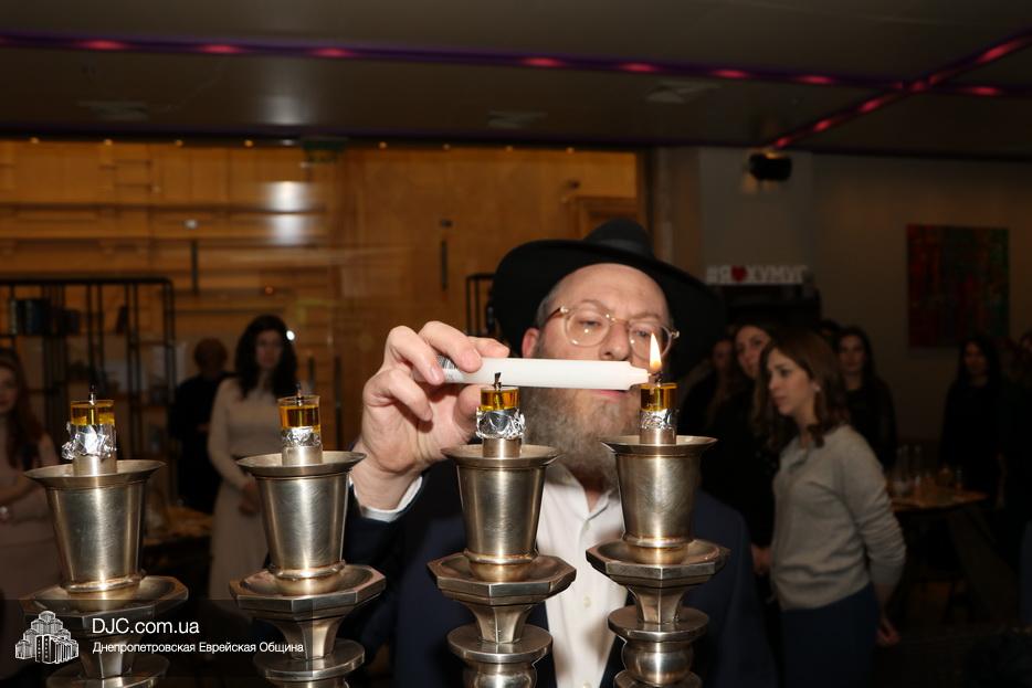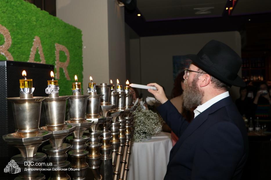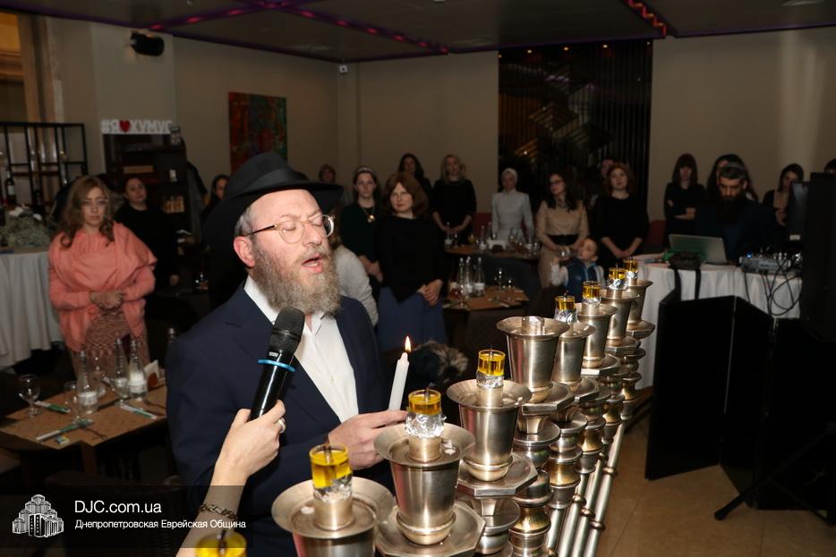 Вечер начался с зажжения восьми свечей Хануки раввином Мойше Лейб Вебером, который затем обратился ко всем присутствующим женщинам со словами поздравлений с праздником и рассказал о важности соблюдения правил и законов, даже в такой добрый и светлый праздник.
