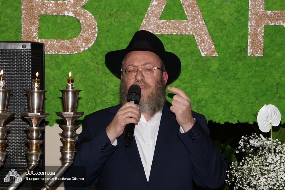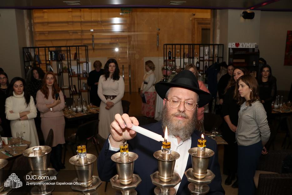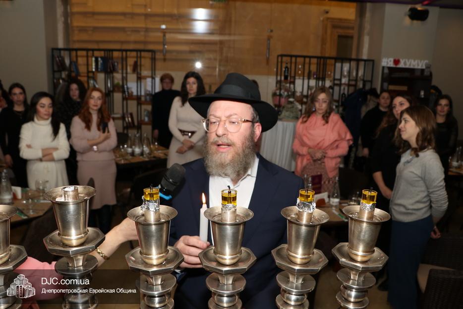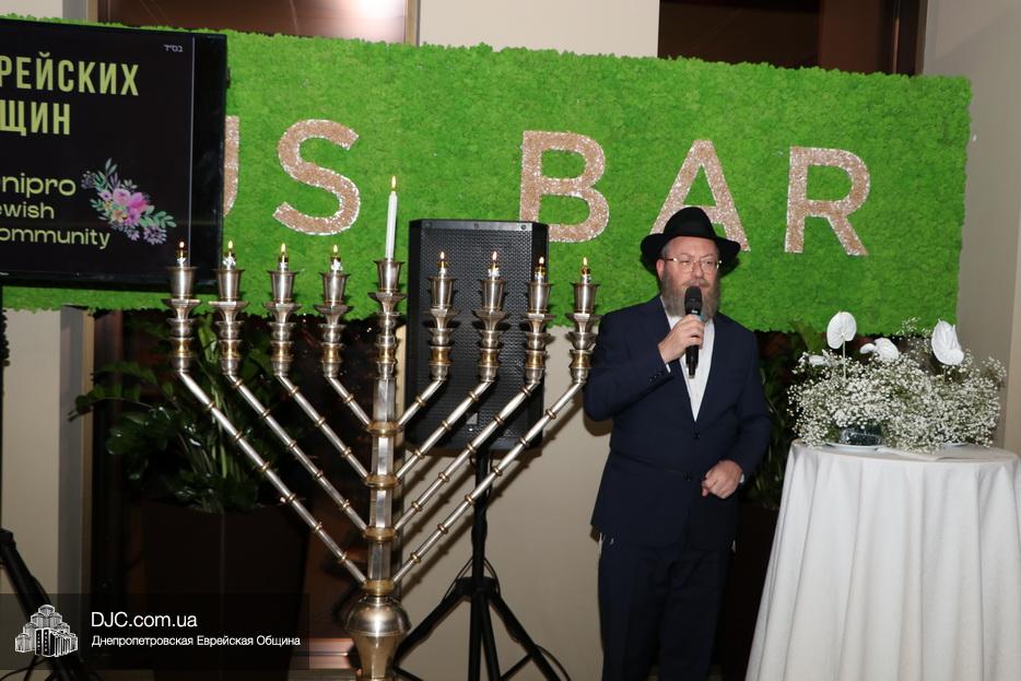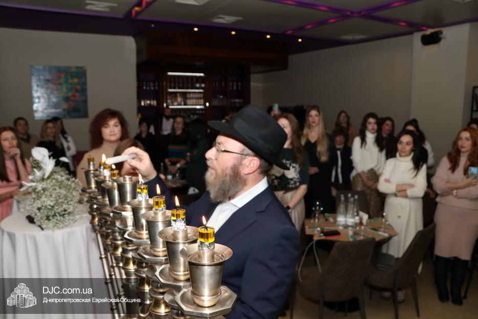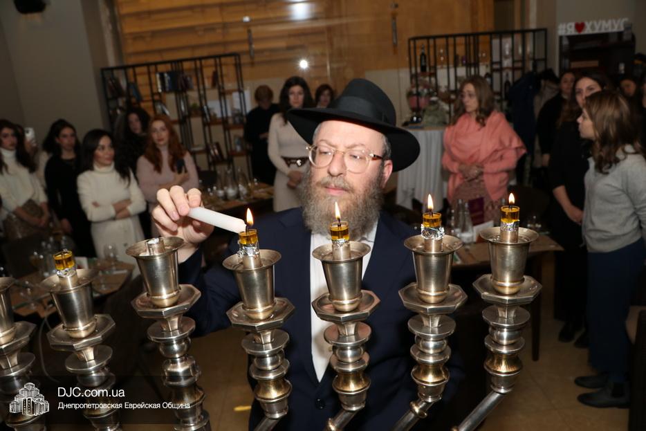 Вечер начался с зажжения восьми свечей Хануки раввином Мойше Лейб Вебером, который затем обратился ко всем присутствующим женщинам со словами поздравлений с праздником и рассказал о важности соблюдения правил и законов, даже в такой добрый и светлый праздник.