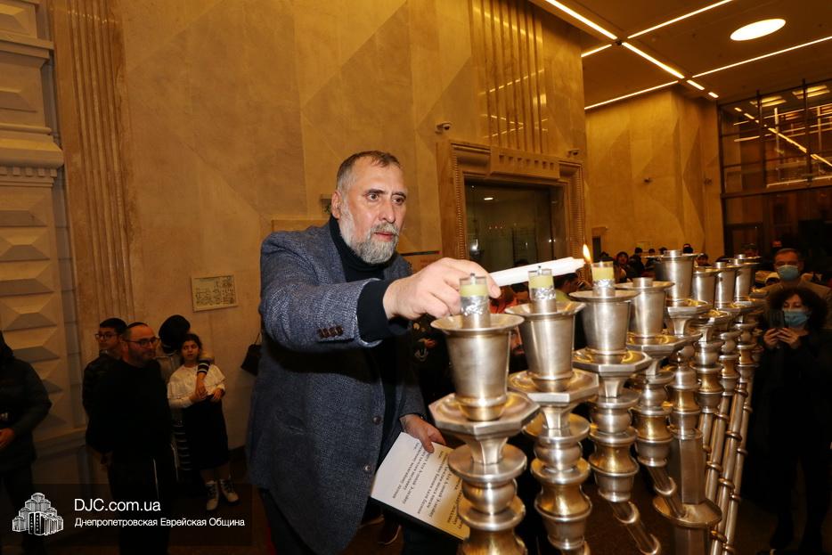 Третью свечу праздника Ханука 5782 года на главной ханукие общины в центре «Менора» торжественно зажег член Попечительского Совета Еврейской общины Днепра и президент Фонда «Шиурей Тора Любавич» Натан Золотаревский.