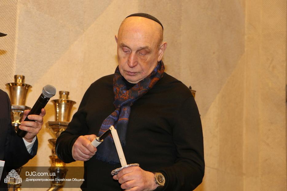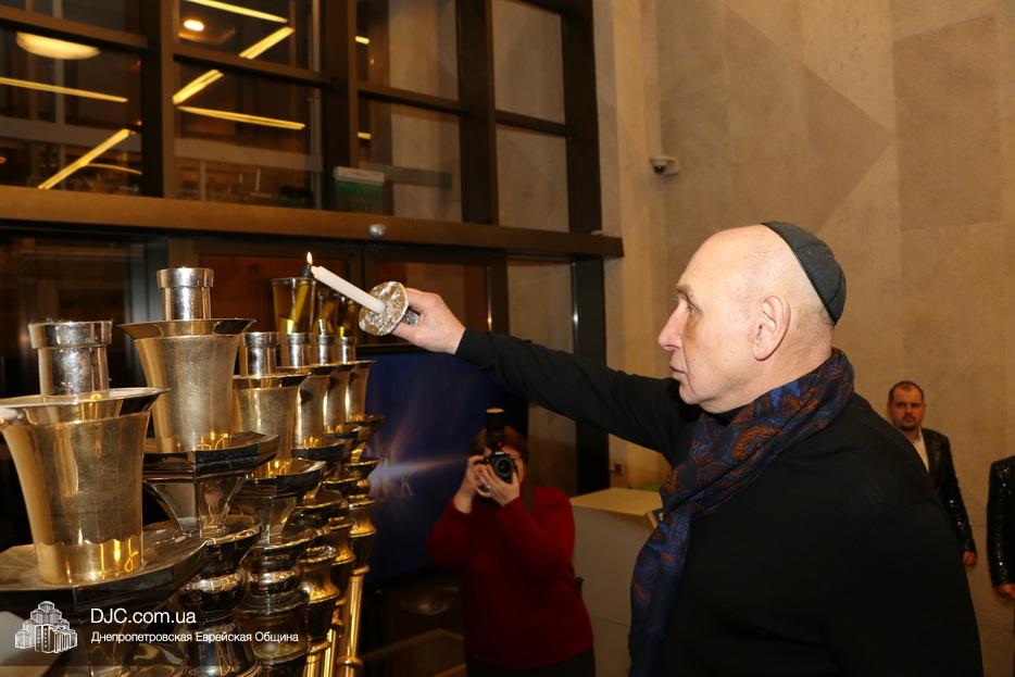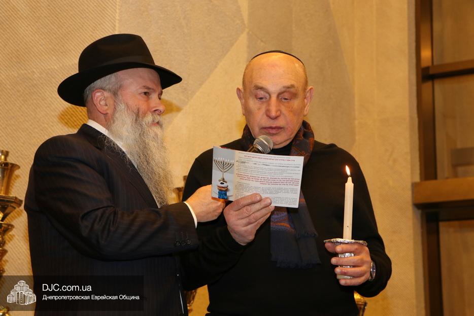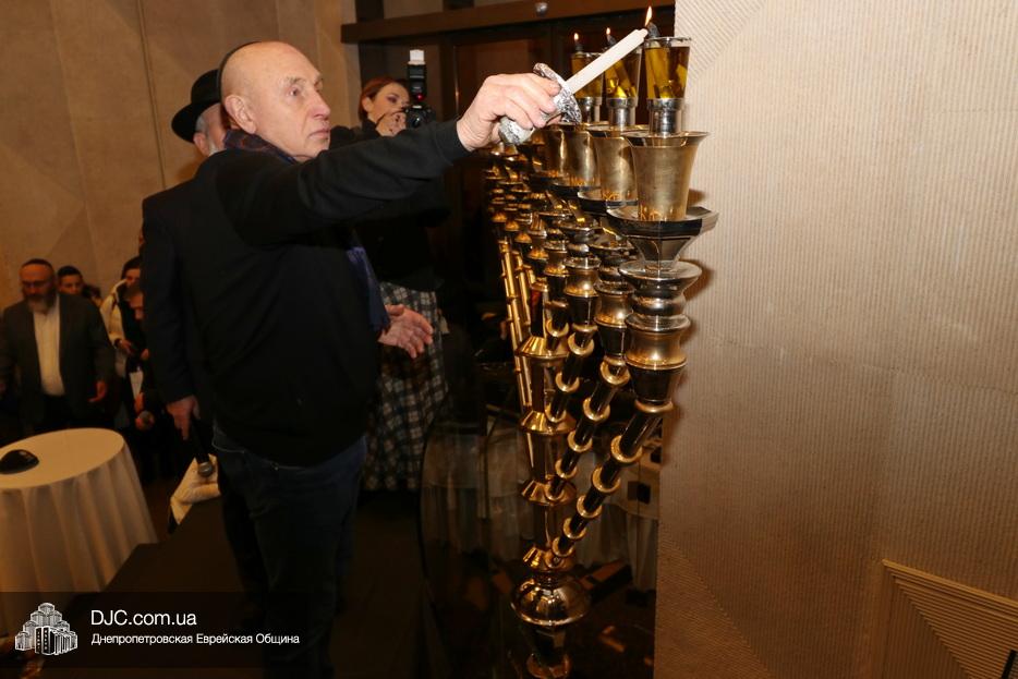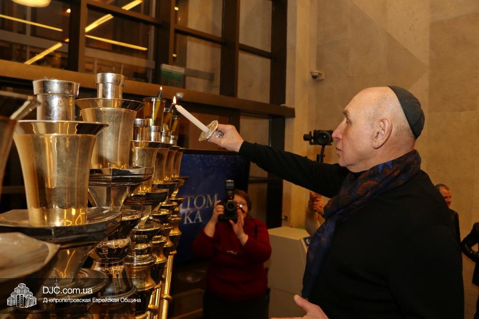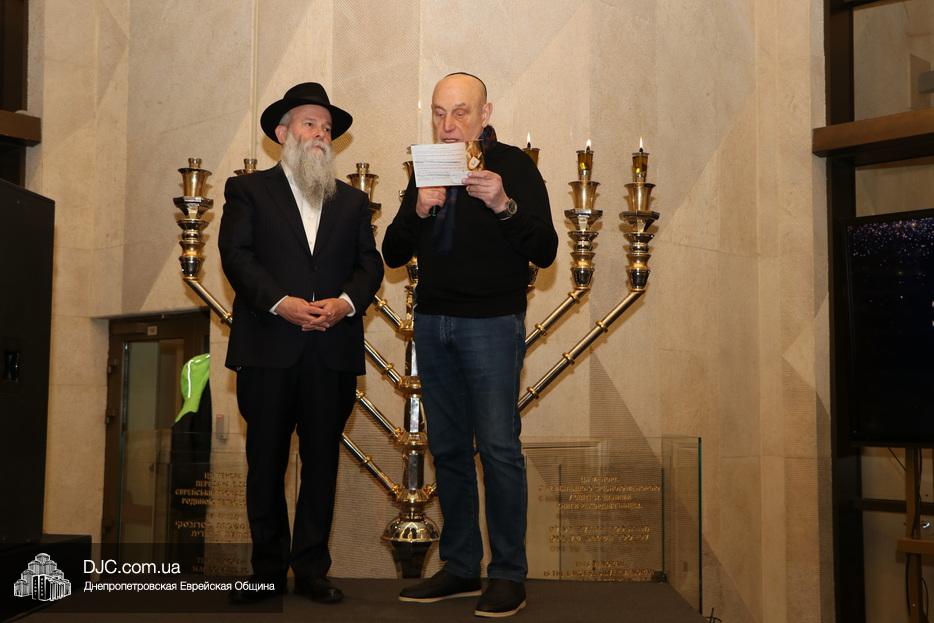 Главный раввин Днепра и региона Шмуэль Каминецкий тепло поздравил всех с праздником и пригласил для зажжения свечей третьего вечера Хануки члена Попечительского Совета еврейской общины Днепра Хайма (Виталия Матвеевича) Зайднера.