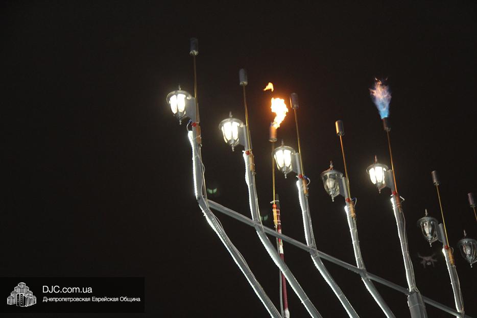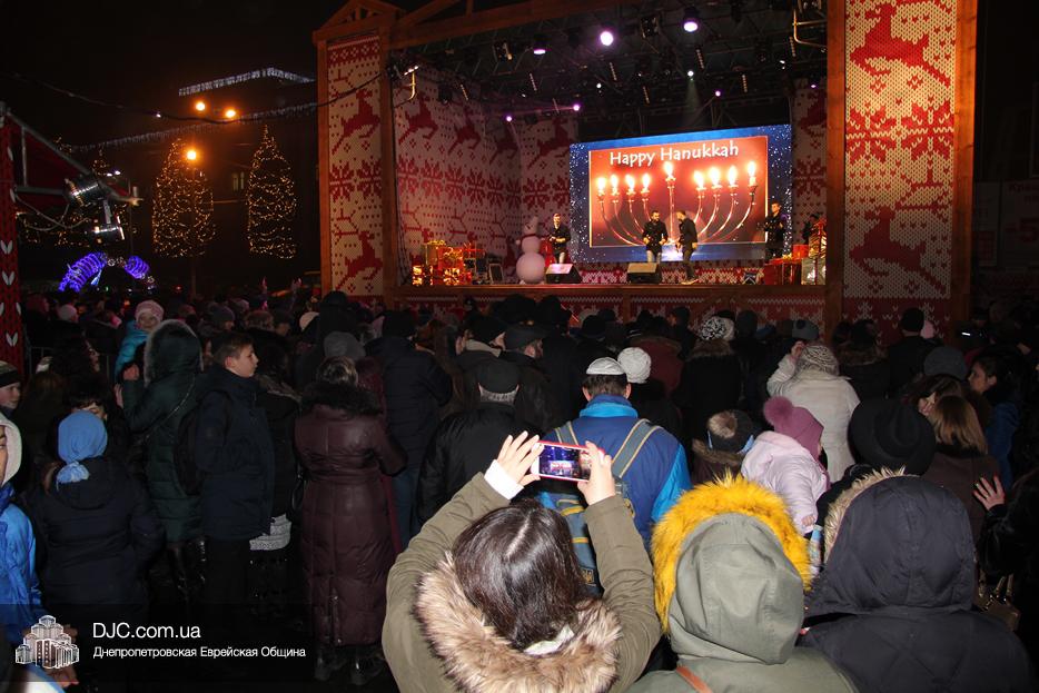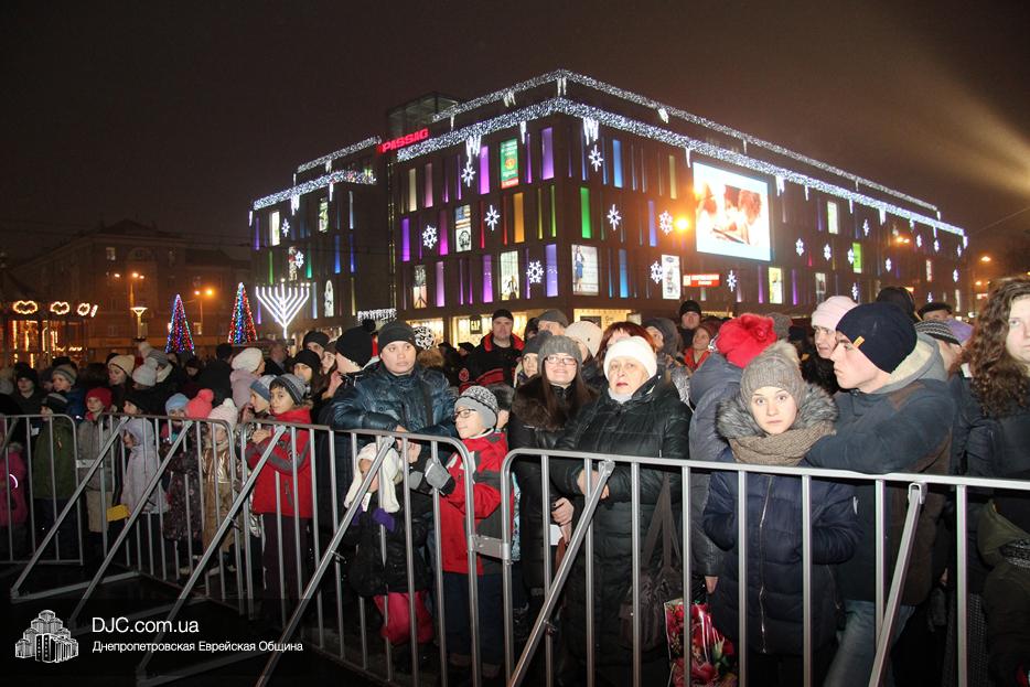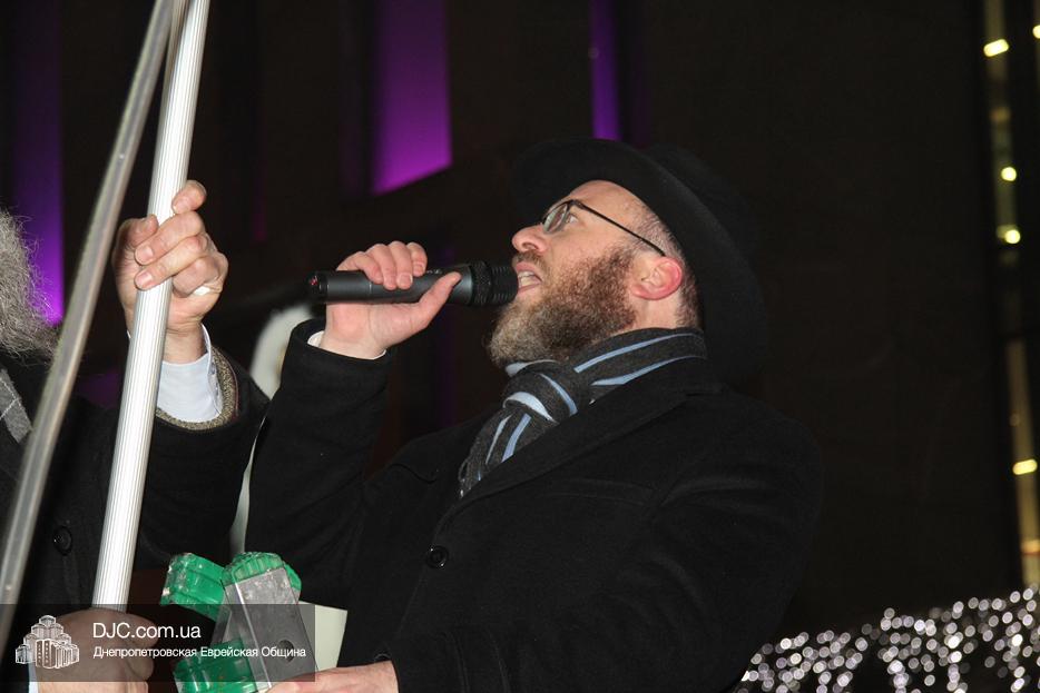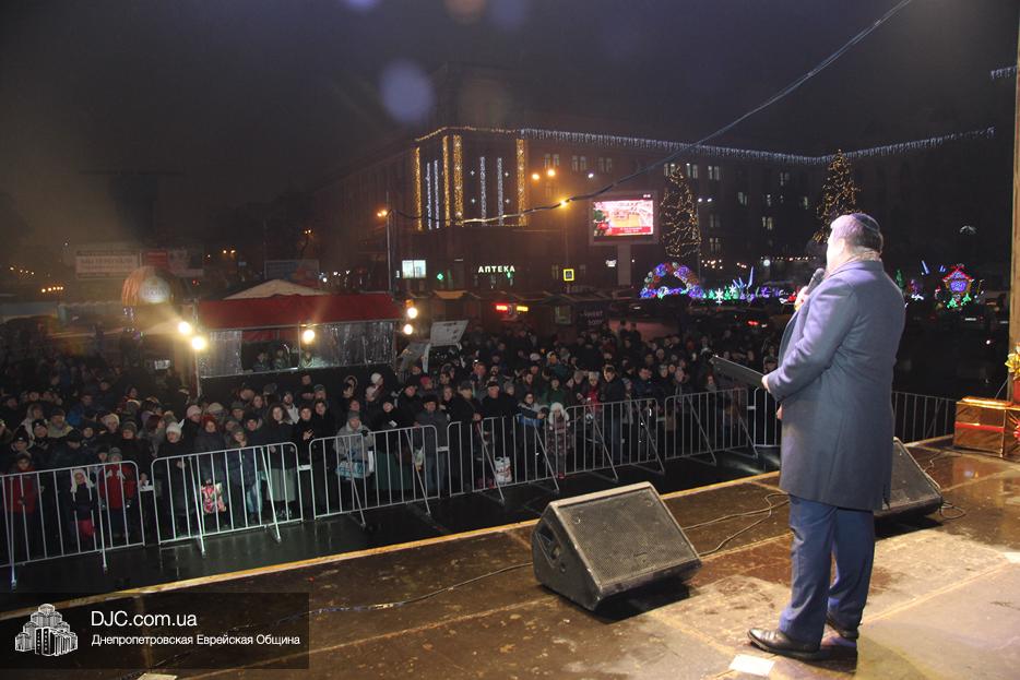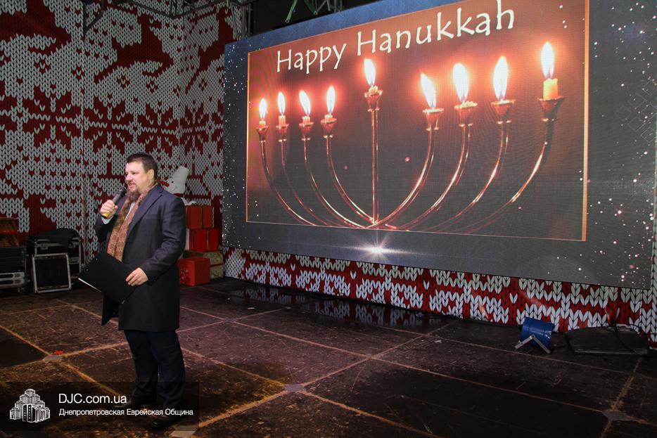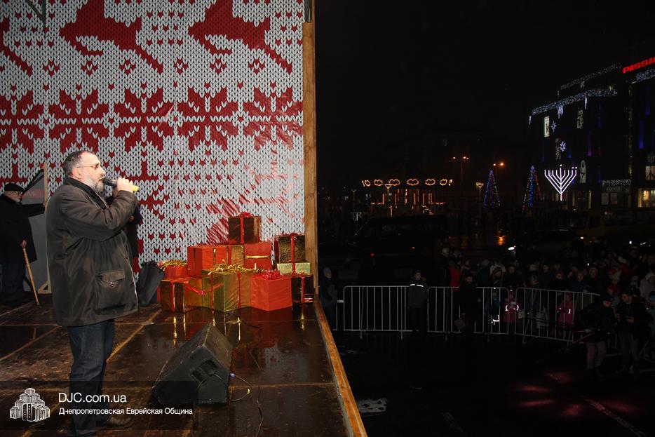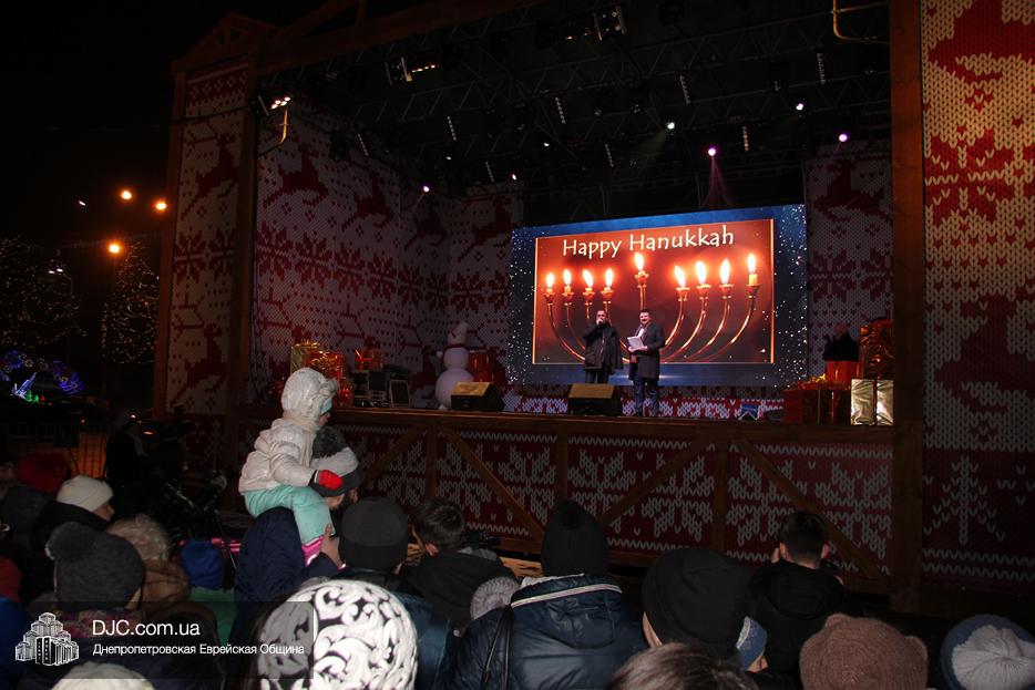 Начало праздника объявил председатель правления «Шиурей Тора Любавич» Дан Макогон, который взял на себя функции ведущего на главной праздничной сцене, затем был показан фрагмент обращения Любавического Ребе о значении Хануки и краткий видеофильм о распространении ее света. Молитву за Украину и ее благополучие прочитал управляющий делами еврейской религиозной общины Александр Фридкис, а советник городского головы, член правления еврейской общины Олег Ростовцев передал поздравления всем евреям и жителям города от имени мэра Днепра Бориса Филатова. Главный раввин Днепра Шмуэль Каминецкий, находящийся на Святой Земле, поздравил общину и днепрян в формате видеообращения.