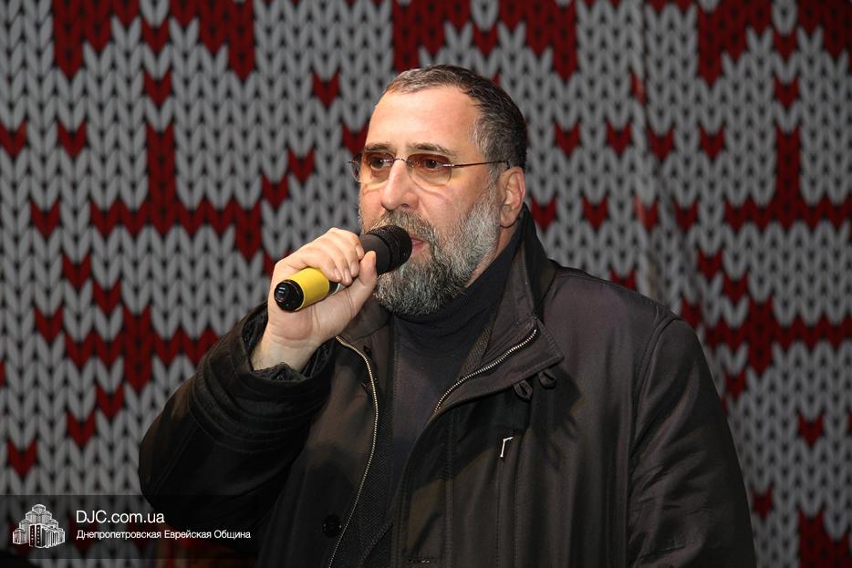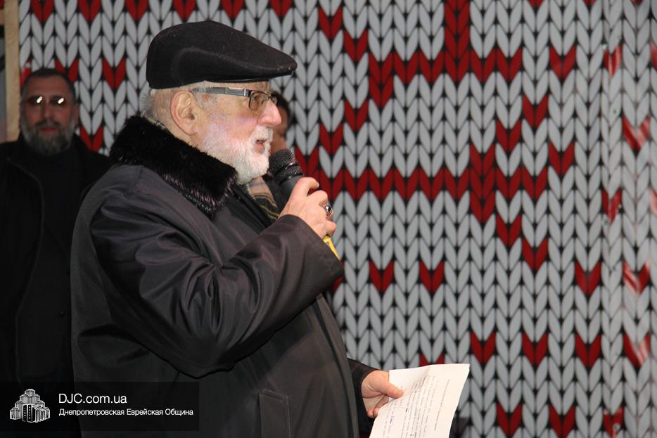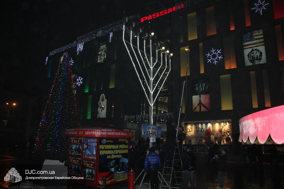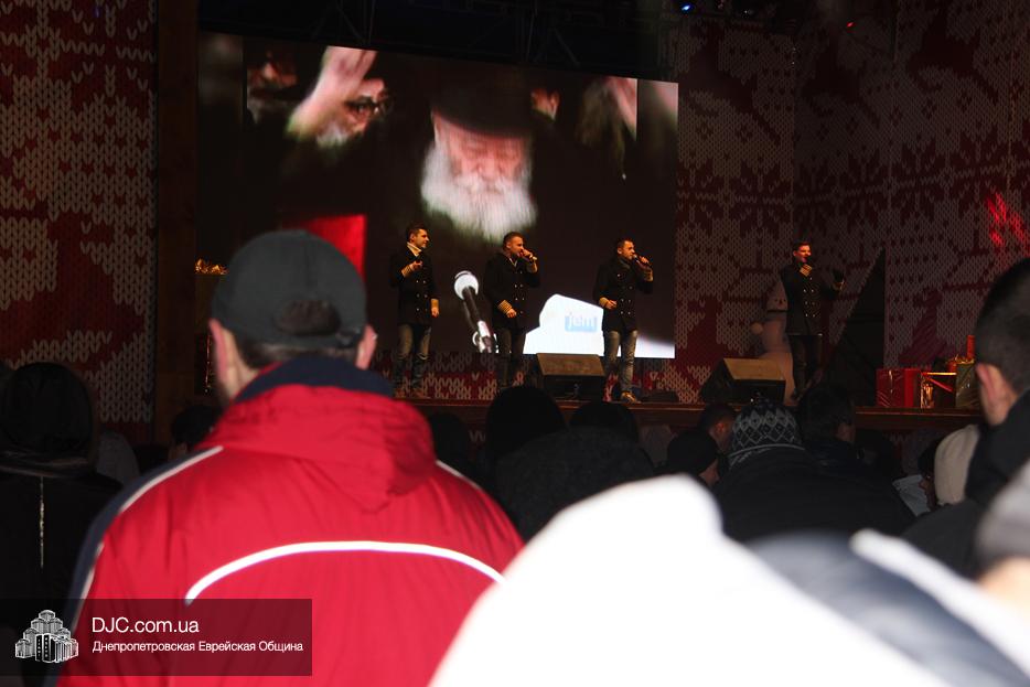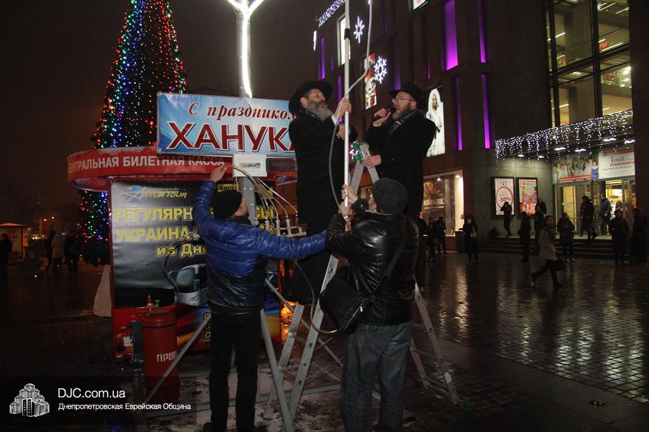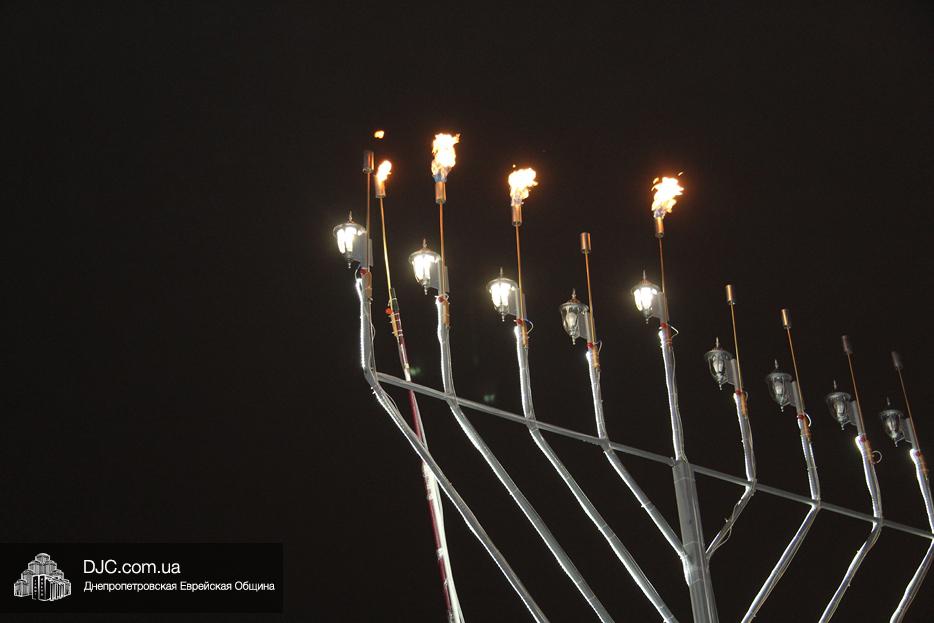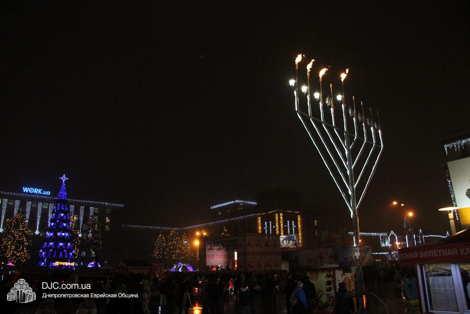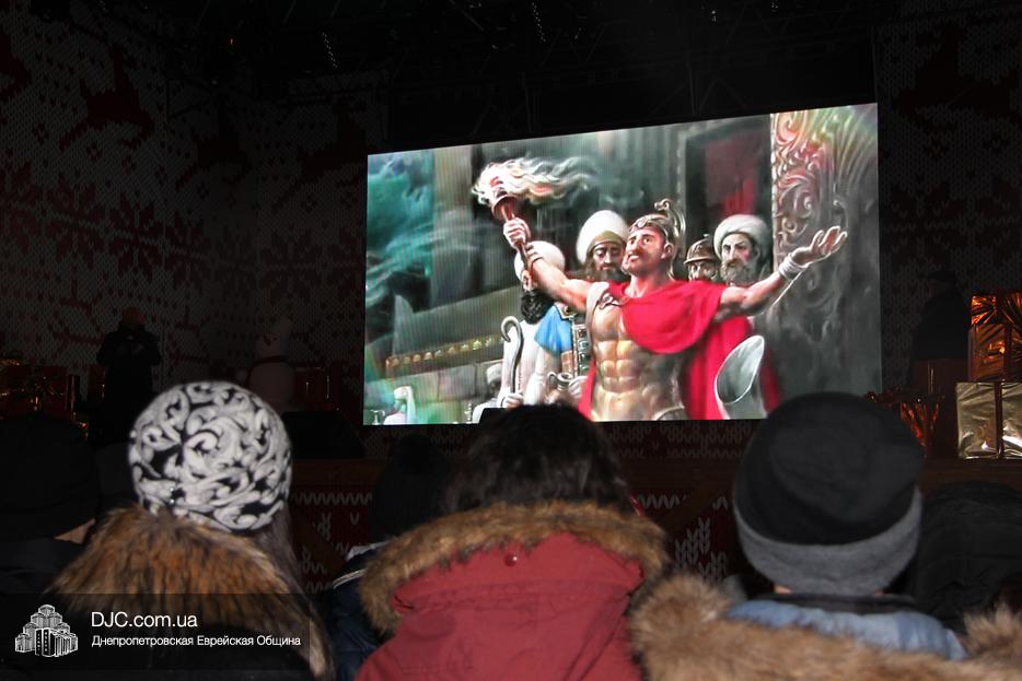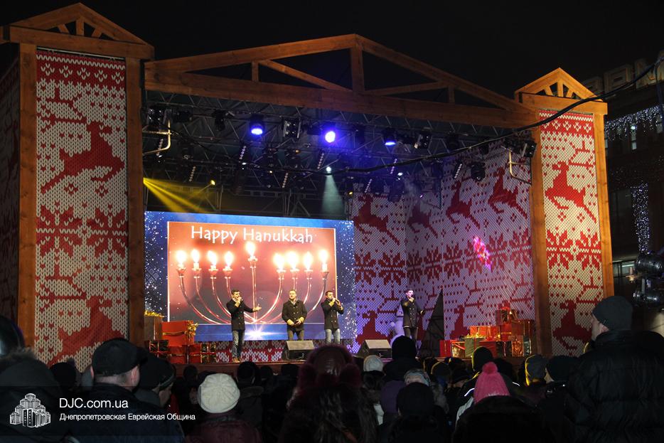 Начало праздника объявил председатель правления «Шиурей Тора Любавич» Дан Макогон, который взял на себя функции ведущего на главной праздничной сцене, затем был показан фрагмент обращения Любавического Ребе о значении Хануки и краткий видеофильм о распространении ее света. Молитву за Украину и ее благополучие прочитал управляющий делами еврейской религиозной общины Александр Фридкис, а советник городского головы, член правления еврейской общины Олег Ростовцев передал поздравления всем евреям и жителям города от имени мэра Днепра Бориса Филатова. Главный раввин Днепра Шмуэль Каминецкий, находящийся на Святой Земле, поздравил общину и днепрян в формате видеообращения.