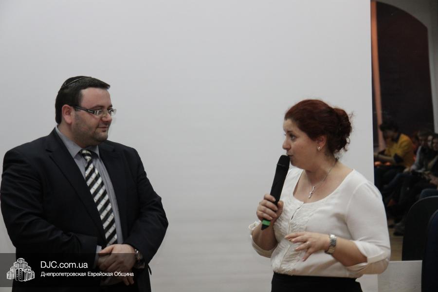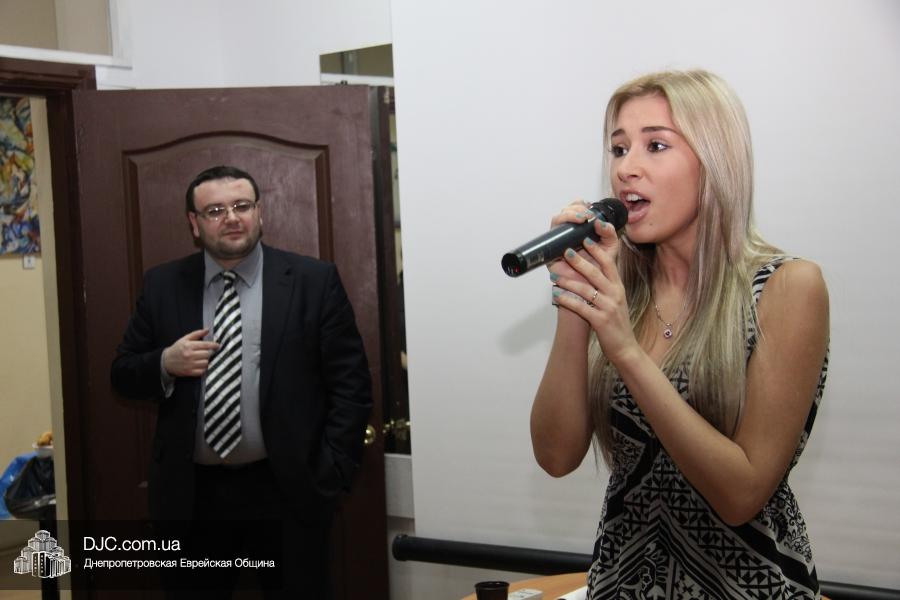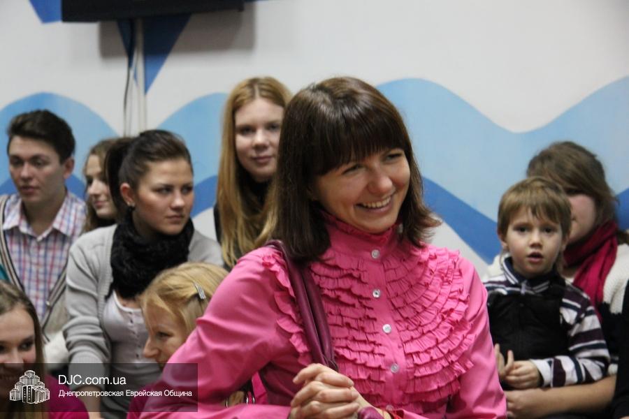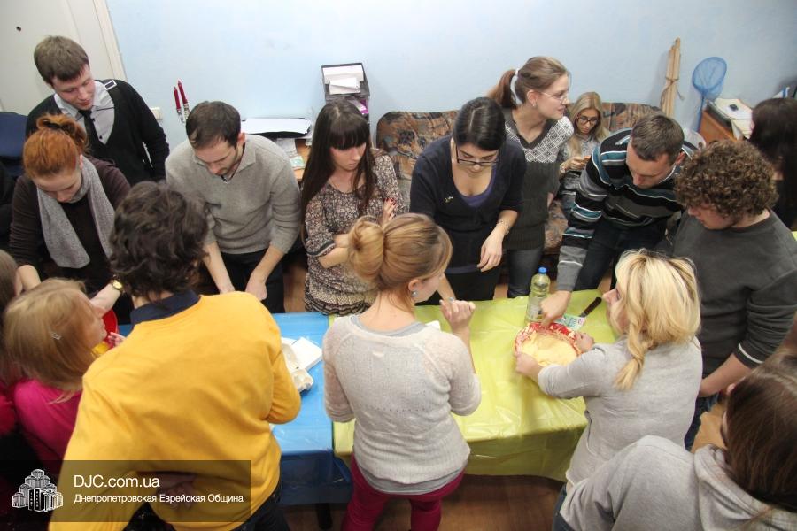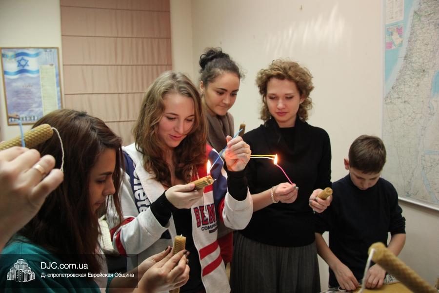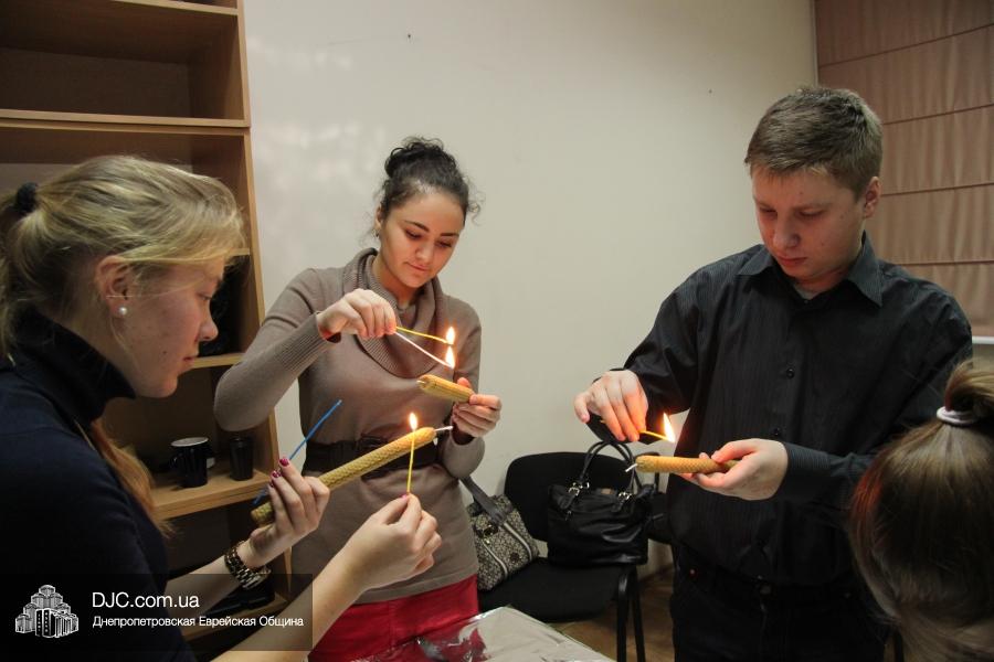 После того, как все свечи были созданы, пончики достаточно подрумянились и промаслились, все собрались в большом зале для общего мероприятия. Нели Шульман, не сдерживая эмоций, рассказала о грядущих в самом ближайшем будущем изменениях и выразила надежду, что обязательно очень надеется на встречу с каждым из тех, кто находится сейчас в зале. В завершение она представила того кто будет теперь курировать деятельность Израильского Центра из Киева — второго секретаря Посольства государства Израиль в Украине Давида Мамиствалова, который тепло поприветствовал собравшихся ребят, пообещав продолжать все культурные и академические программы, работать со сложившимся коллективом и обеспечить не только не сокращение деятельности, но и наоборот ее расцвет.