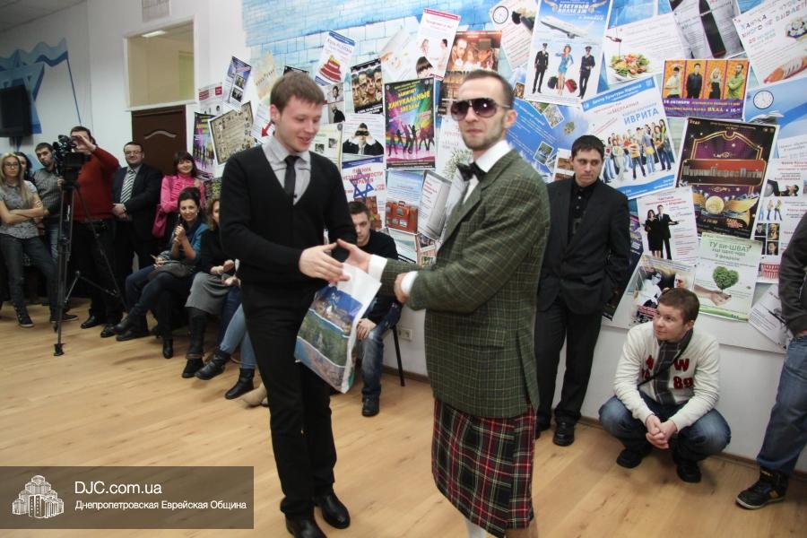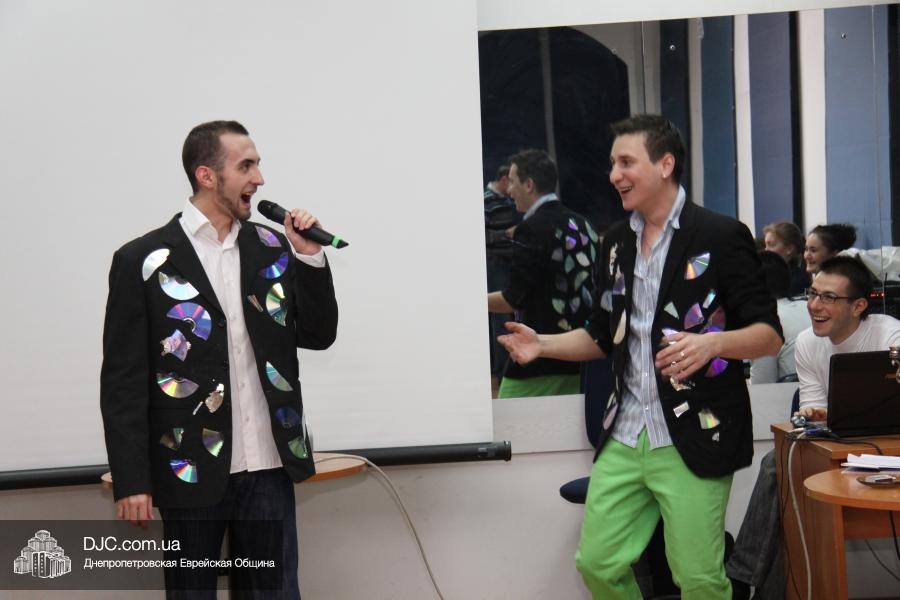 Далее постоянные ведущие молодежных вечеринок Стас Прошутя и Сергей Сачковский начали ностольгически-ханукальную программу, состоящую из их «хитов» последних лет (кстати, не исключено, что это последнее выступление творческого тандема – Стас Прошутя уезжает в Киев, где будет координировать работу ИКЦ регионов, а Сергей Сачковский, по всей видимости, возглавит переформатированное ИКЦ). Стилистика подготовленных ими праздников последних лет была тщательно выдержана – начали с программной «Y.M.C.A.» группы Village People, а завершили «Show Must Go On», но не в каноническом исполнении Queen, а в интерпретации одного из «Санков Деда», а между ними нашлось место и для поиска «половины пончика» и для песни знатной «аллилуйщицы» Марии Скабалланович, и для многих других фирменных «фишек» (ну разве что вновь не собралась «ГруппаУха»).