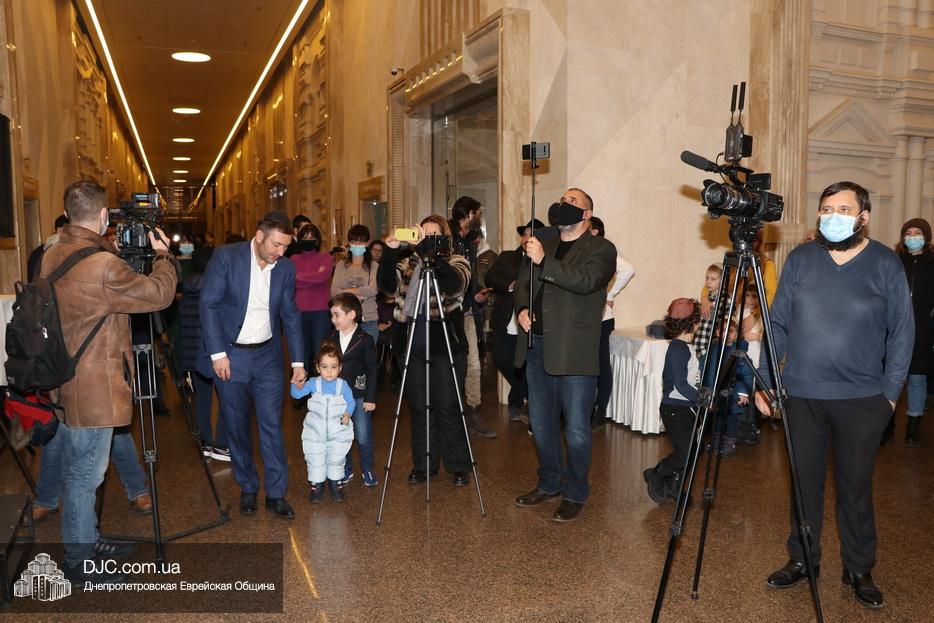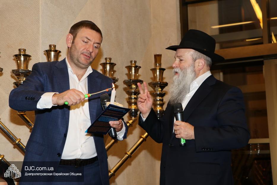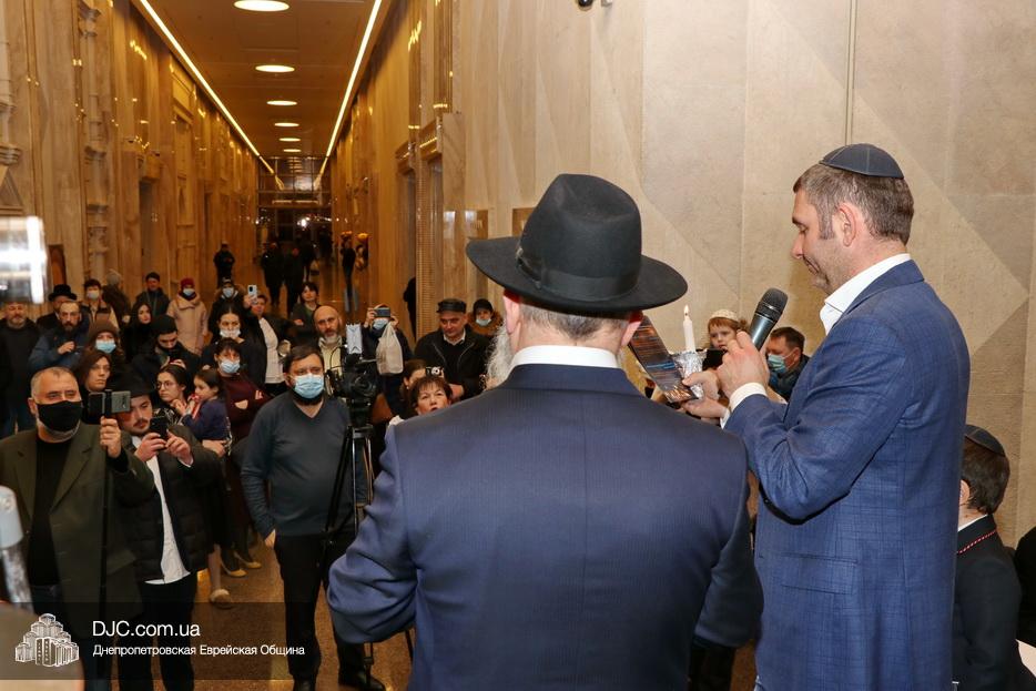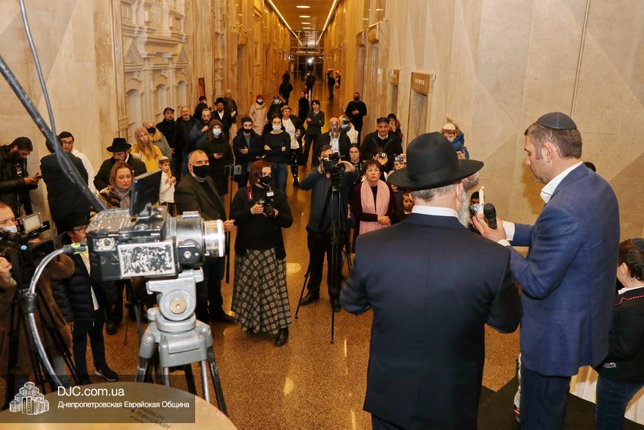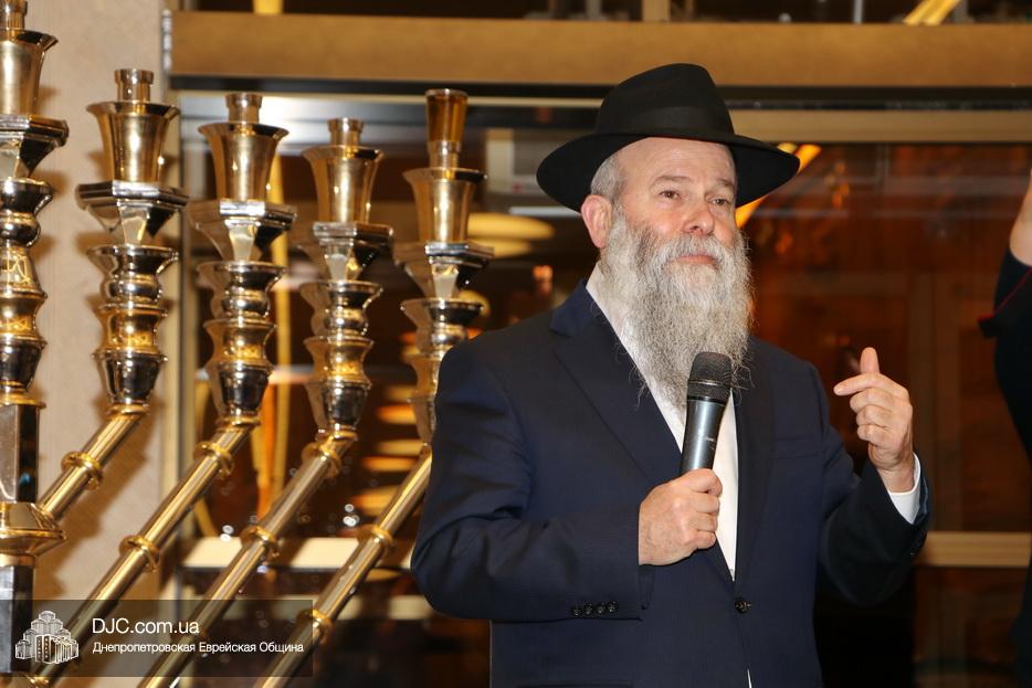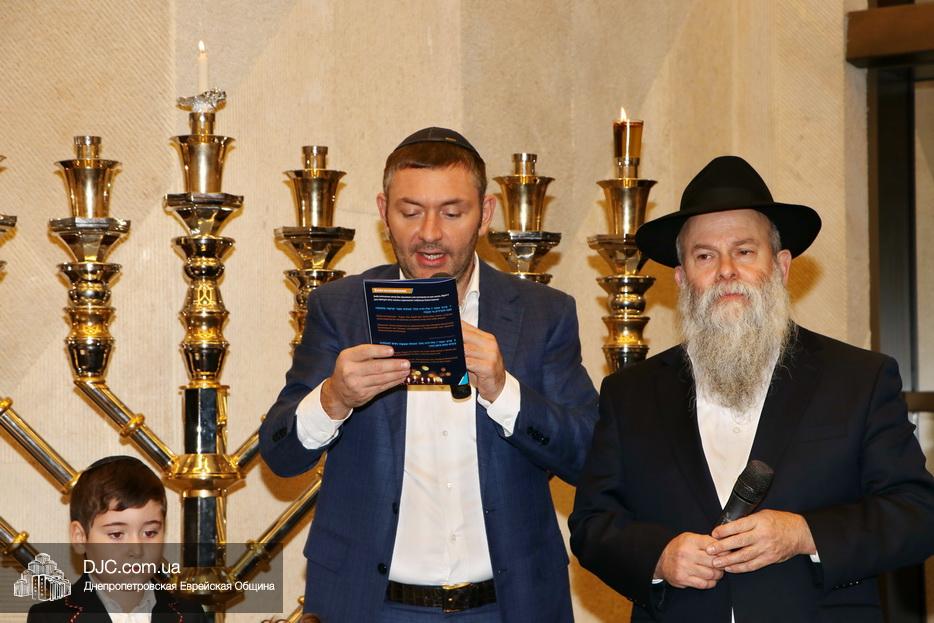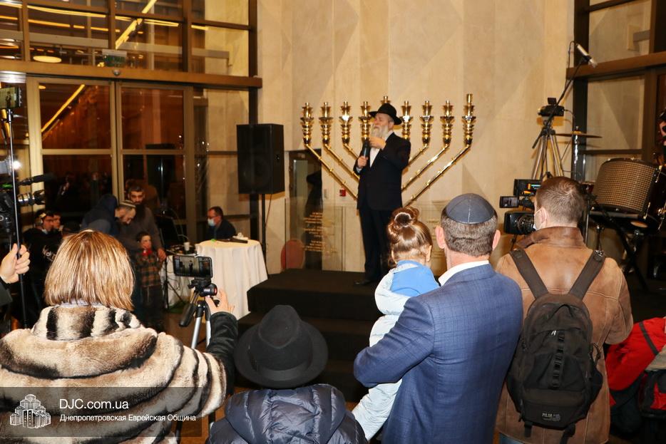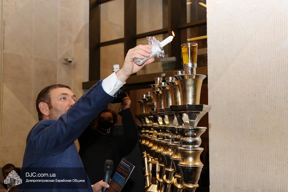 В связи с пандемией COVID-19 церемония проходила в условиях повышенных мер медико-санитарной безопасности, в очень ограниченном формате. С поздравлением к общине обратился Главный раввин Днепра и региона Шмуэль Каминецкий, который представил того, кому предоставляется честь открыть праздник Ханука 5781 года и зажечь первую свечу – члену Попечительского Совета еврейской общины Днепра и президенту Фонда «Шиурей Тора Любавич» Натану Золотаревскому.