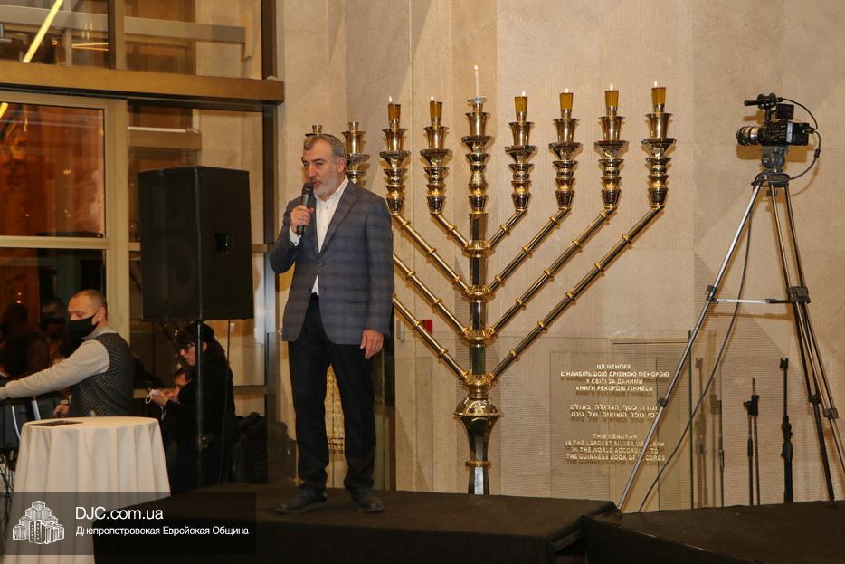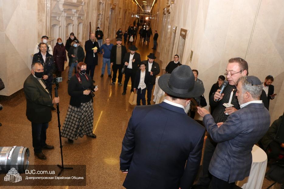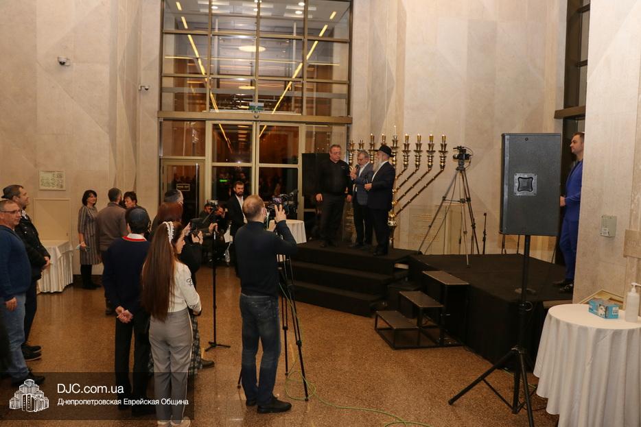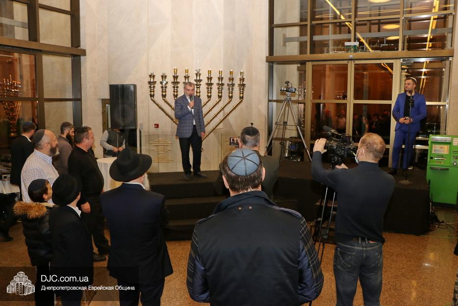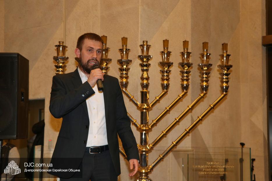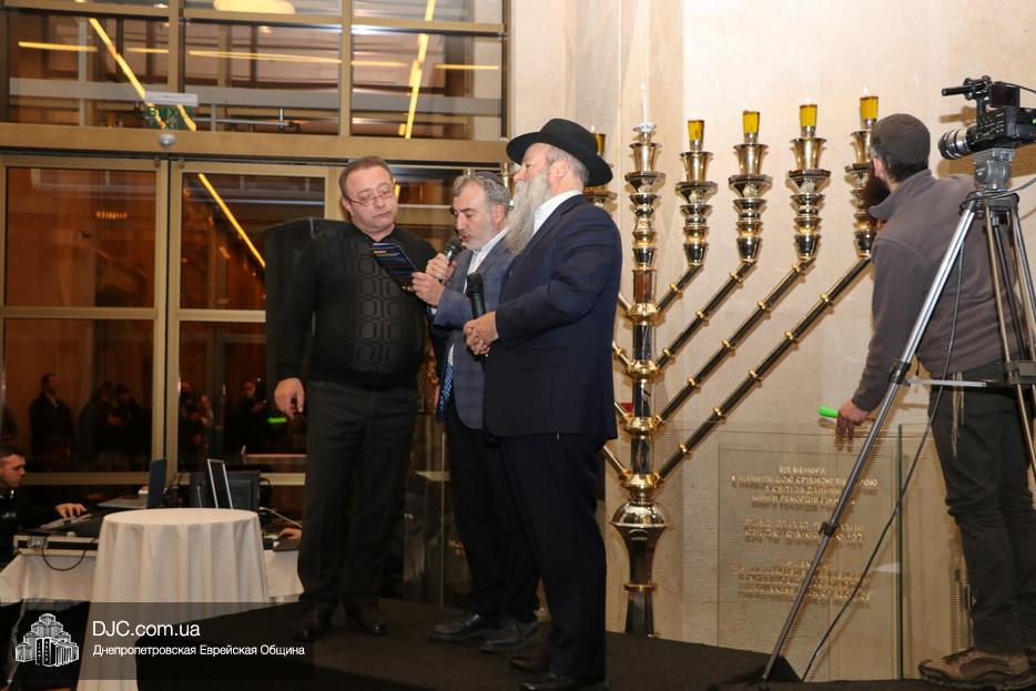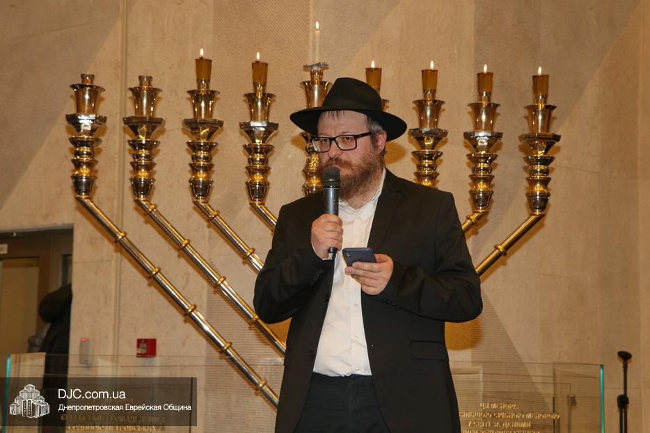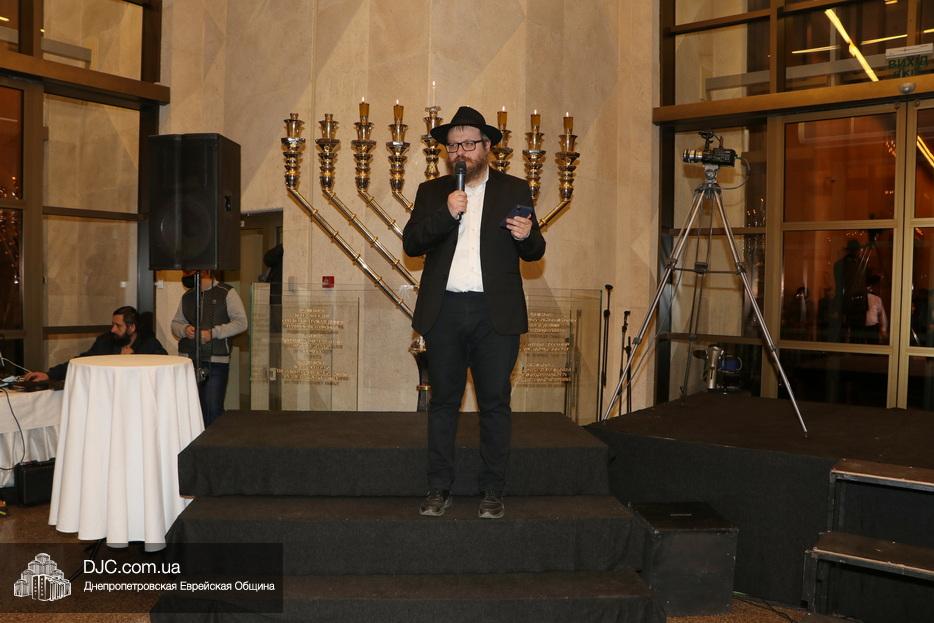 После зажжения ханукий с соответствующими благословениями, к еврейской общине Днепра обратился Леви (Евгений) Шаринов, а затем ханукальный урок провел раввин Мойше Листенгурт.