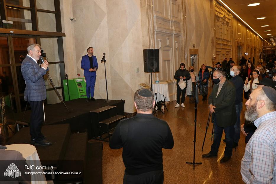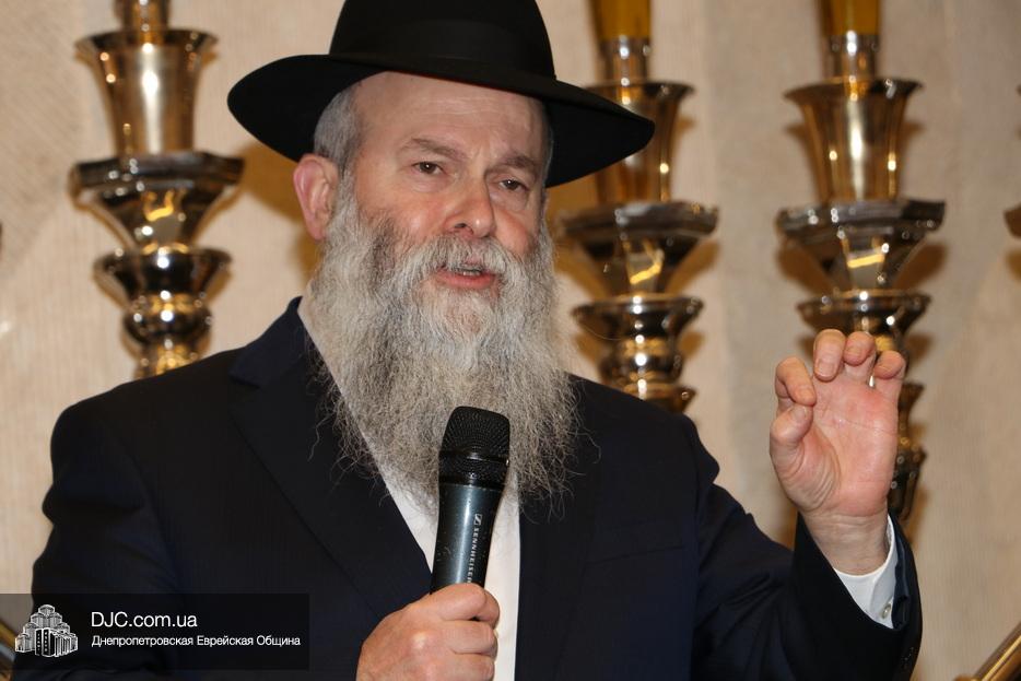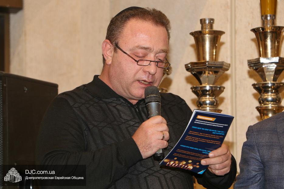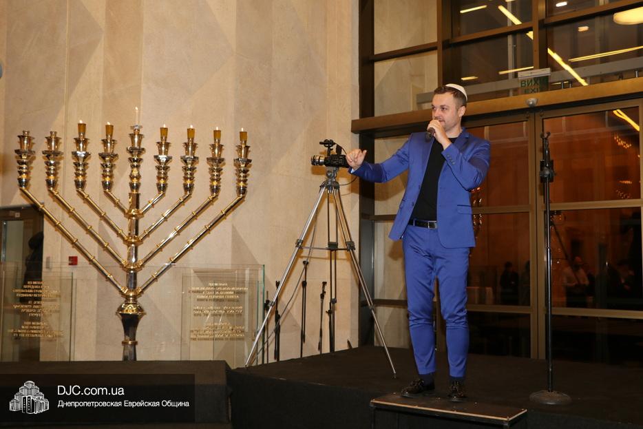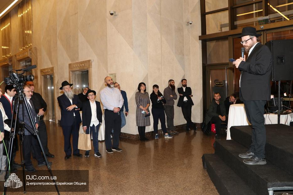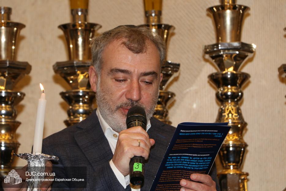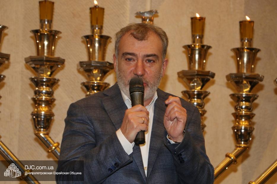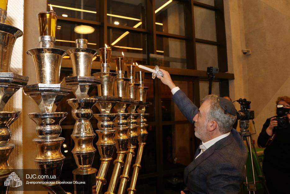 После зажжения ханукий с соответствующими благословениями, к еврейской общине Днепра обратился Леви (Евгений) Шаринов, а затем ханукальный урок провел раввин Мойше Листенгурт.