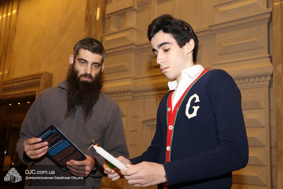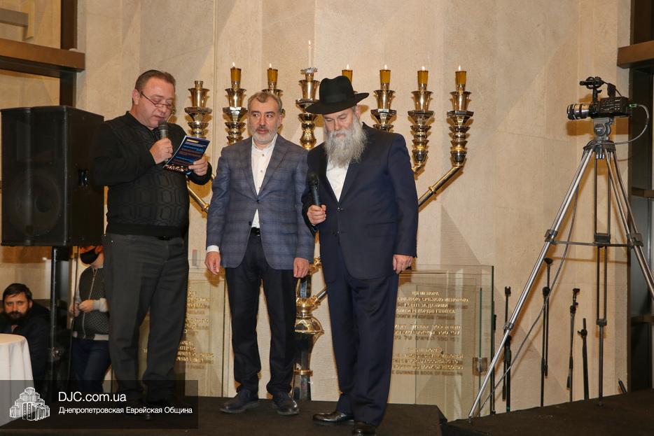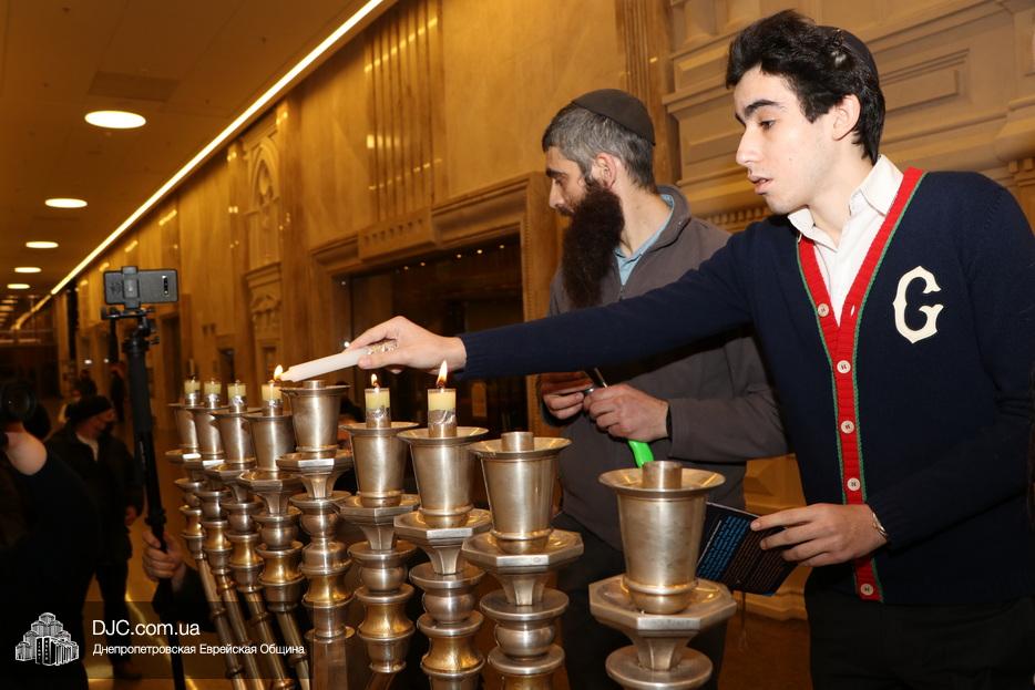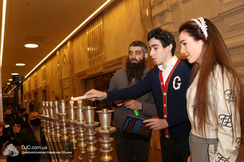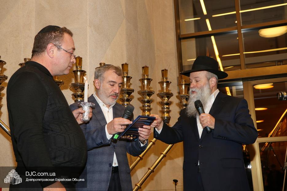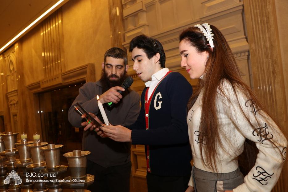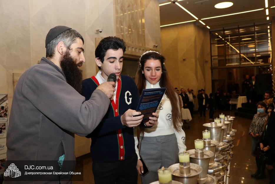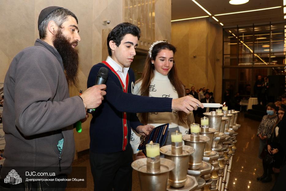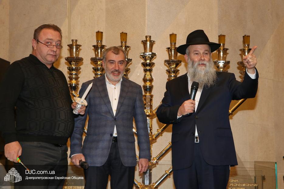 Главный раввин Днепра и региона Шмуэль Каминецкий пригласил зажечь свечи шестого вечера праздника Ханука на Главной ханукие членов Попечительского совета еврейской общины Леви (Евгения) Шаринова и Ицхака (Евгения) Двериса, а на Малой ханукие – подрастающее поколение молодых лидеров общины Михаэля и Рену Шариновых.